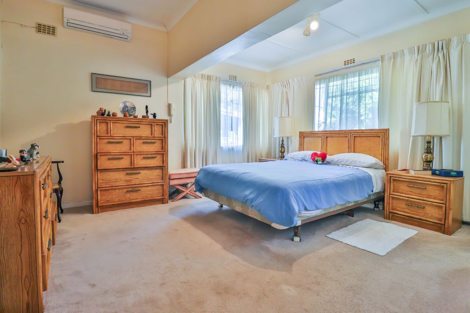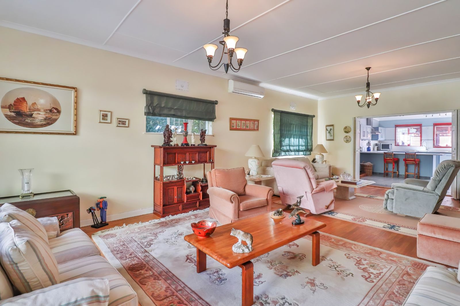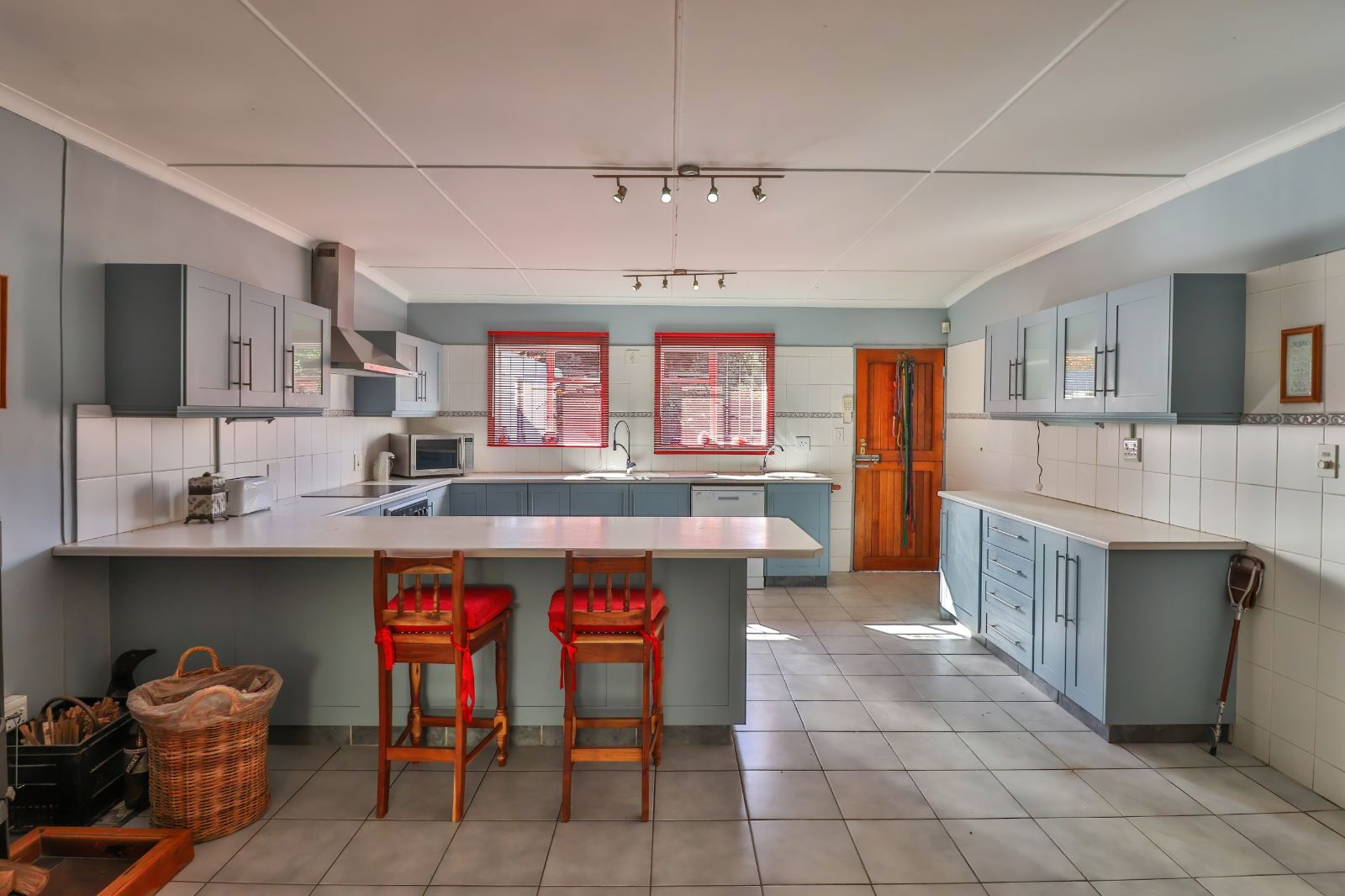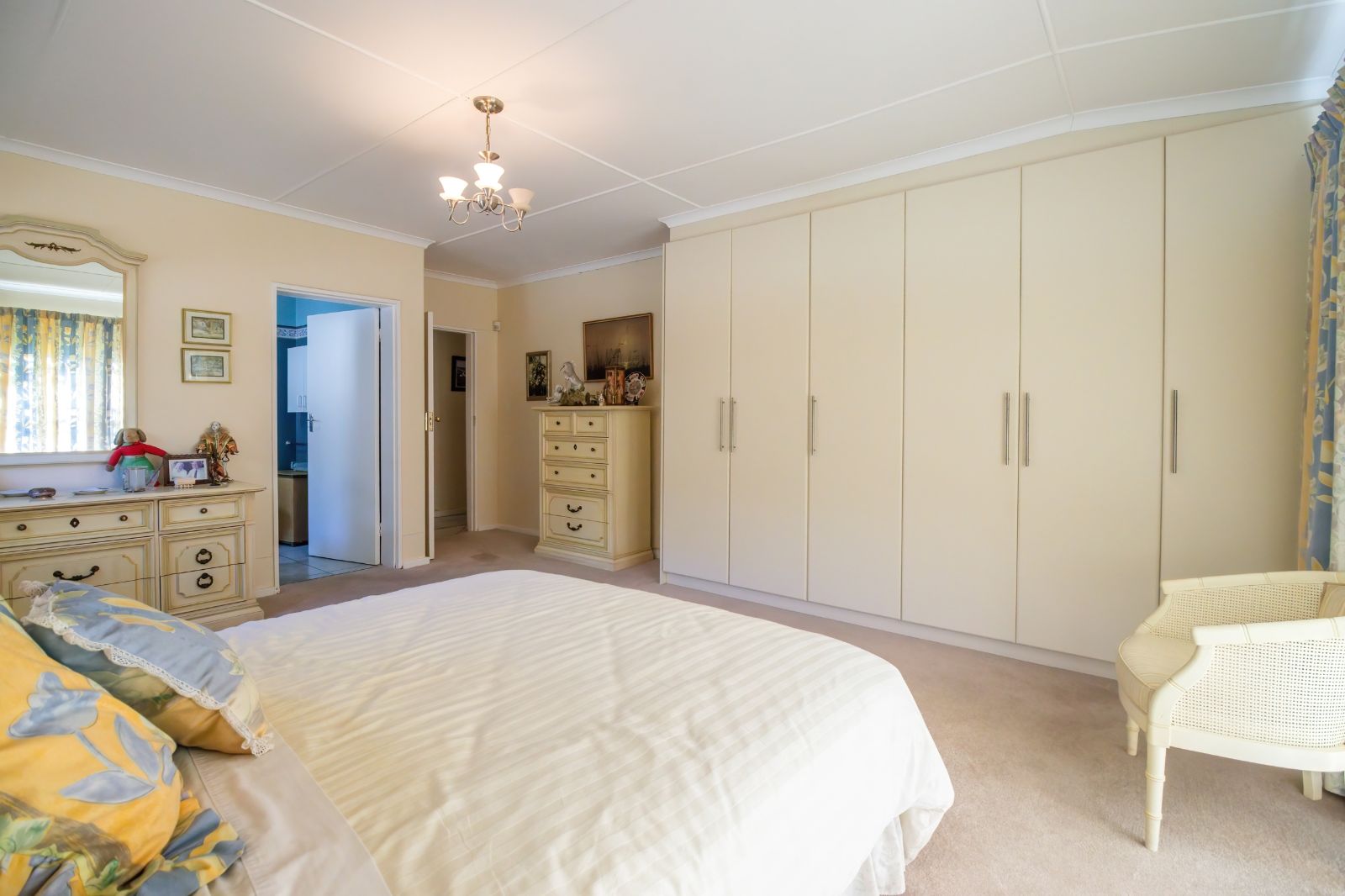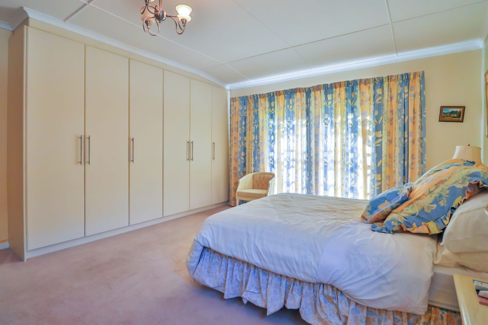When entering through the automated gate, you are welcomed by a covered patio that leads to your living room. The kitchen is equipped with ample cupboard space, a built in fire place, built in oven, hub and extractor fan, as well as an air-conditioner. It is conveniently situated next to the dining room, creating an easy flow.
