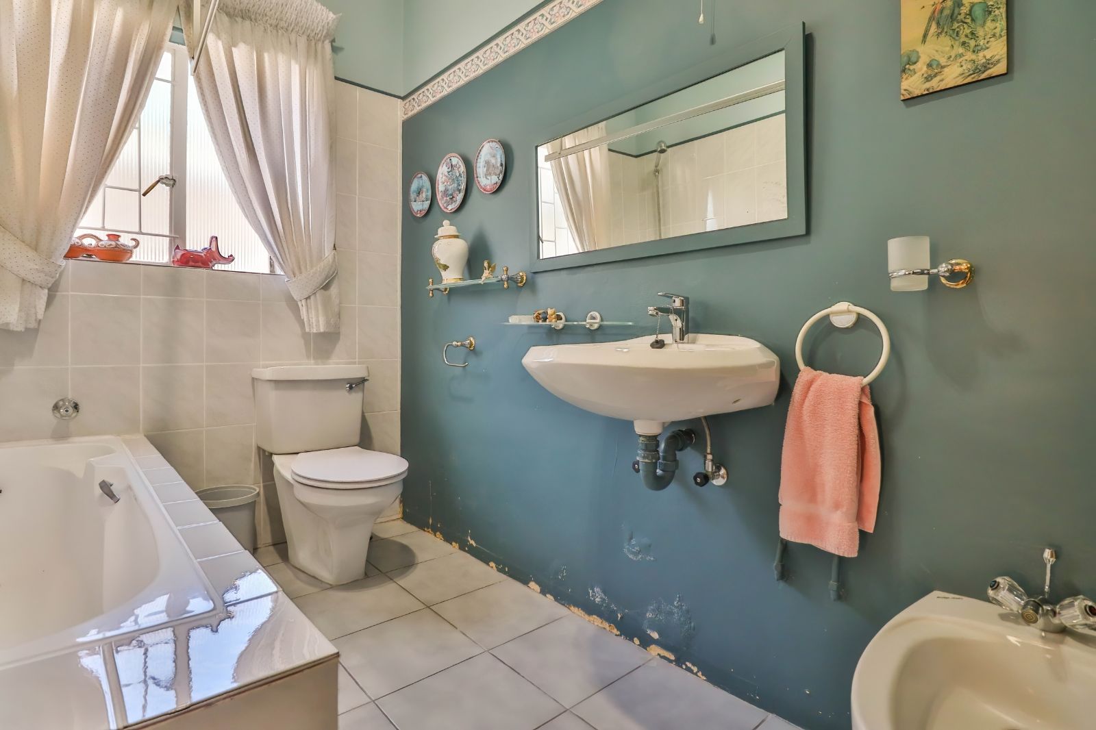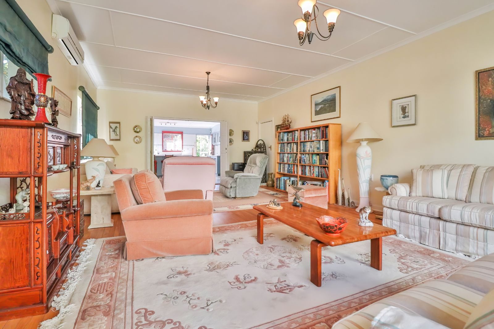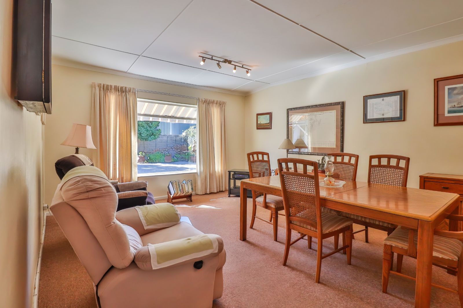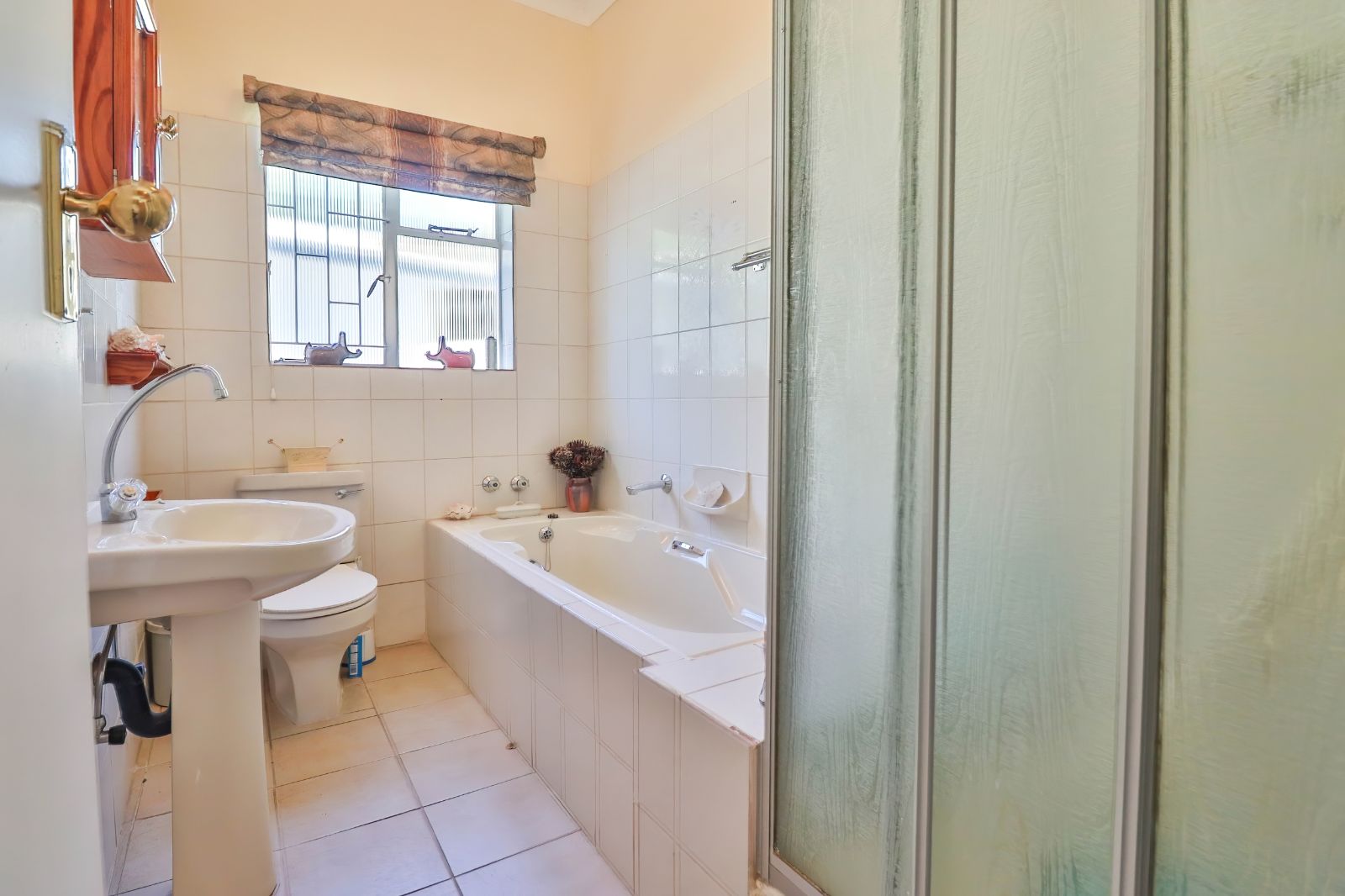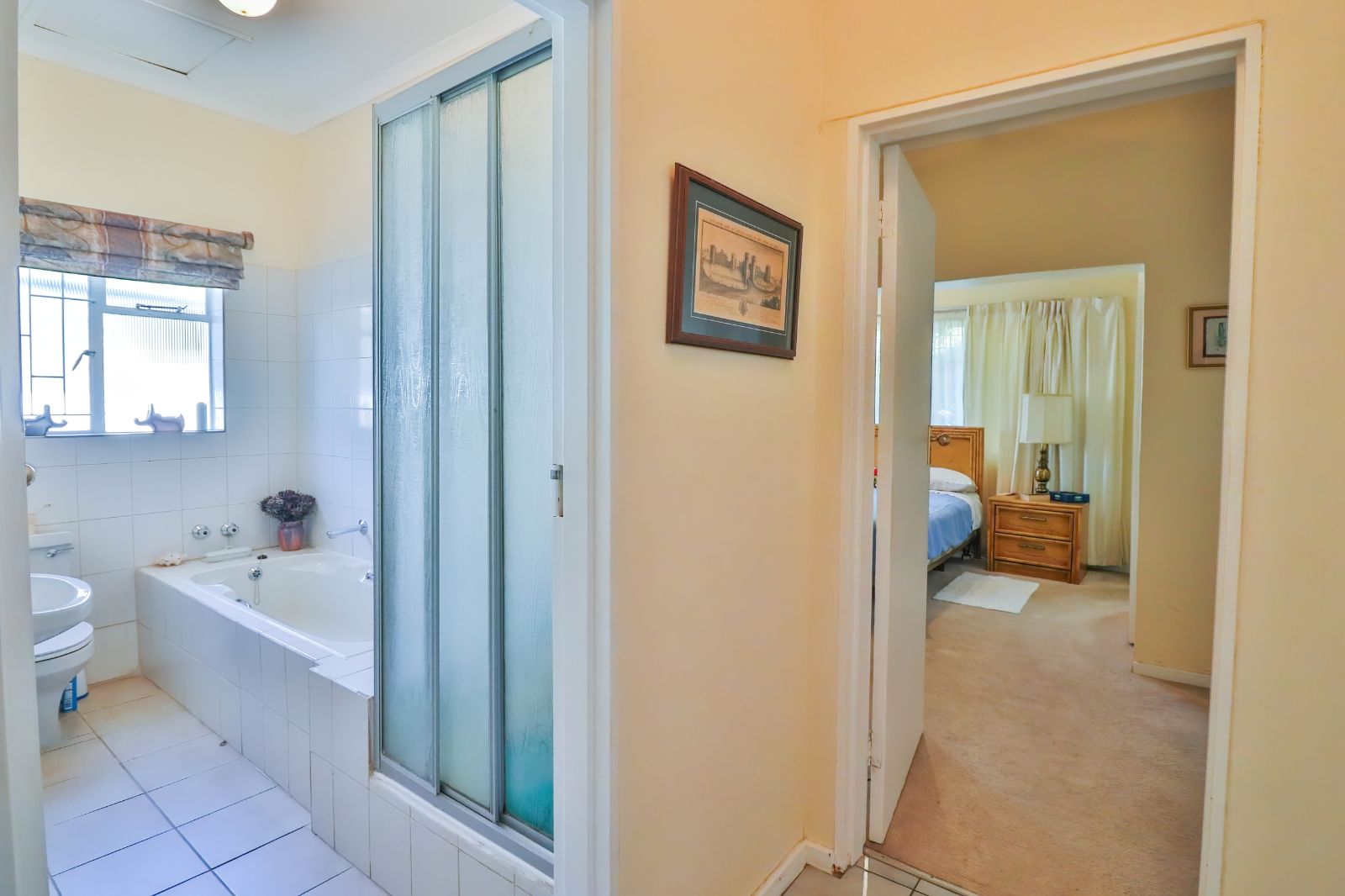 When entering through the automated gate, you are welcomed by a covered patio that leads to your living room. The kitchen is equipped with ample cupboard space, a built in fire place, built in oven, hub and extractor fan, as well as an air-conditioner. It is conveniently situated next to the dining room, creating an easy flow.