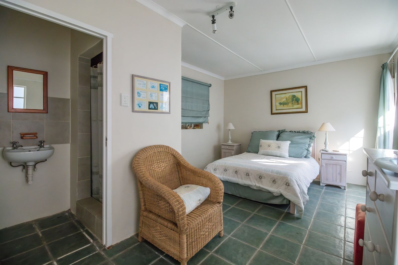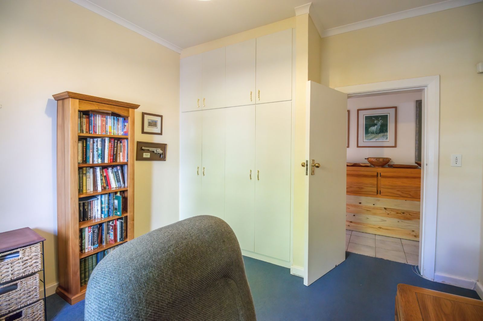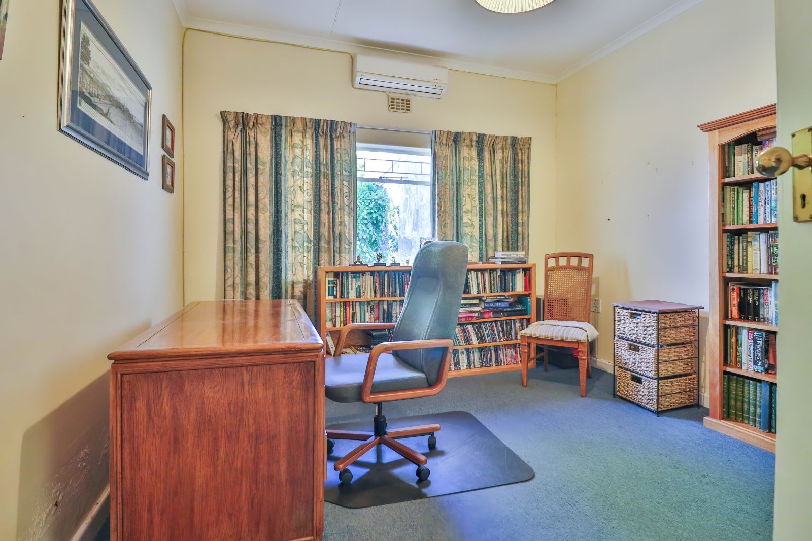 2 Bedrooms each boast an en-suite bathroom, built in cupboards and air-conditioning. One of these bedrooms open up to the beautiful back garden. The third bedroom has been converted into an office and is served by its own full family bathroom.