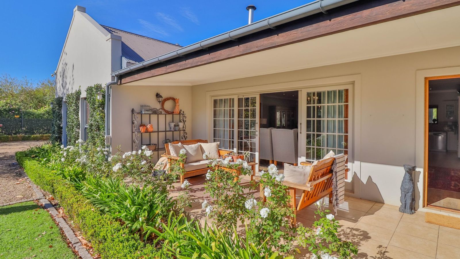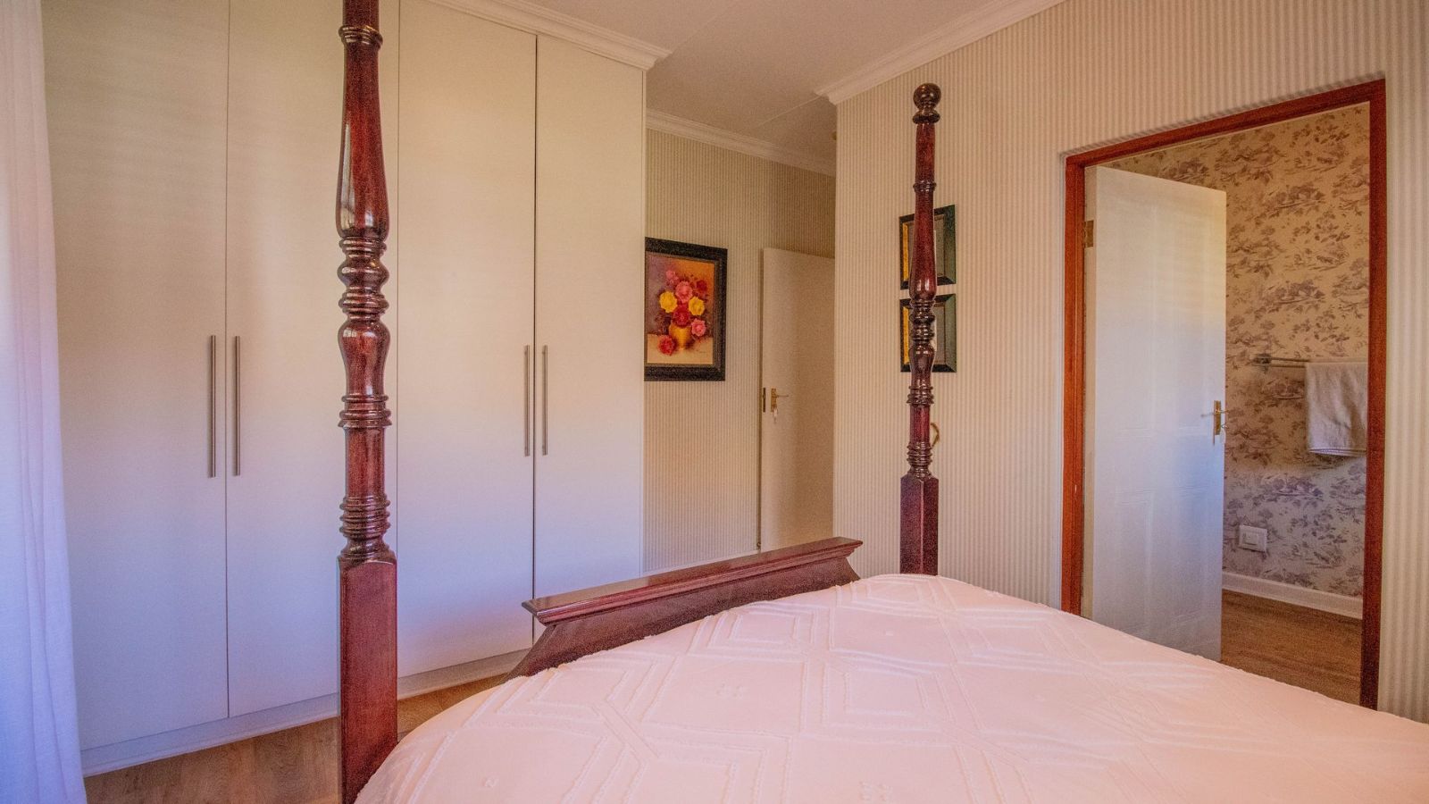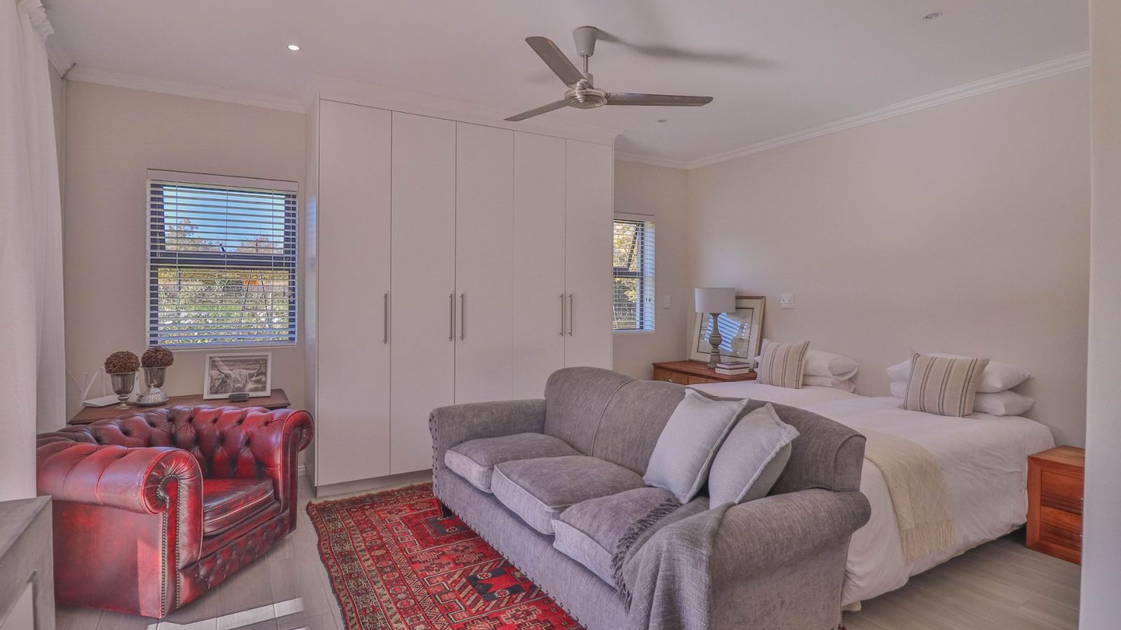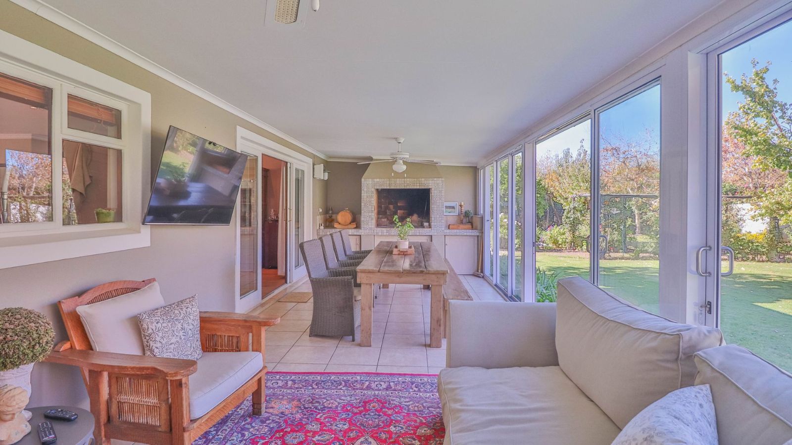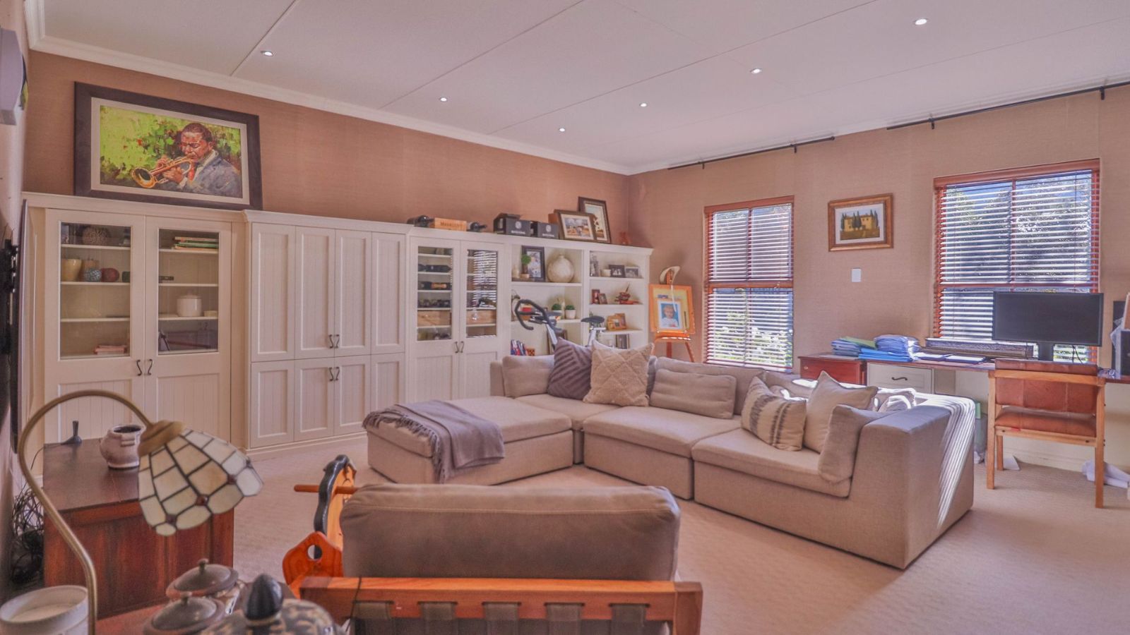You are welcomed by a sunny, warm covered patio that leads to the free flowing, open plan family room, dining area and kitchen with a breakfast nook, ample cupboard space, work space, a separate pantry and scullery. The main dwelling boasts 3 bedrooms, each with an en-suite bathroom and built in cupboards. The study is spacious with built in cupboards, and a guest restroom serves all your visitors. An alluring, covered entertainment area with a built in braai overlooks the garden and swimming pool.