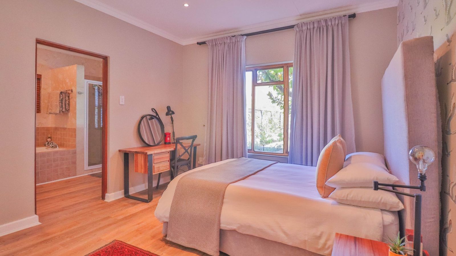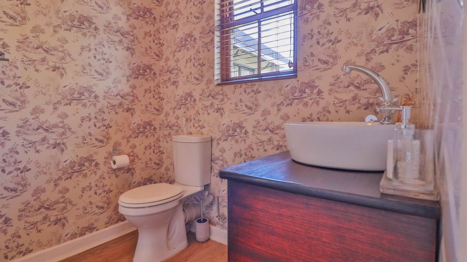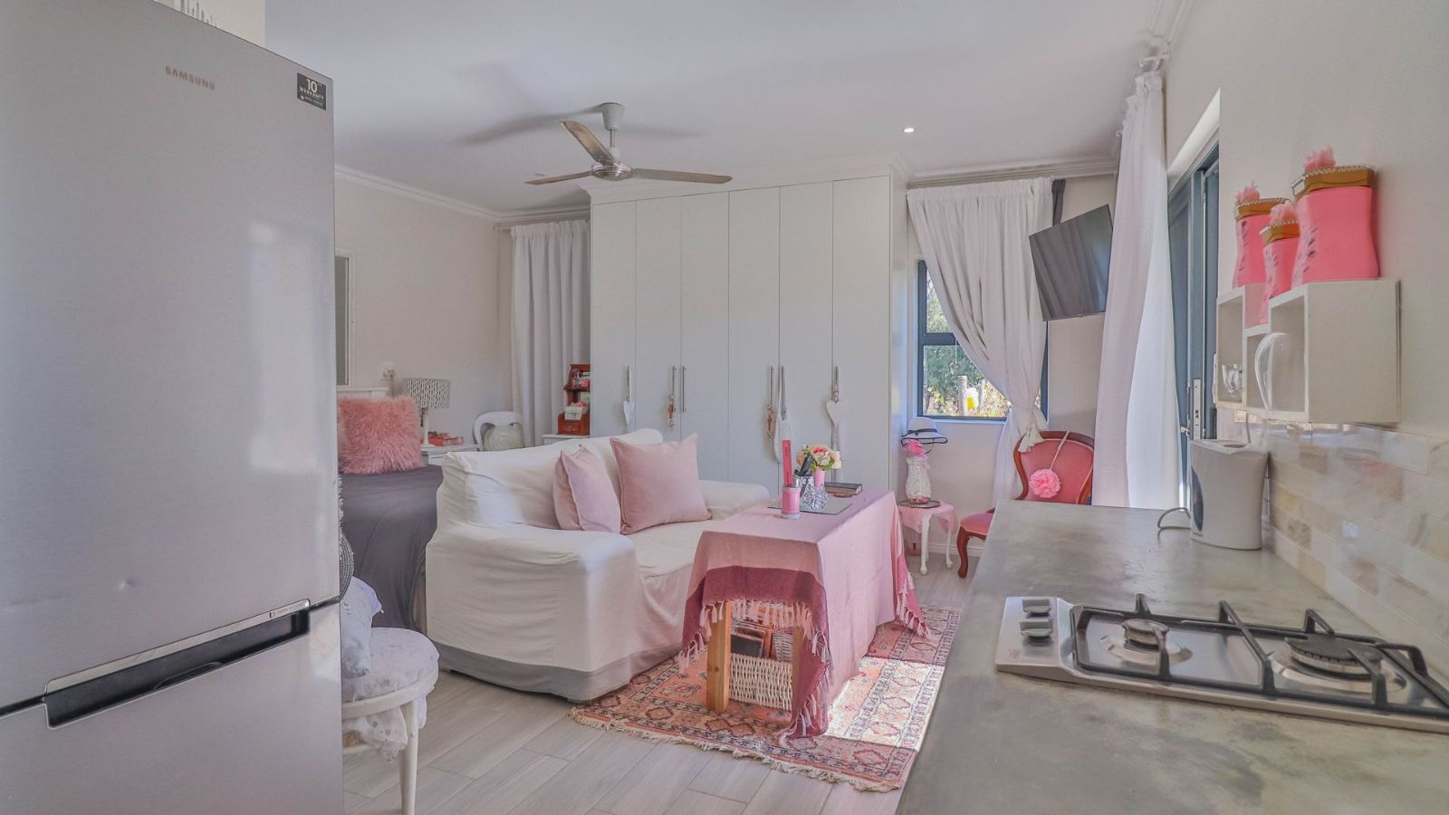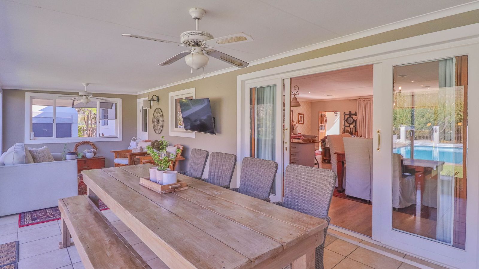 You are welcomed by a sunny, warm covered patio that leads to the free flowing, open plan family room, dining area and kitchen with a breakfast nook, ample cupboard space, work space, a separate pantry and scullery. The main dwelling boasts 3 bedrooms, each with an en-suite bathroom and built in cupboards. The study is spacious with built in cupboards, and a guest restroom serves all your visitors. An alluring, covered entertainment area with a built in braai overlooks the garden and swimming pool.