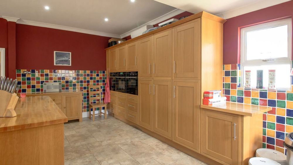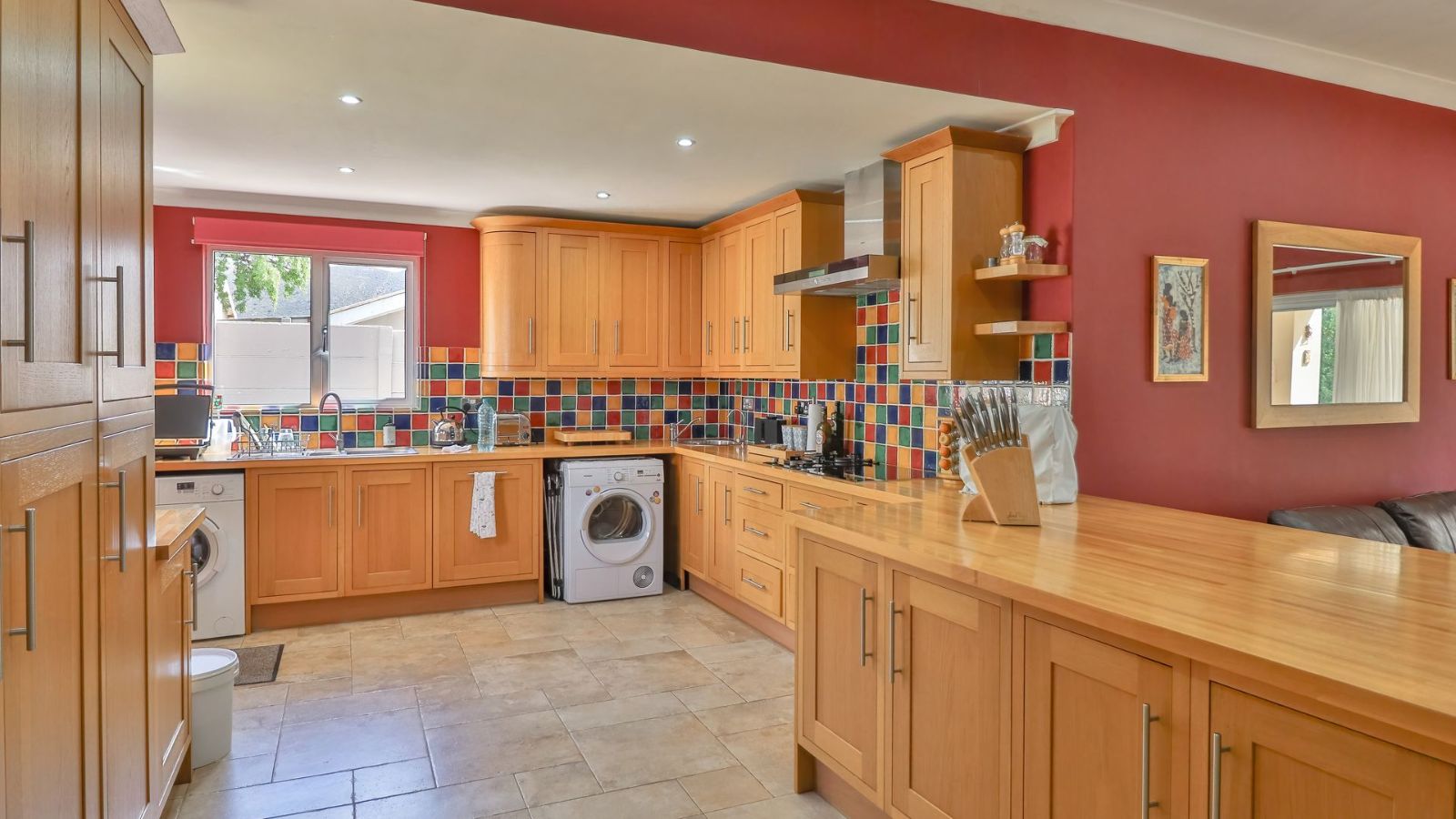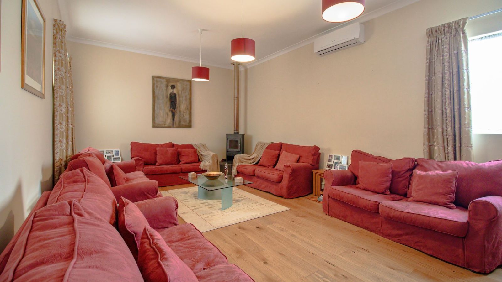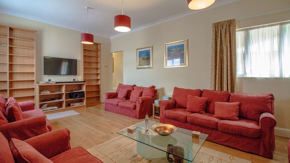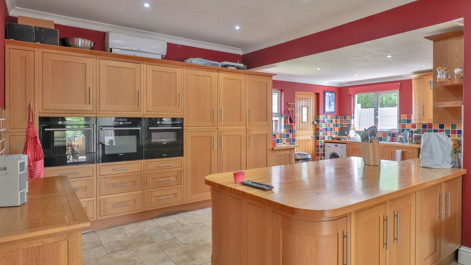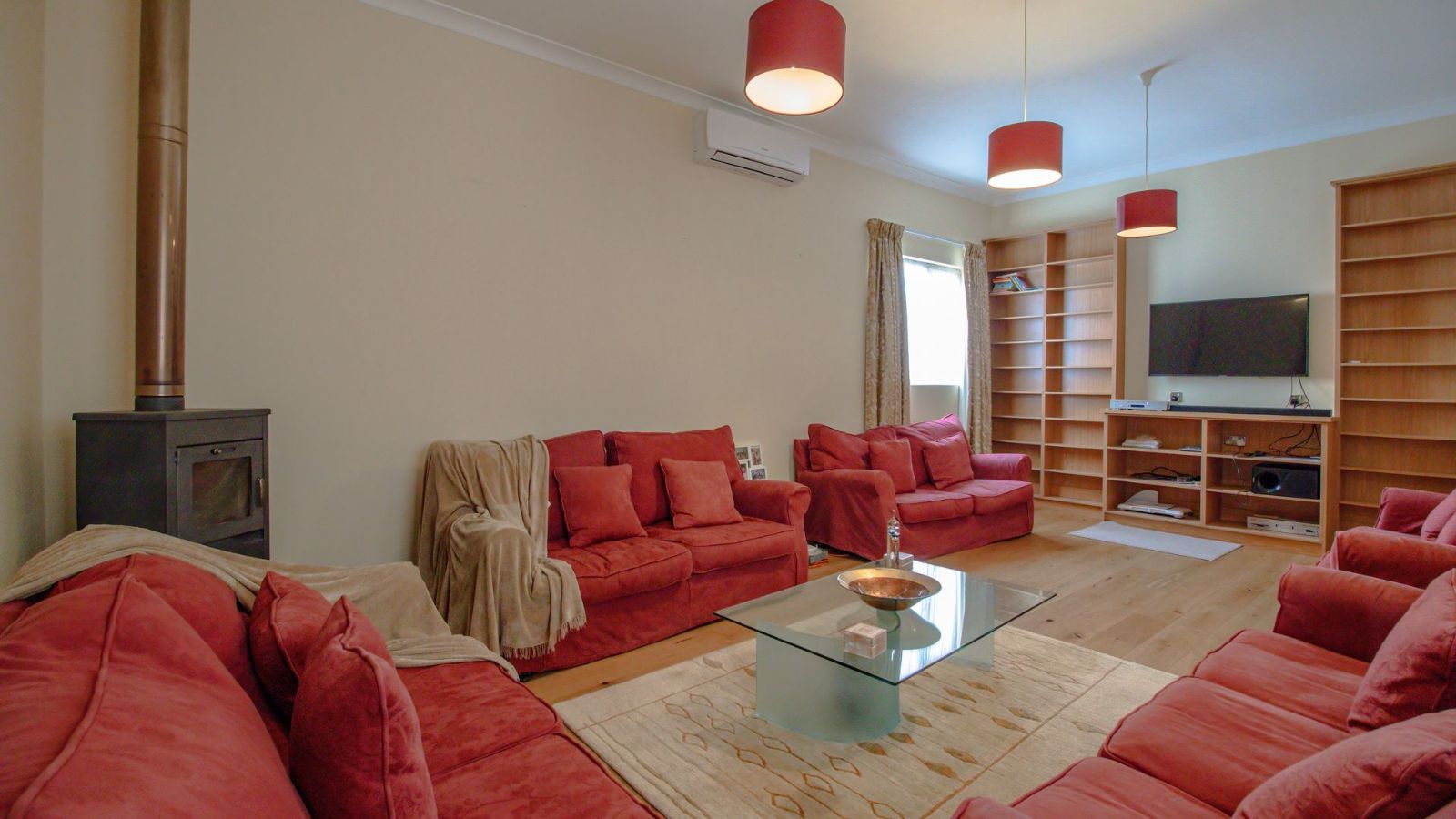 The open plan dining area, family room and kitchen is a sight to behold! The practical gourmet kitchen with attention to detail boast with ample work surface and a multitude of drawers and cupboards. Air-conditioning, eye-level ovens, a built-in washing machine, and a fitted fridge and freezer are neatly tucked away in kitchen cupboards for your convenience. A separate, large lounge features built-in shelves, a fireplace and air-conditioning.