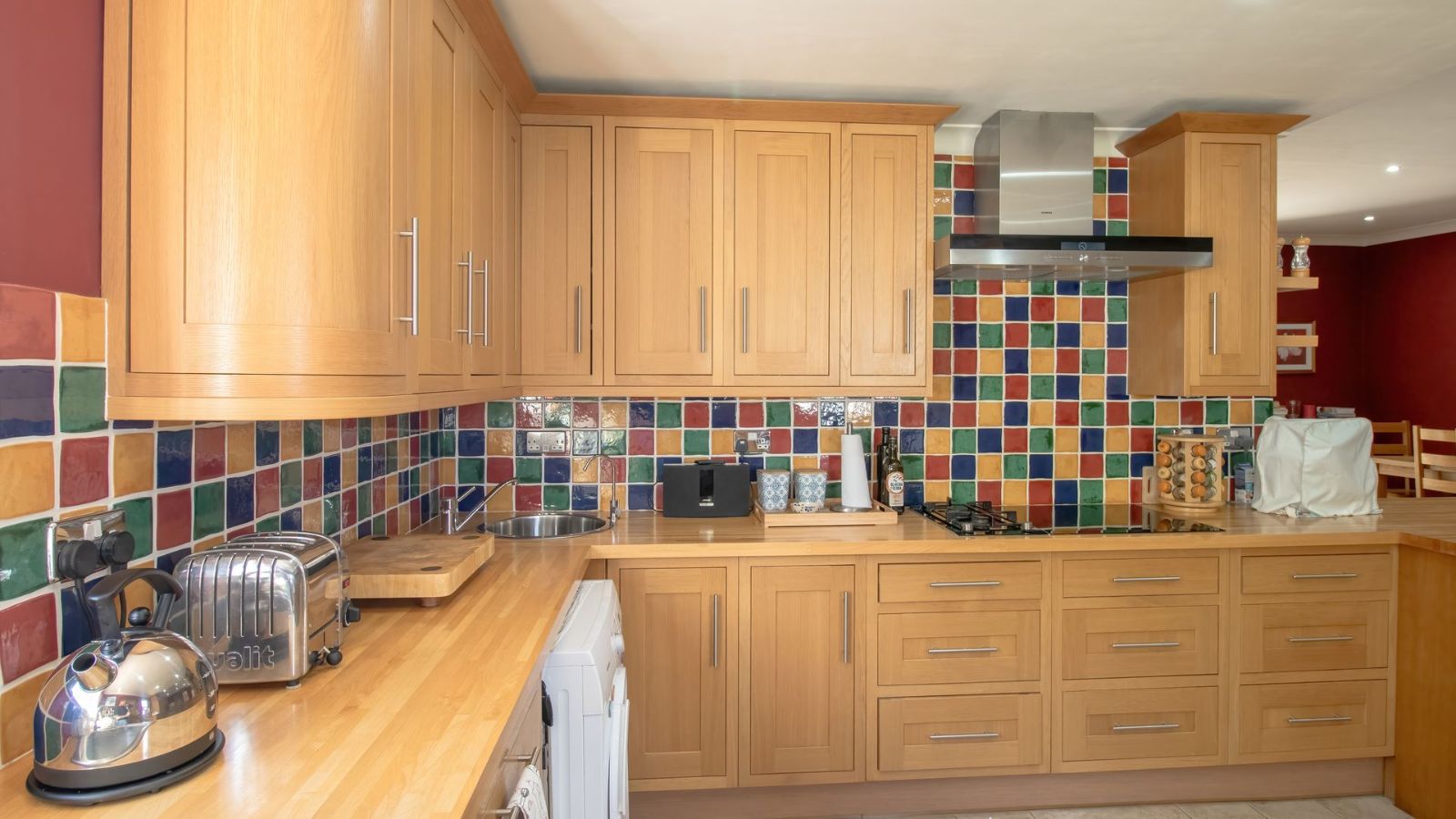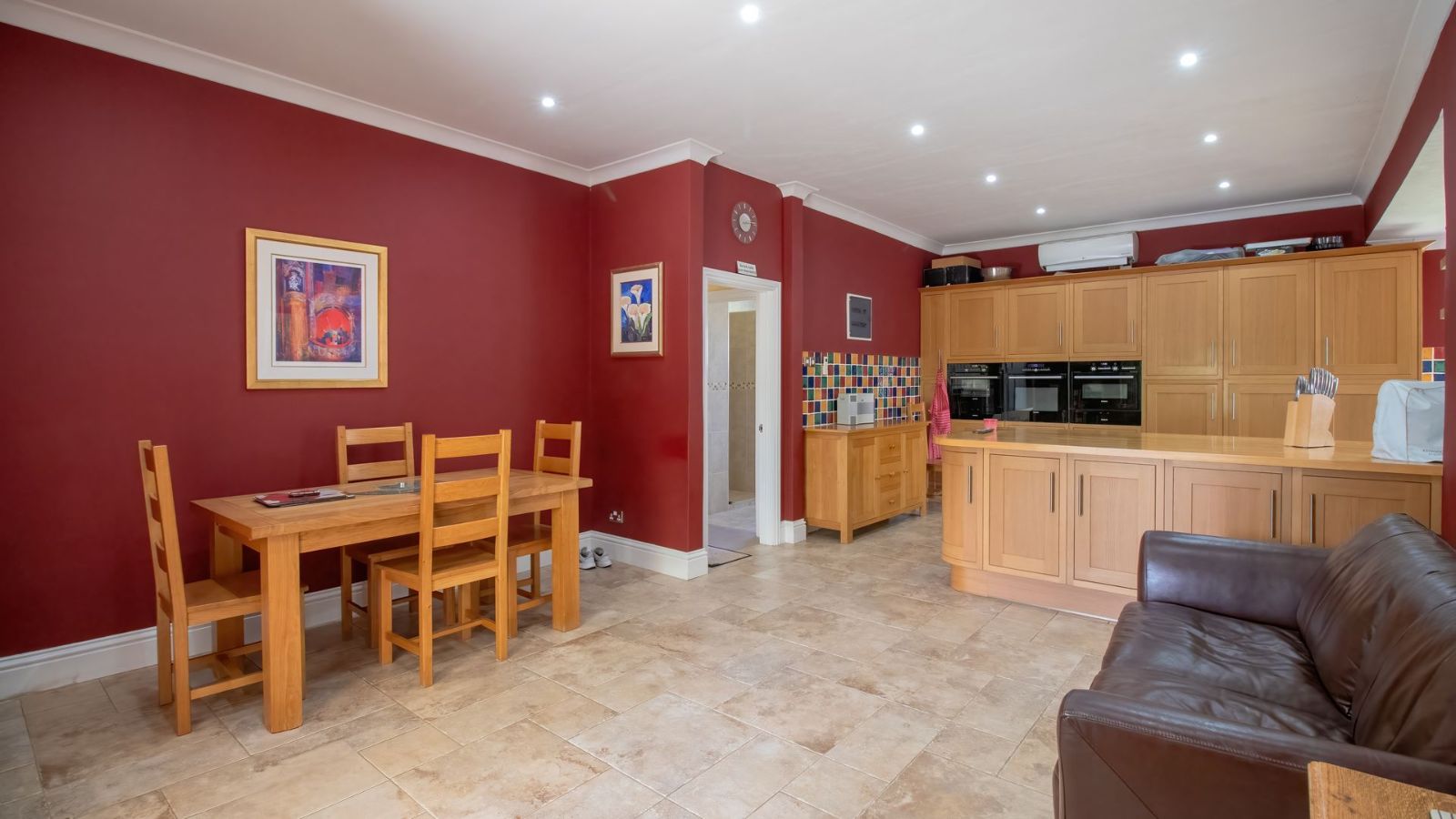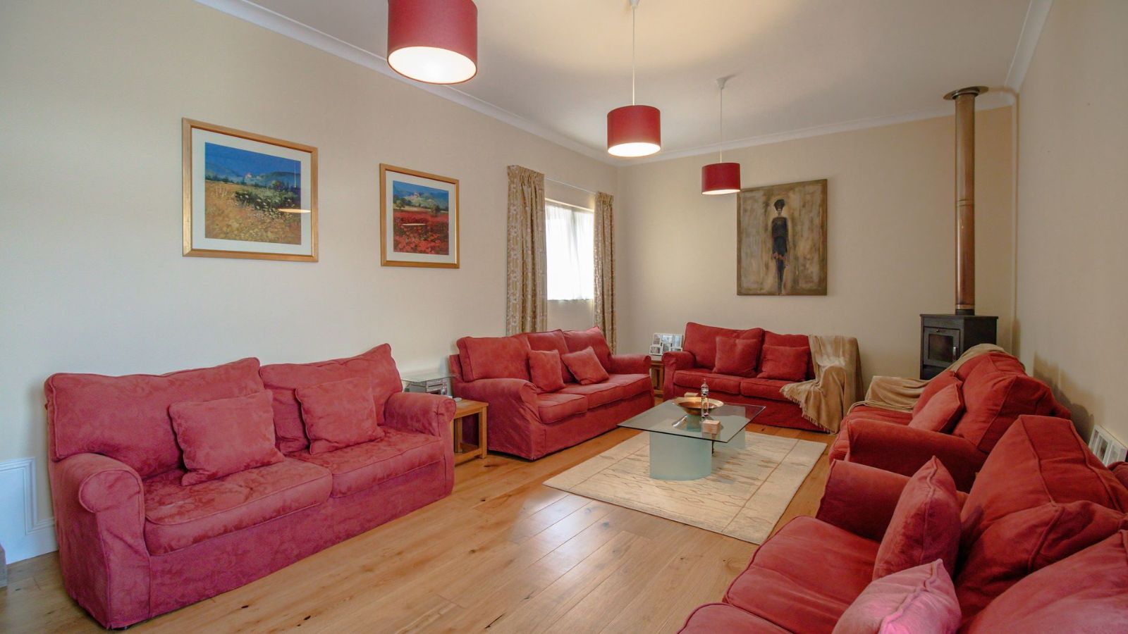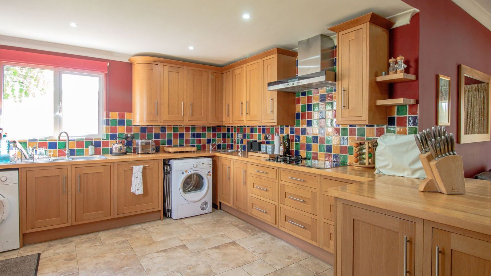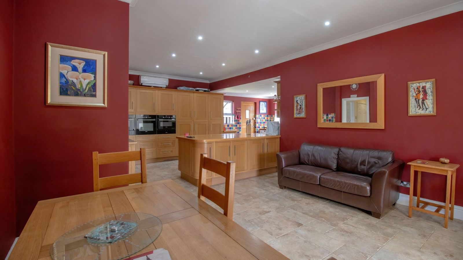 The open plan dining area, family room and kitchen is a sight to behold! The practical gourmet kitchen with attention to detail boast with ample work surface and a multitude of drawers and cupboards. Air-conditioning, eye-level ovens, a built-in washing machine, and a fitted fridge and freezer are neatly tucked away in kitchen cupboards for your convenience. A separate, large lounge features built-in shelves, a fireplace and air-conditioning.