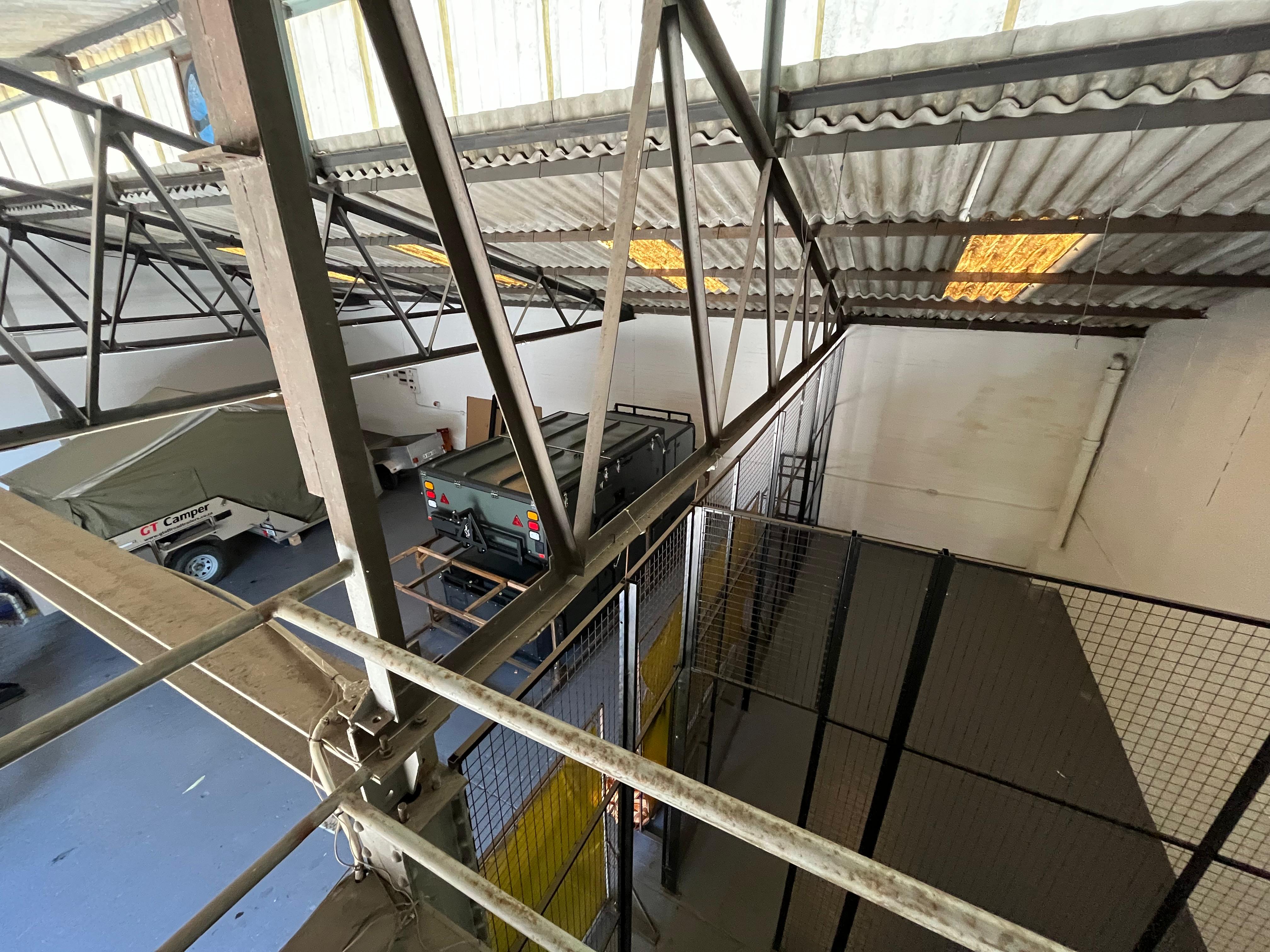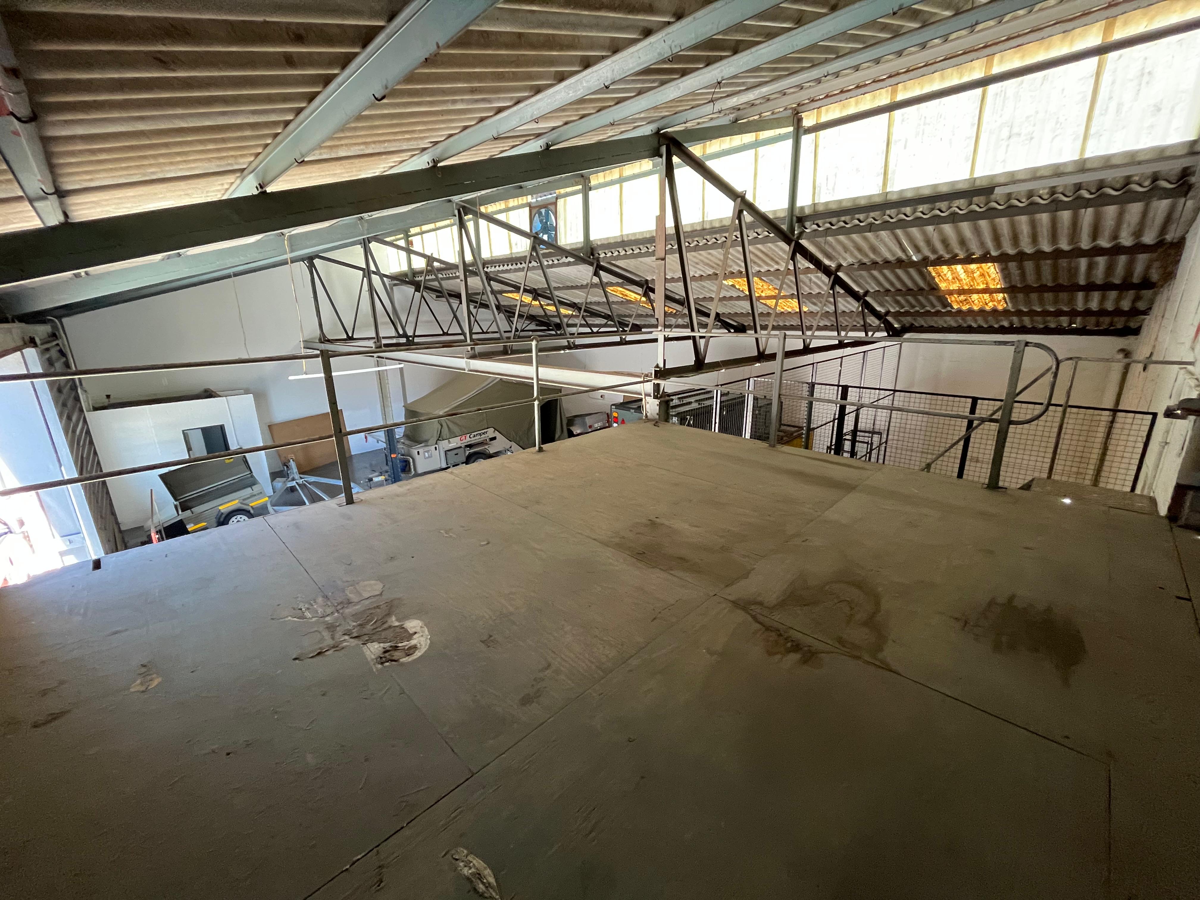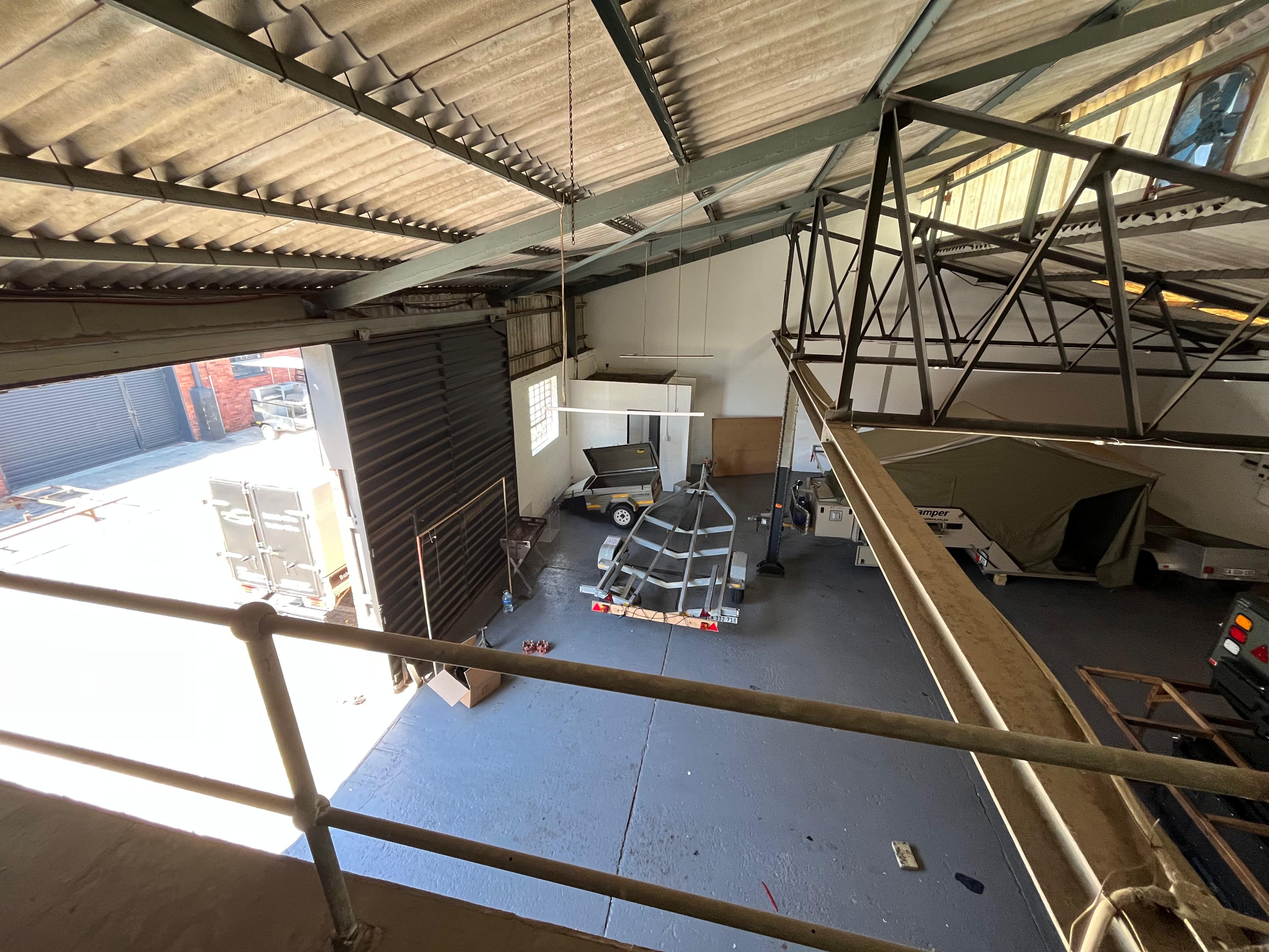 A corner office/reception area with a separate pedestrian entrance provides a welcoming front-of-house option, while a mezzanine level above the office offers additional light storage or workspace potential.