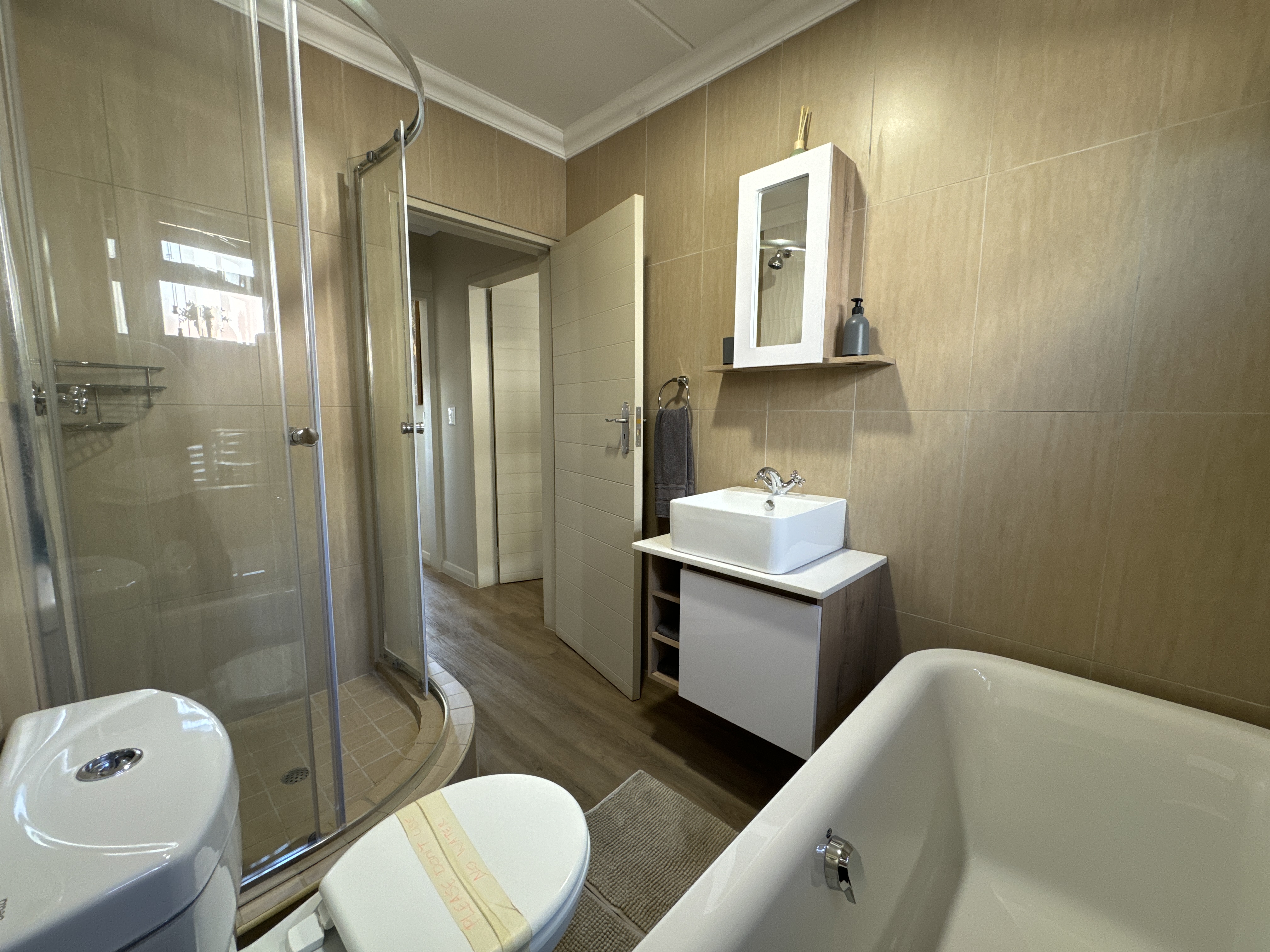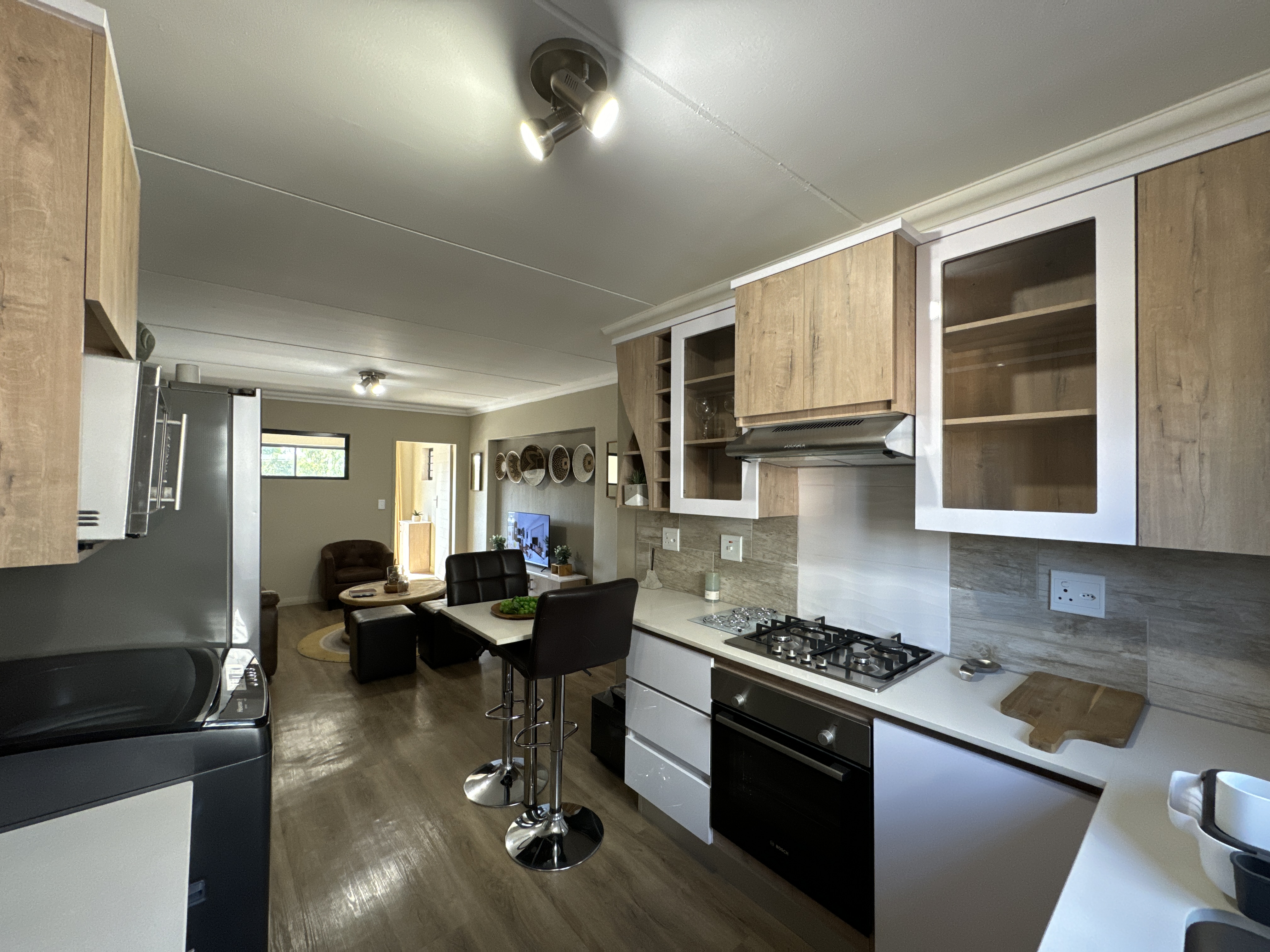 Modern Kitchen – The kitchen has ample cupboard space and is equipped with a gas stove, electrical oven and cooker hood.