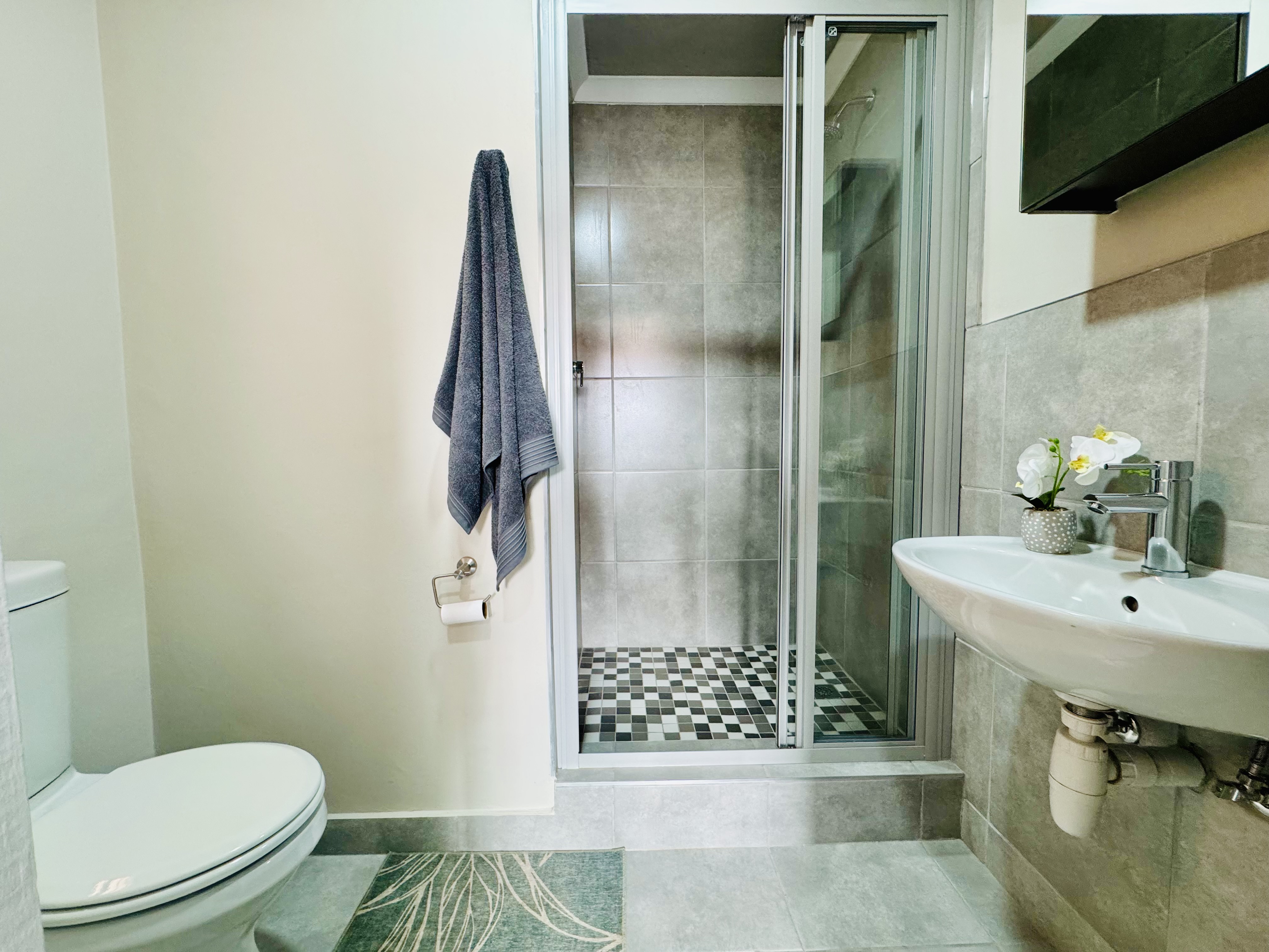 The kitchen offers ample cupboard space and a clean, modern finish. To the right, you'll find the first well-sized bedroom, complete with an en-suite bathroom featuring a shower. On the opposite side, the second bedroom also includes its own en-suite bathroom—this one with a bathtub, ideal for unwinding after a long day.