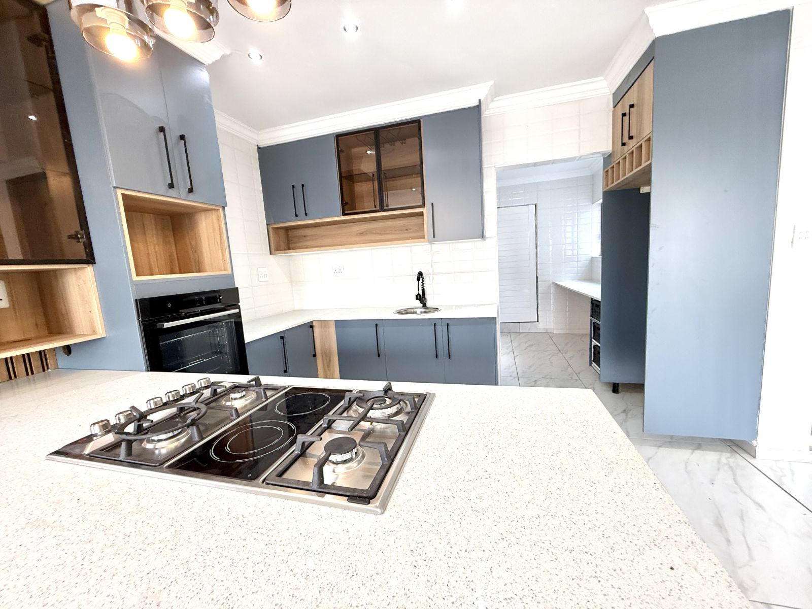 -The entrance of the home welcomes you with an open plan living two lounges with a guest bathroom and bedroom , a modern kitchen with stunning breathe-taking finishes.