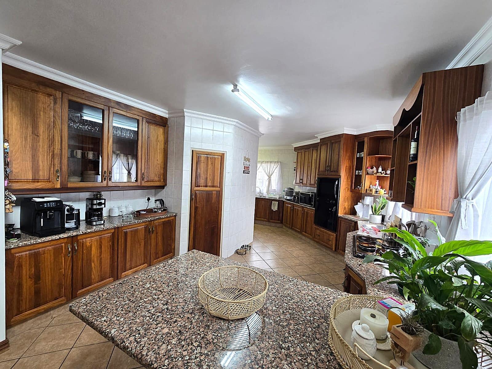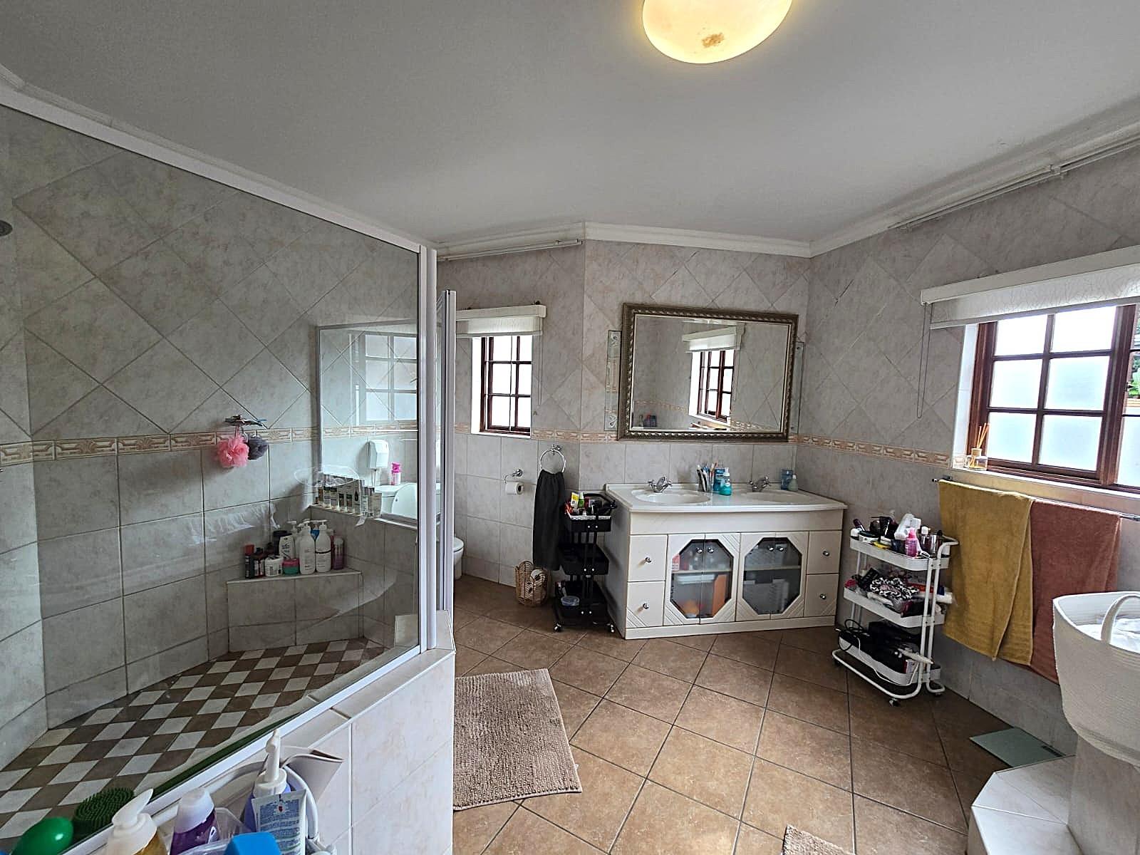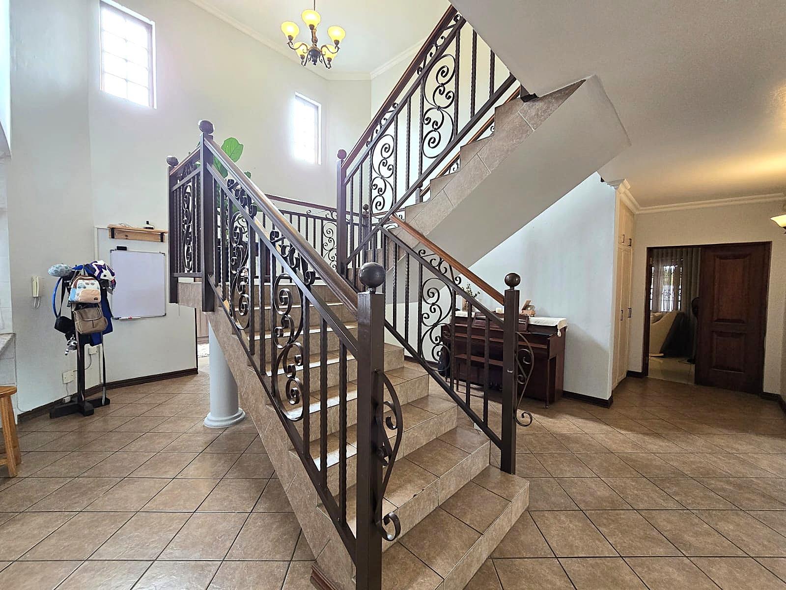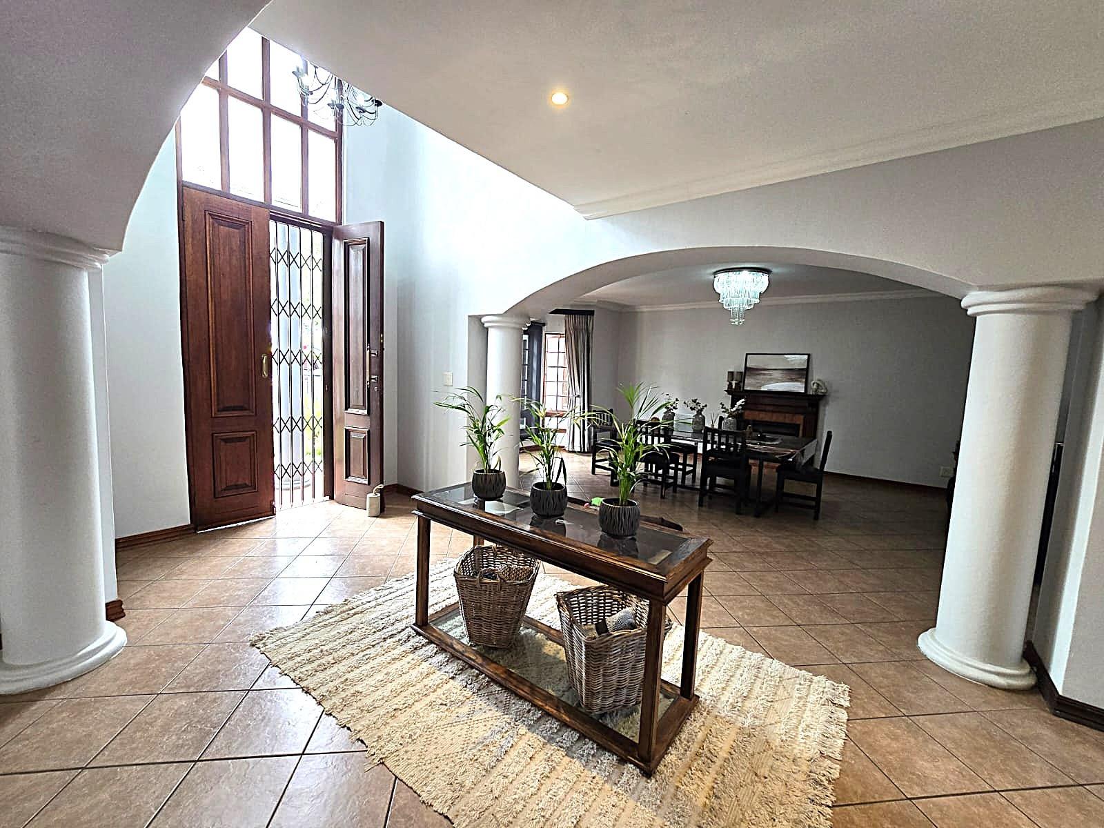 Additional features include double automated garages, extra guest parking, a domestic bathroom, built-in braai, fibre connectivity, irrigation system, tiled floors, built-in cupboards, and excellent security throughout.