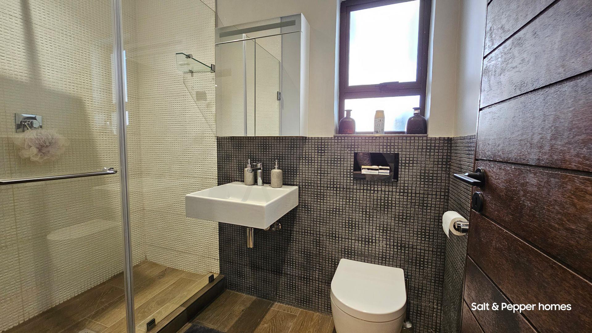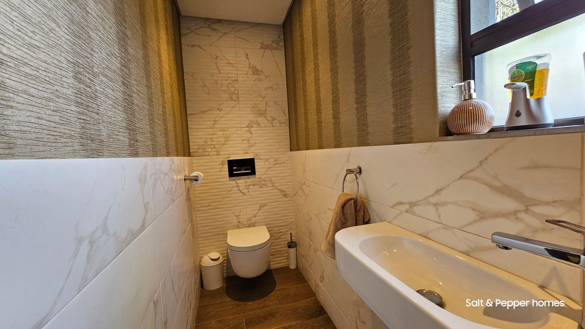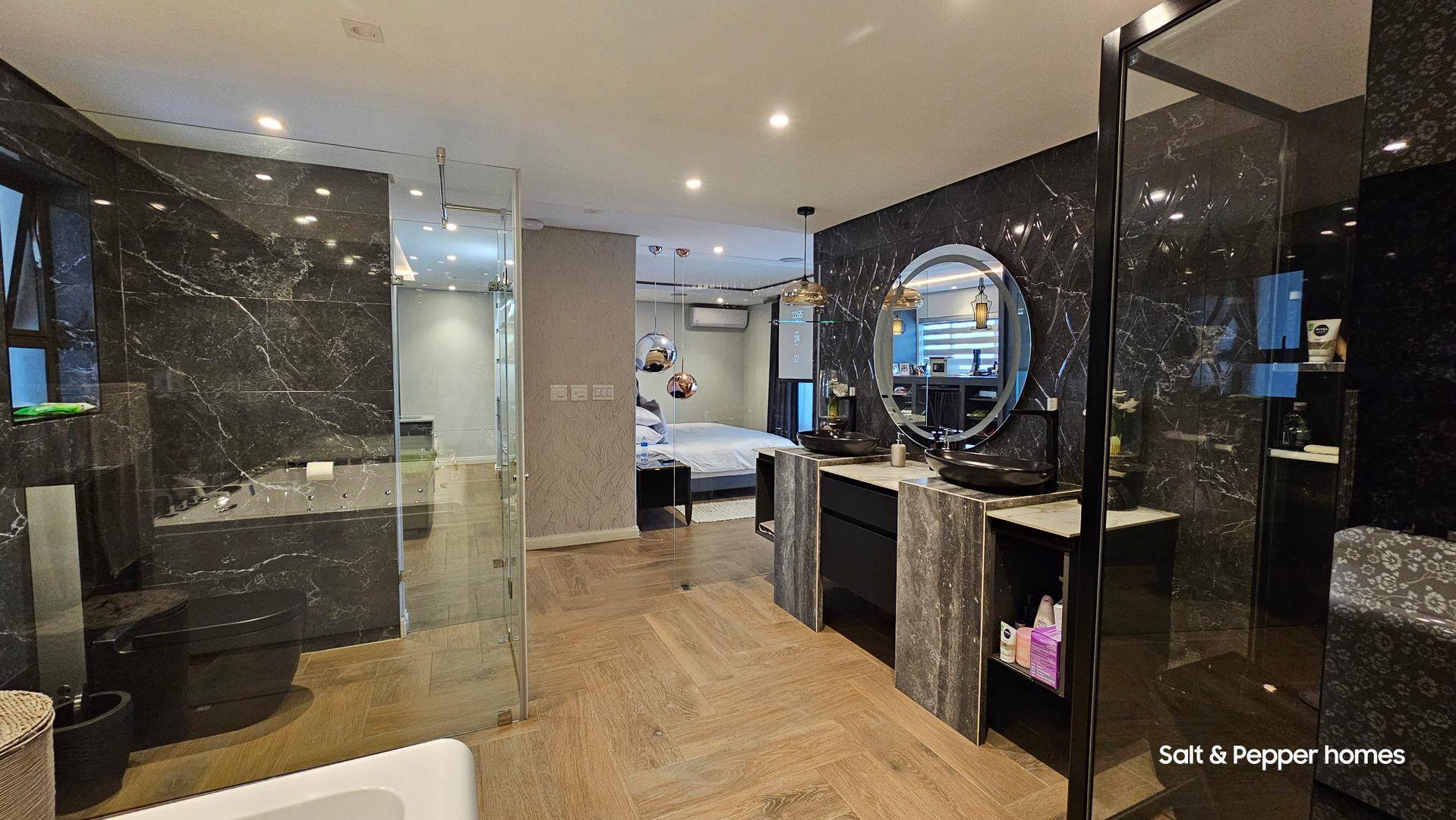 The home’s tranquil ambiance is elevated by automatic curtain rails, a serene fish pond, and a refined aesthetic that merges comfort and class.