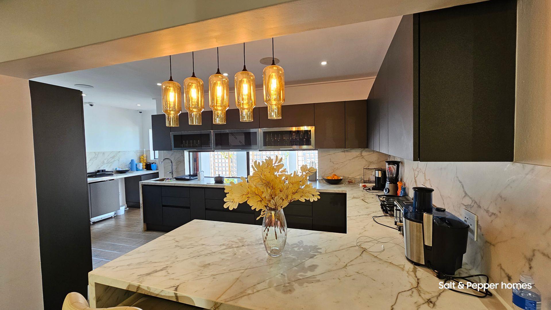 The kitchen is a culinary masterpiece featuring imported tiles and countertops, complemented by premium Siemens appliances — including stove, dishwasher, fridge, freezer, and microwave — making this the perfect space for any home chef.
