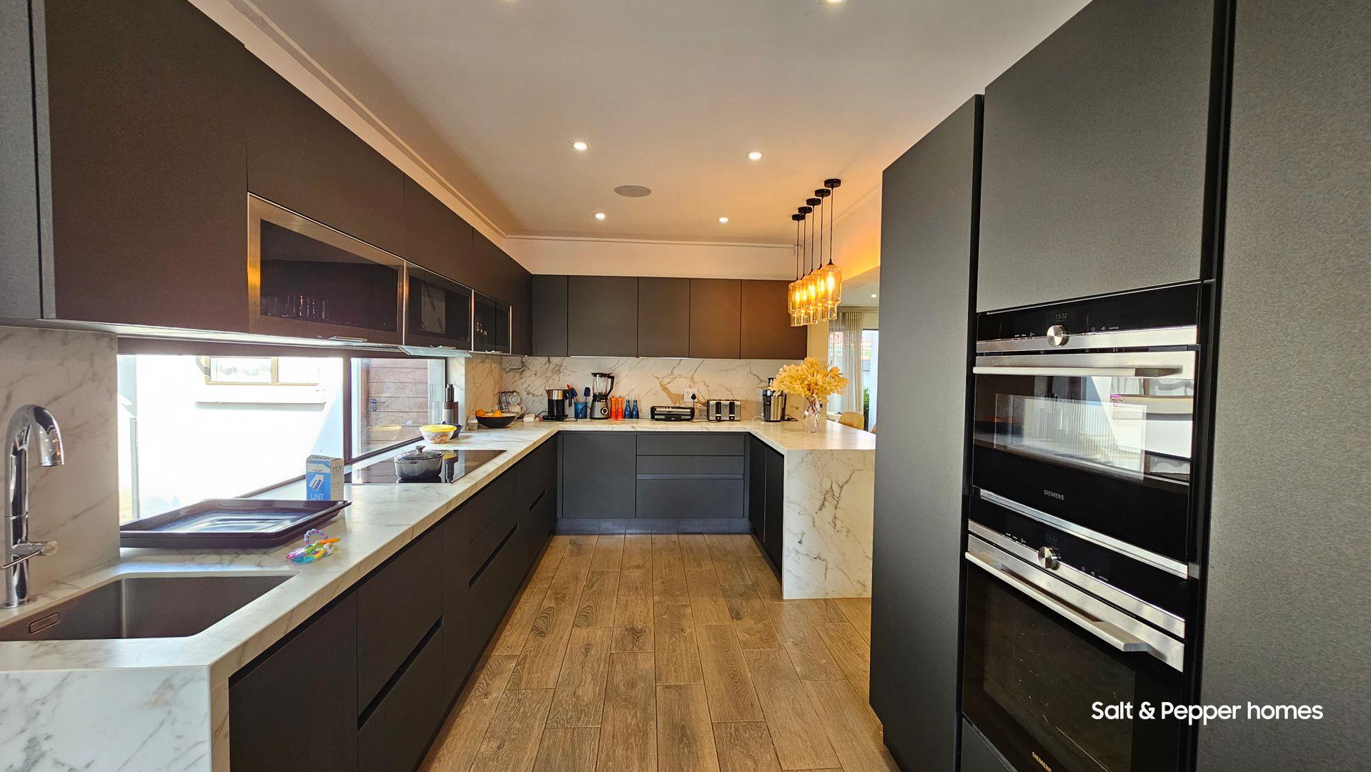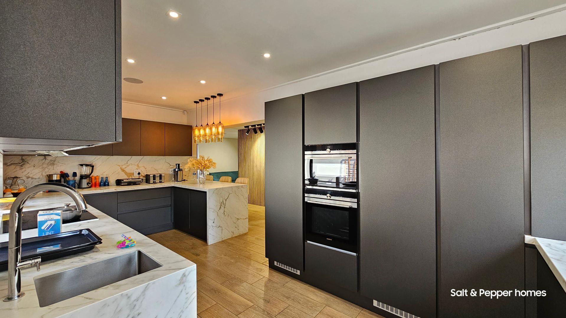Featuring Le Creuset ovens and Siemens intelligent stoves, the kitchen exemplifies quality, precision, and sophistication