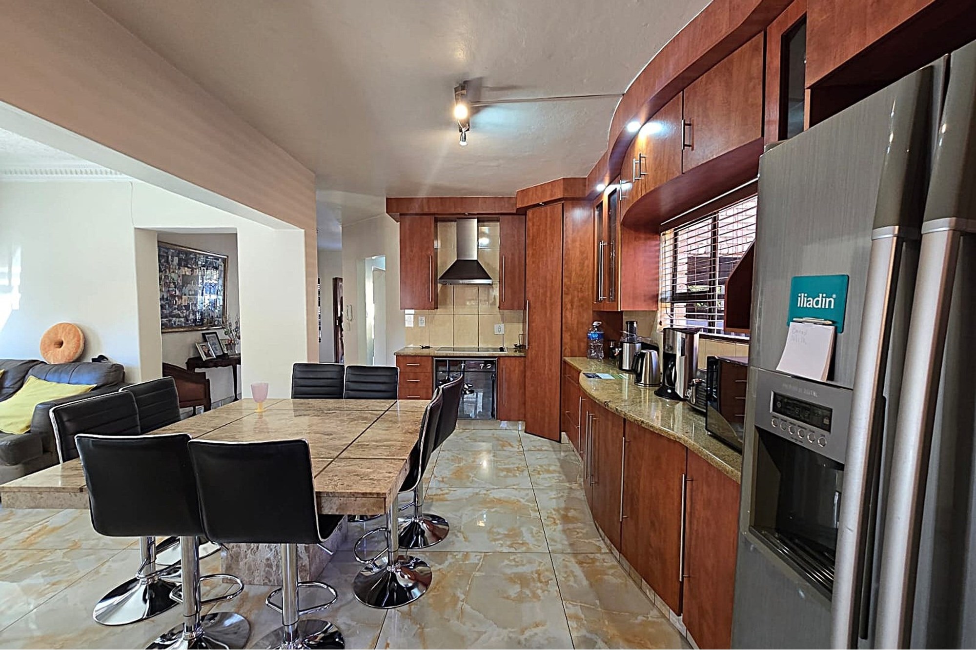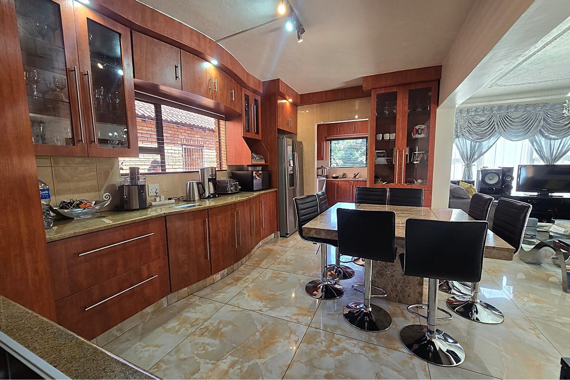 Open Plan Kitchen: Equipped with a separate scullery, sleek granite countertops, and a large breakfast nook, perfect for casual meals.