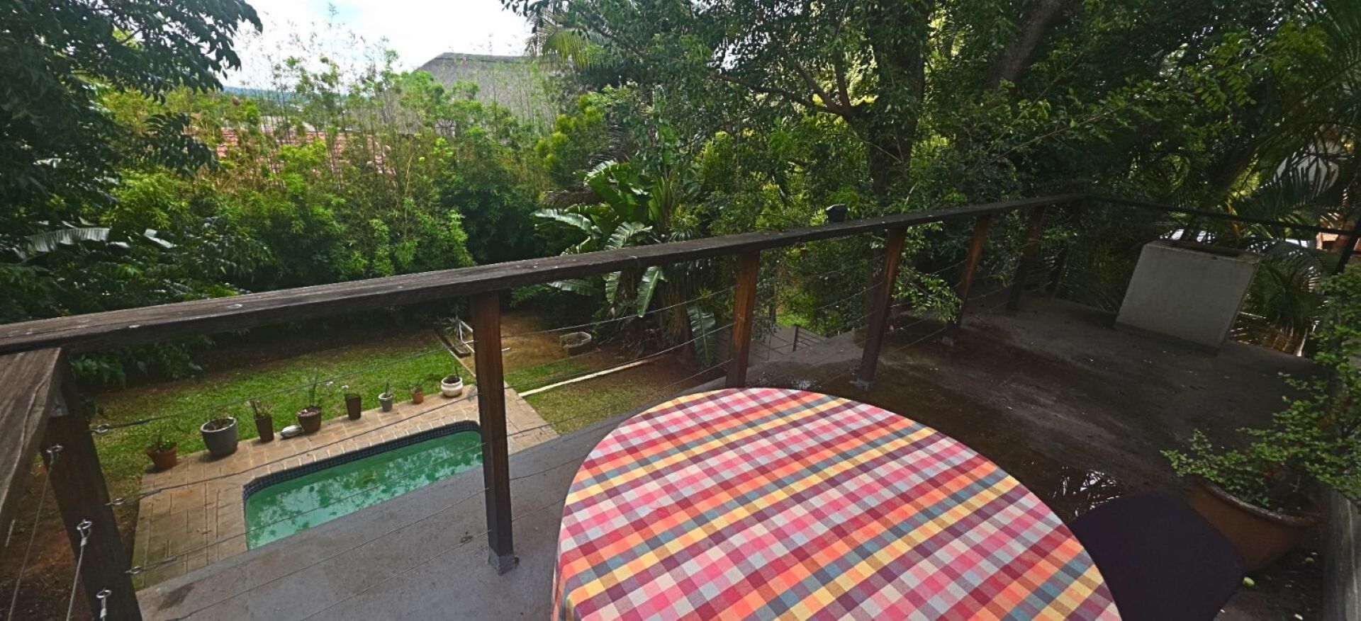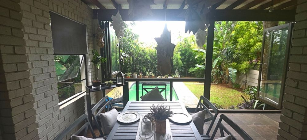 Step outside to a large covered patio with a built-in braai, perfect for entertaining while overlooking the sparkling pool and lush green garden—a tranquil setting for relaxation and outdoor living.