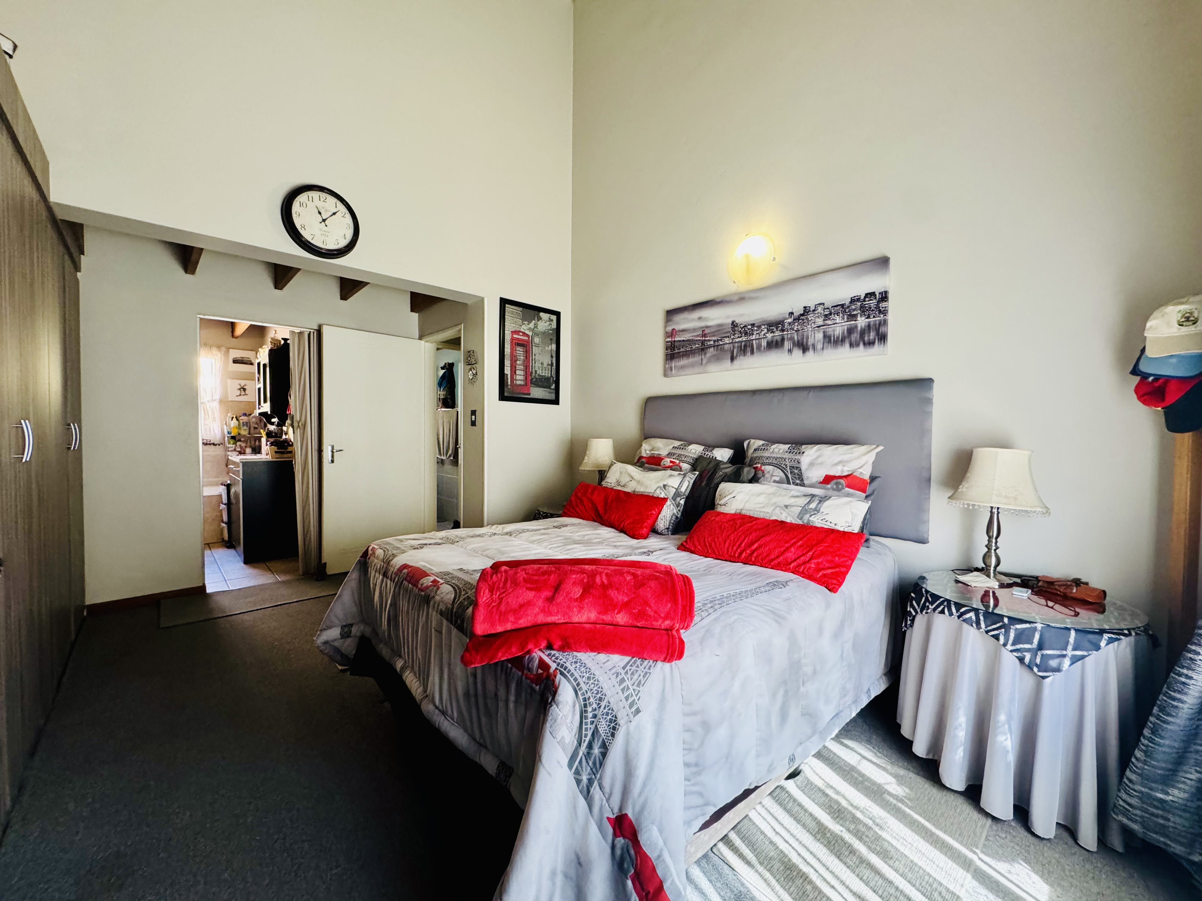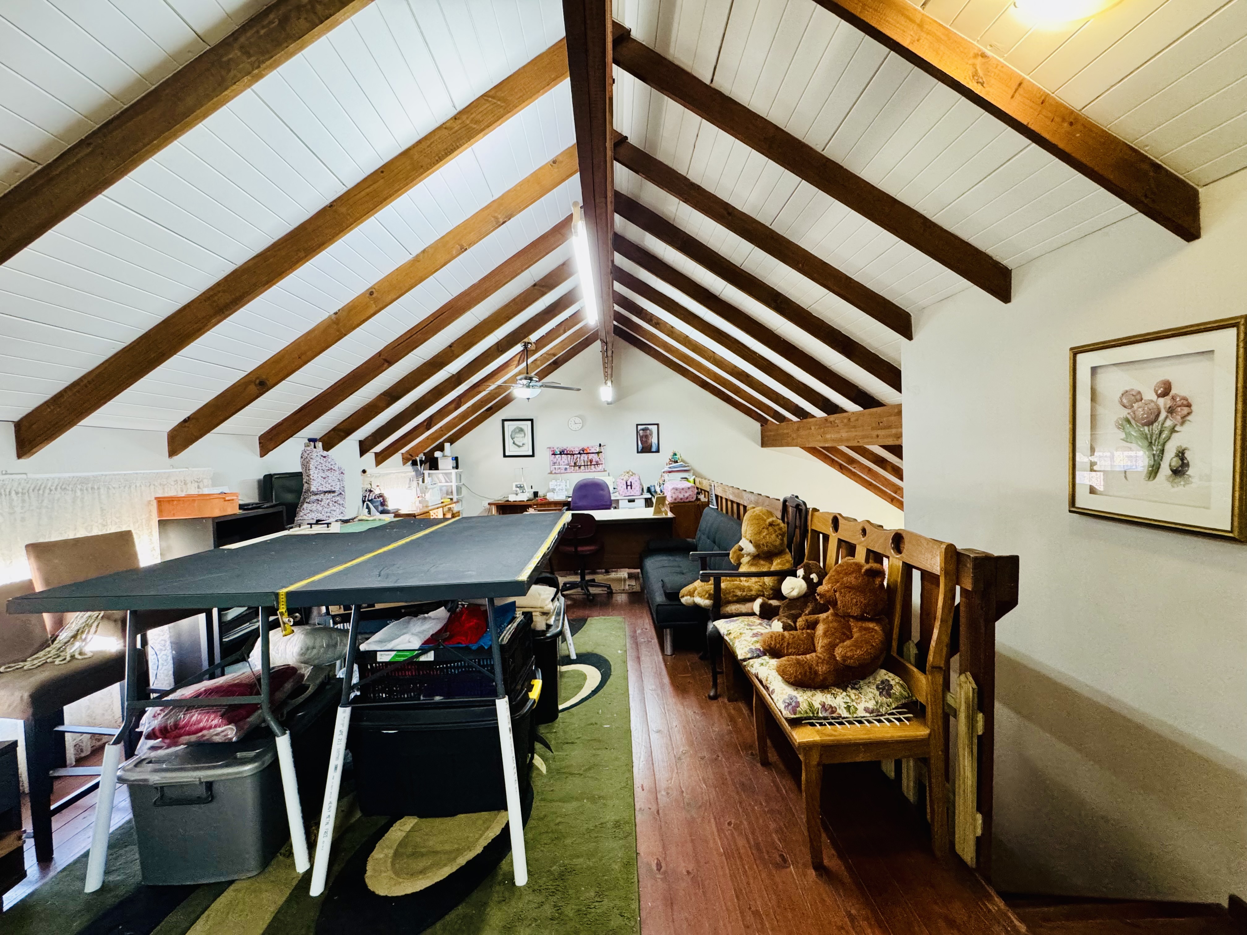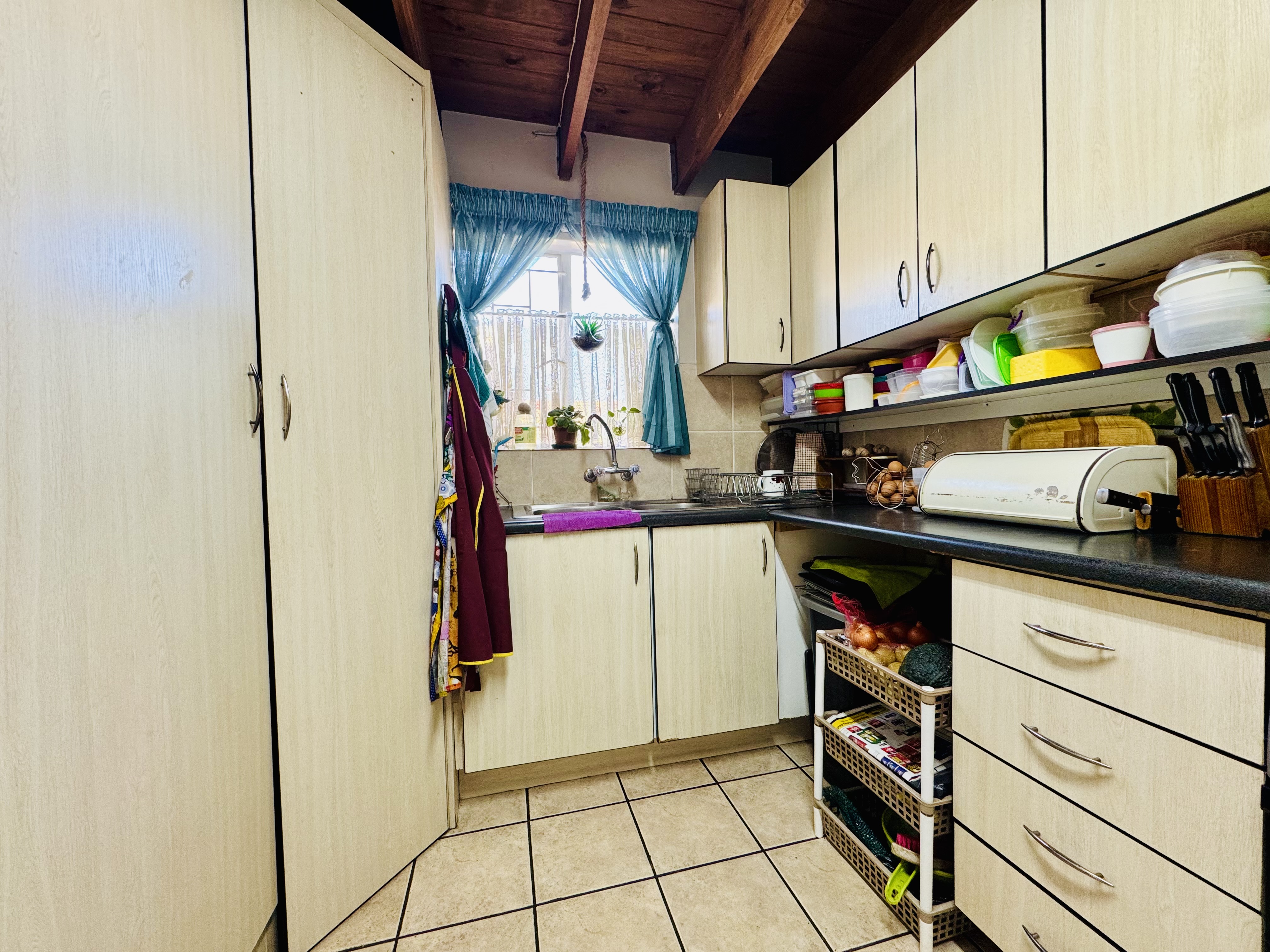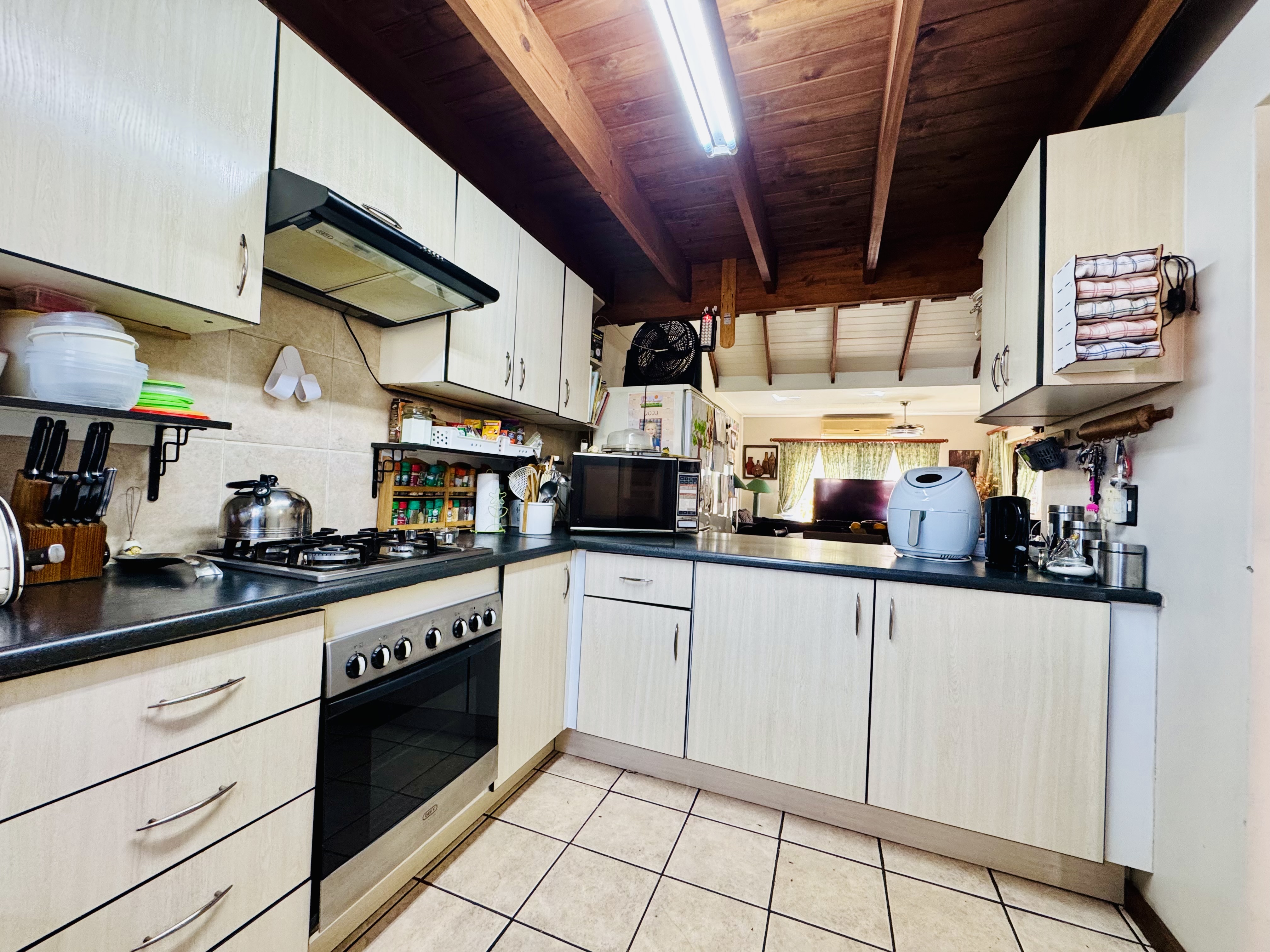 Step into the open-plan living space where exposed wooden beams add warmth and charm to the interiors. The spacious kitchen overlooks the living and dining areas and features ample cupboard space, a gas stove and oven, extractor fan, and a convenient pantry — ideal for those who love to cook and entertain.