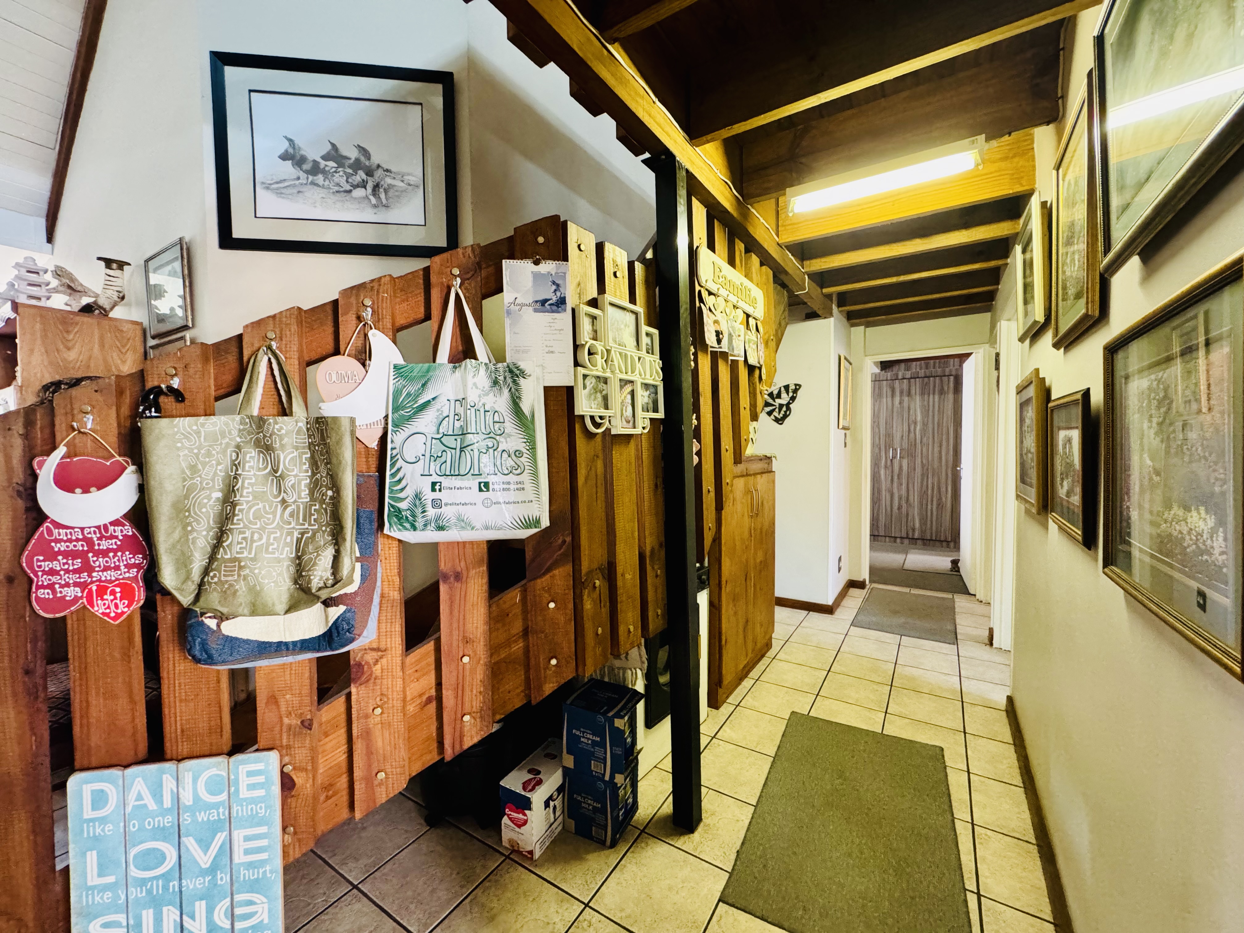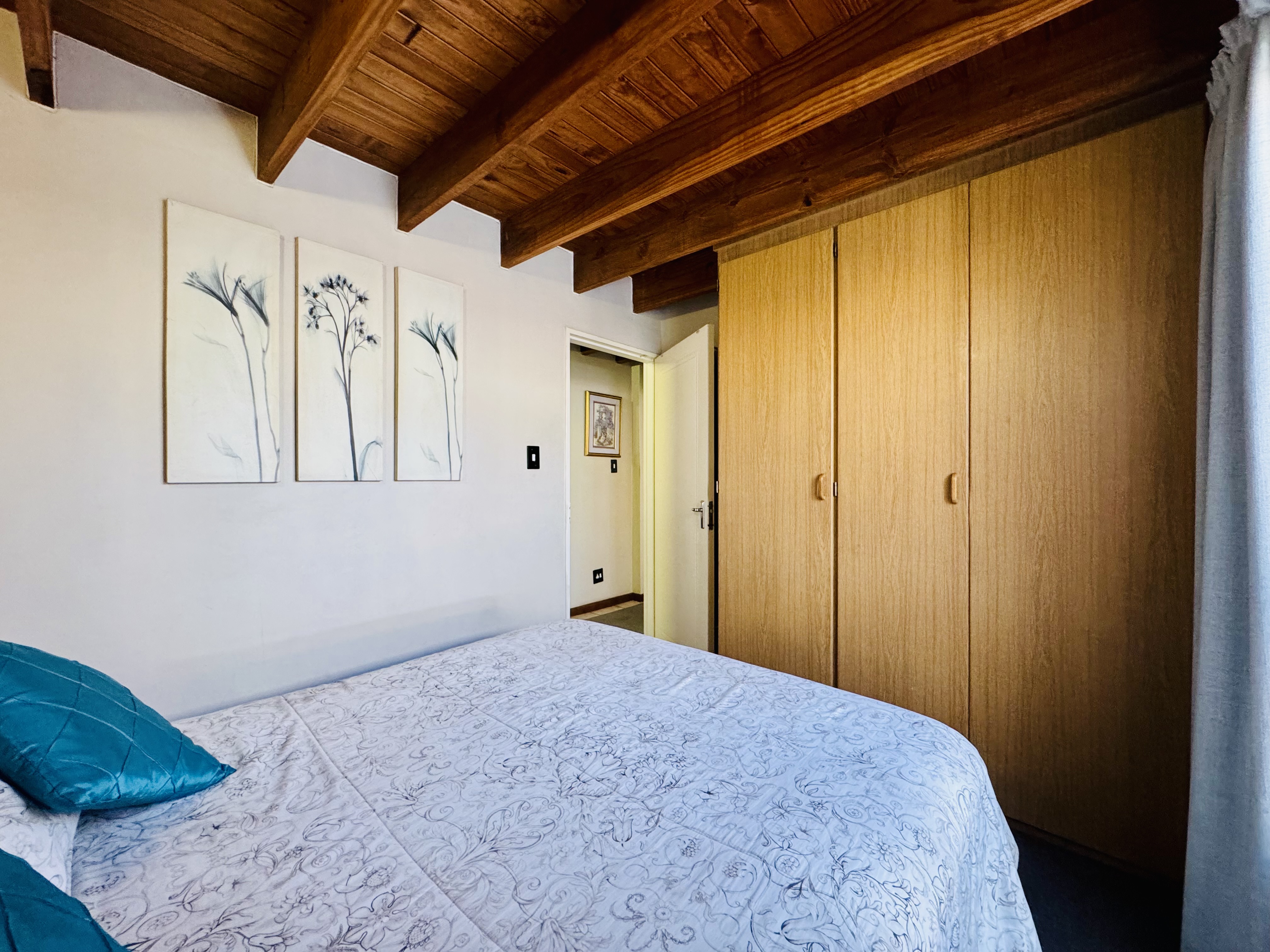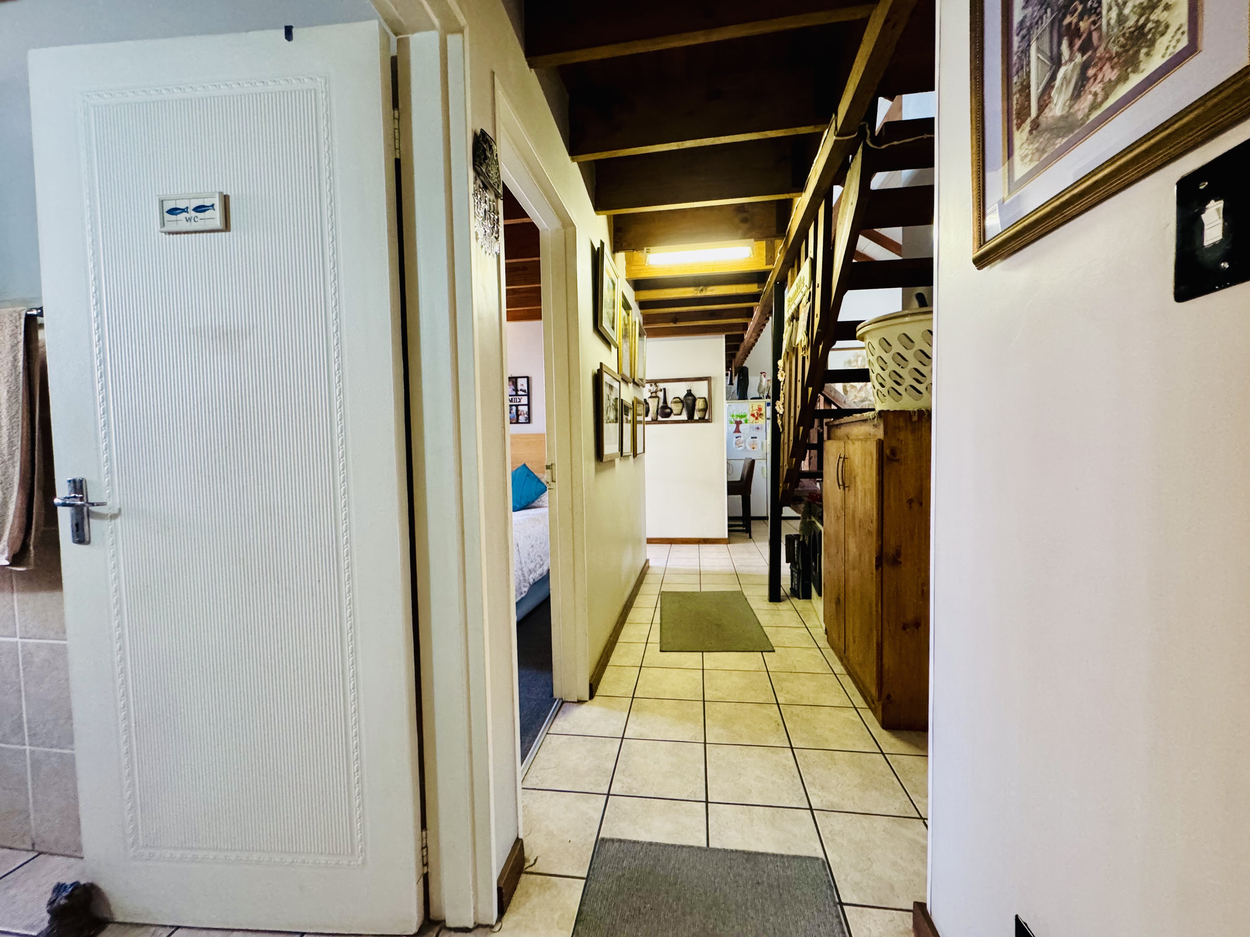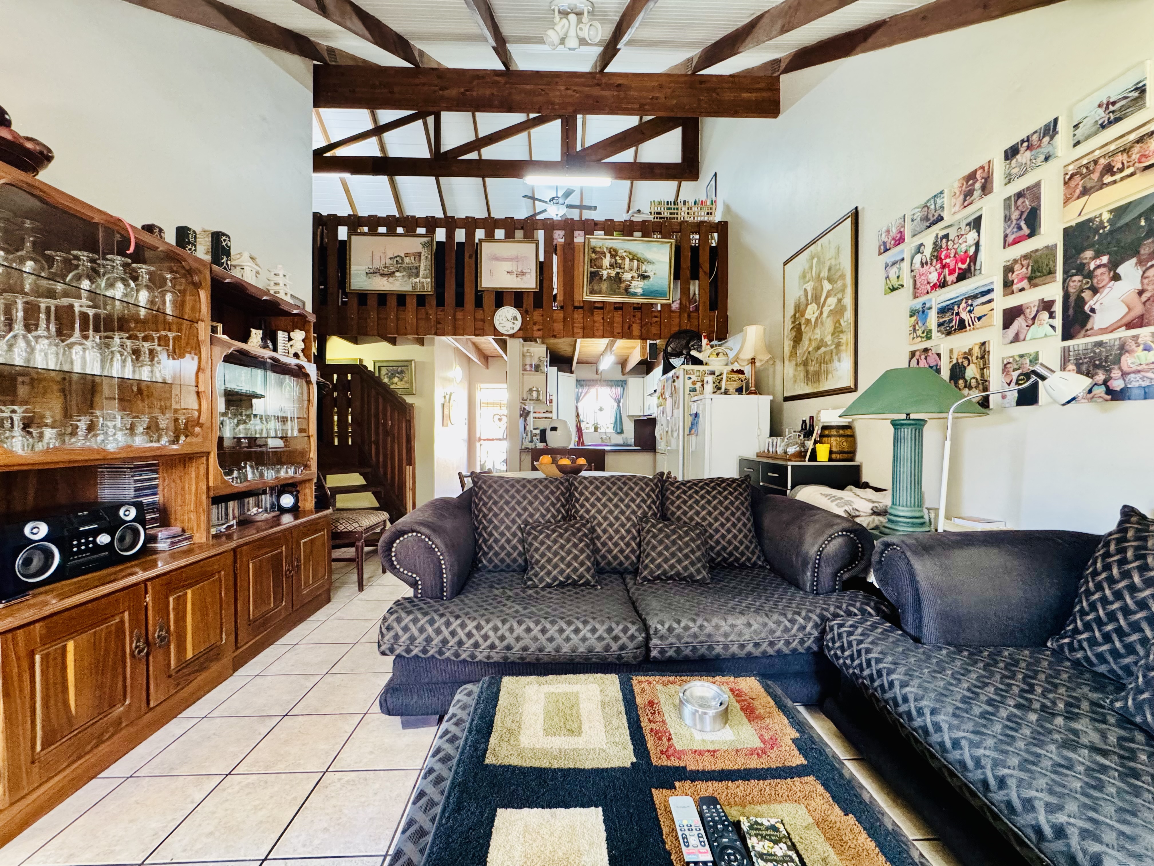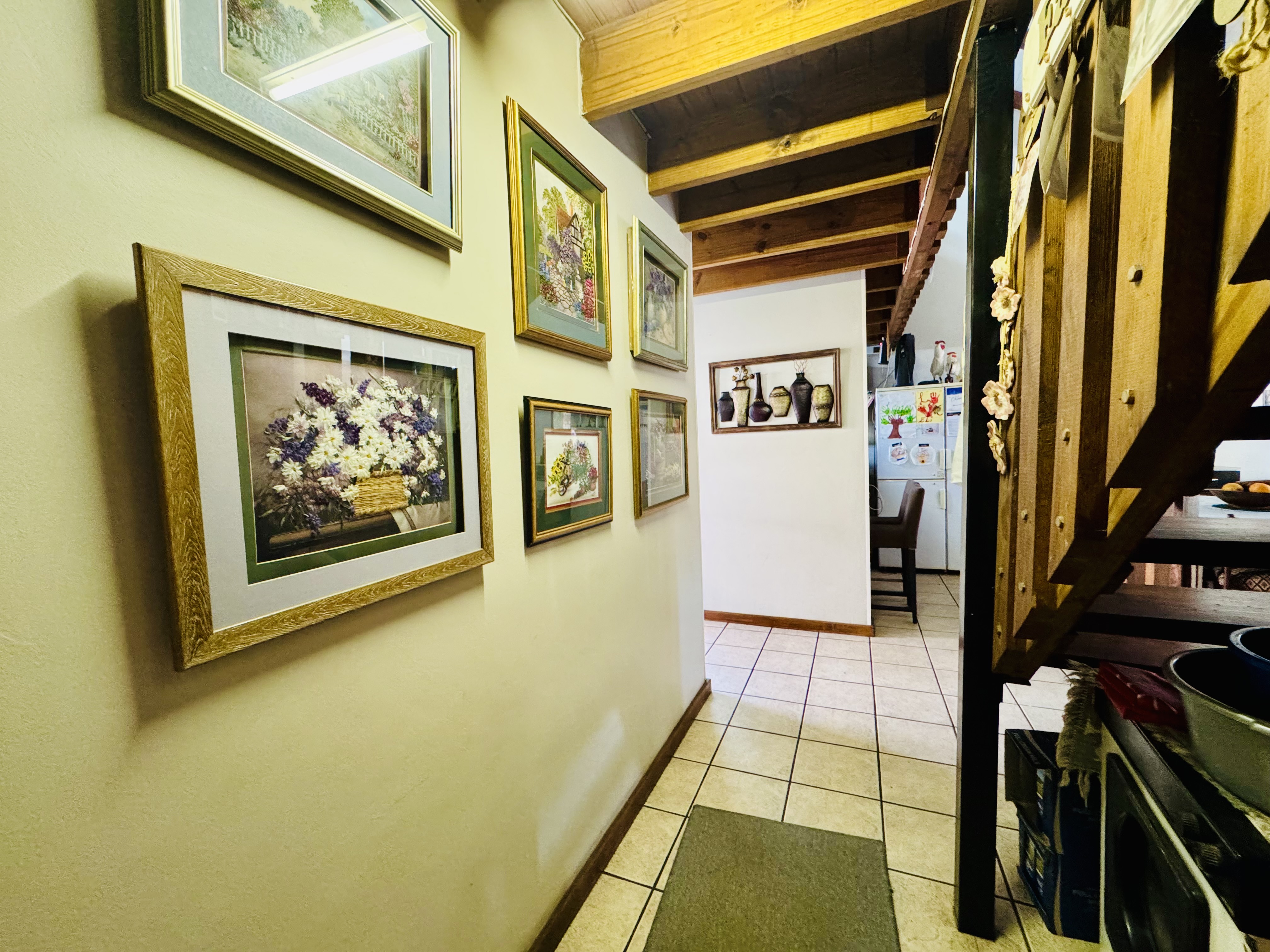 Step into the open-plan living space where exposed wooden beams add warmth and charm to the interiors. The spacious kitchen overlooks the living and dining areas and features ample cupboard space, a gas stove and oven, extractor fan, and a convenient pantry — ideal for those who love to cook and entertain.