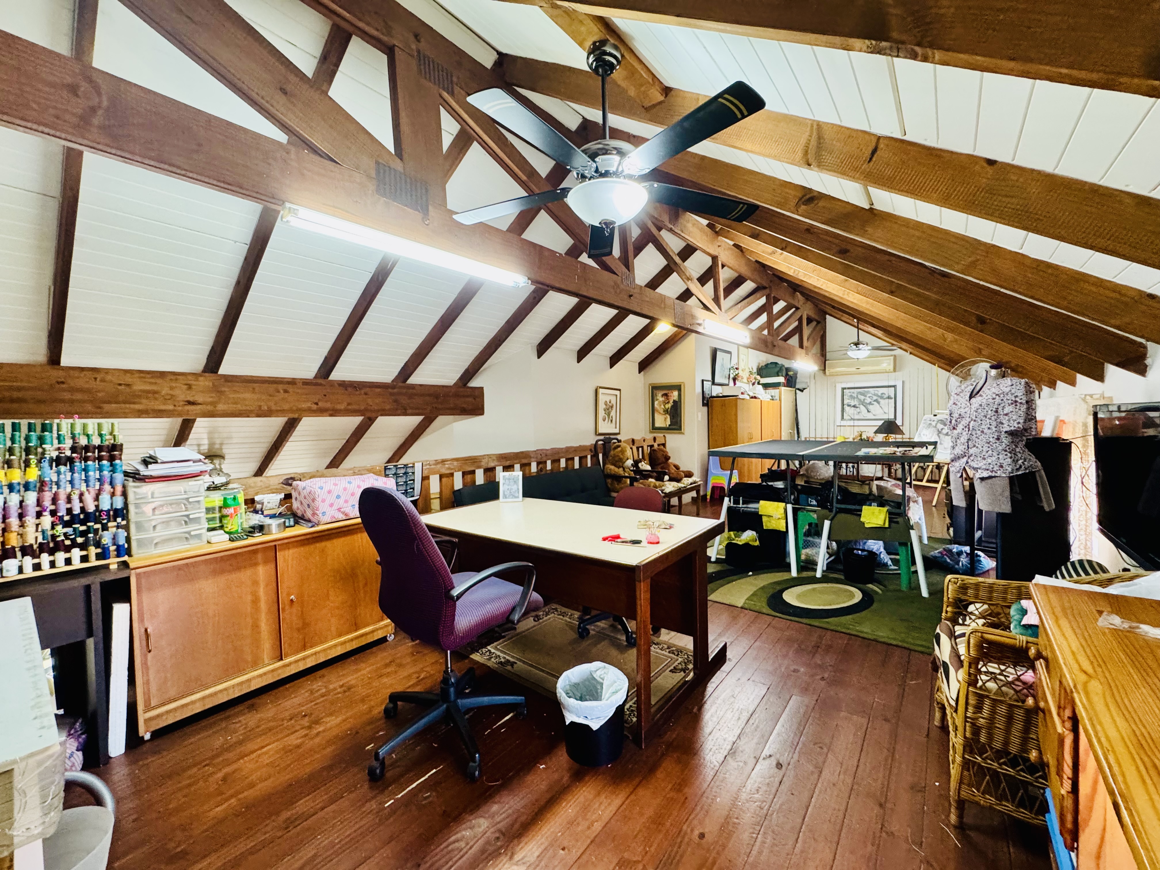 Just off the dining area, stairs lead up to a generous loft with the same striking exposed beams, offering a versatile space that can be used as a fourth bedroom, home office, or family room.