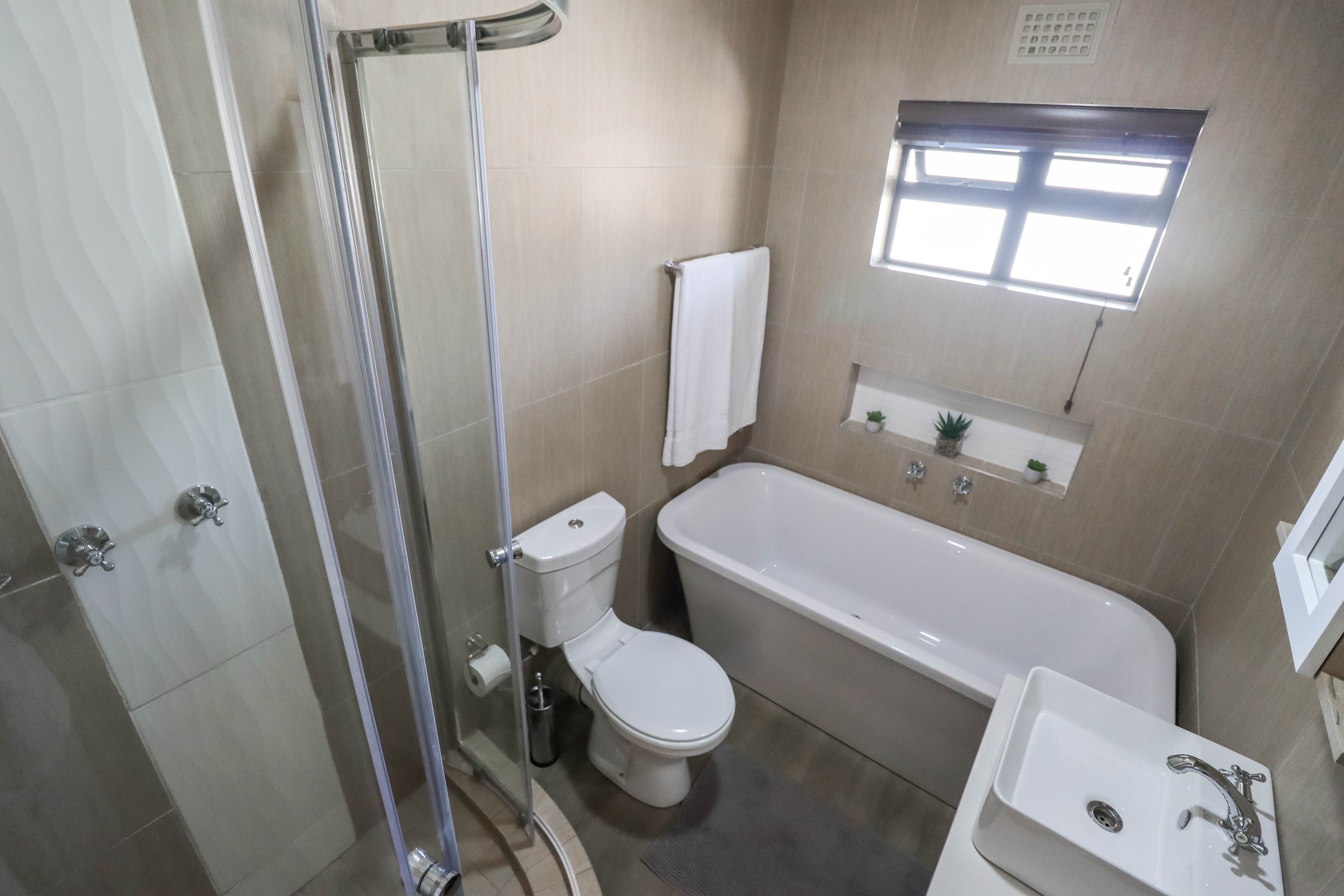 One full bathroom with bath tub, shower, basin and toilet and one en-suite bathroom with shower, basin and toilet. Two bedrooms are fitted with built in cupboards and the master bedroom also has a dressing table fitted.