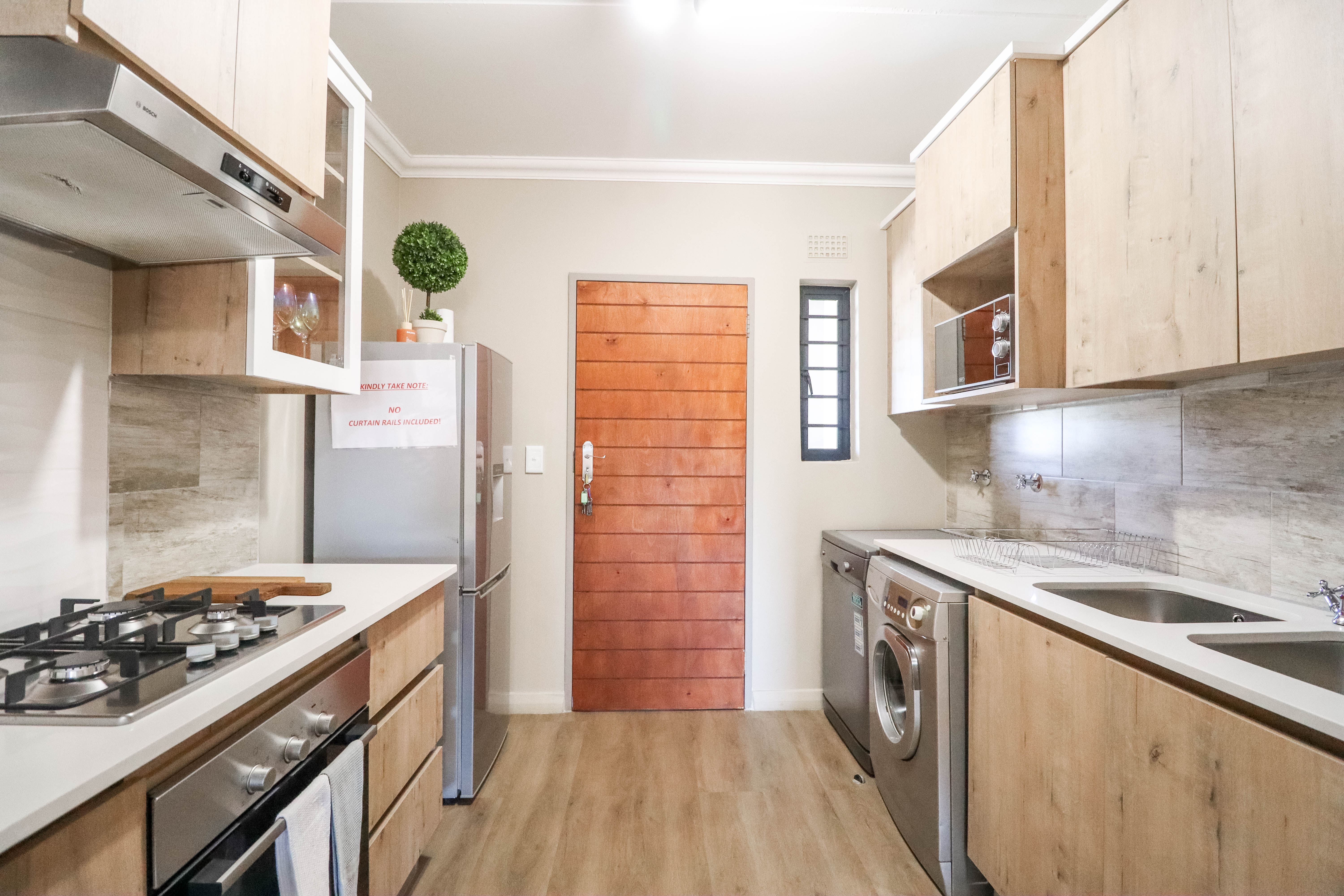 Kitchen has ample fitted cupboards, electric oven and gas hob, space for double door fridge, top loader washing machine and dishwasher.