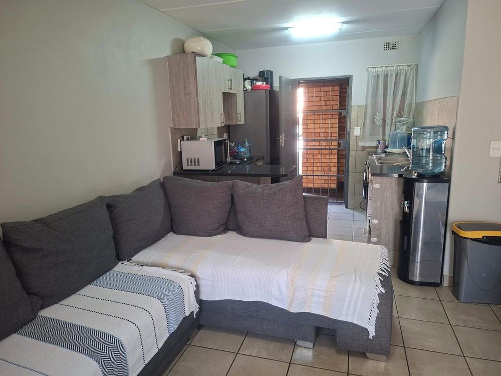 The living area boasts a cozy lounge seamlessly integrated with an open-plan kitchen. The kitchen is equipped with sleek melamine cupboards, elegant granite countertops, a hob, and an under-counter oven, making it a delightful space for culinary adventures.