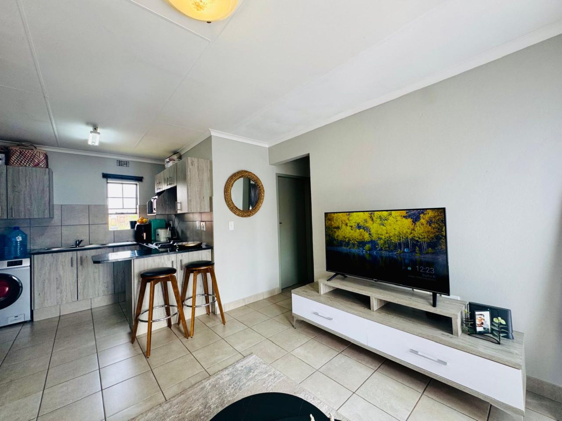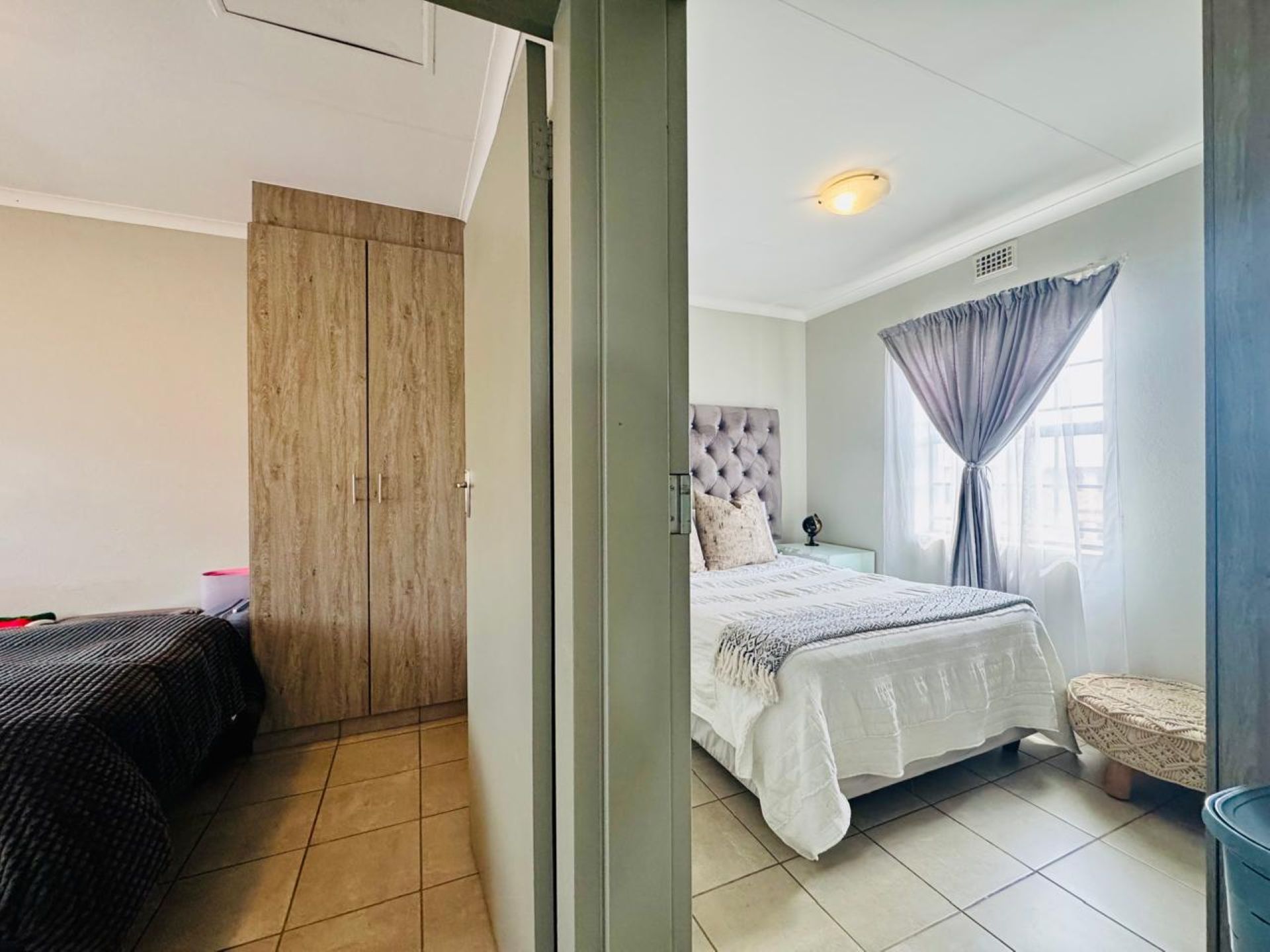 Both bedrooms are fitted with built-in cupboards, and the full bathroom includes a bathtub with fixed shower fittings — allowing it to be used as both a bath and shower. The unit also comes equipped with a solar geyser, helping you save on electricity and enjoy energy-efficient living.