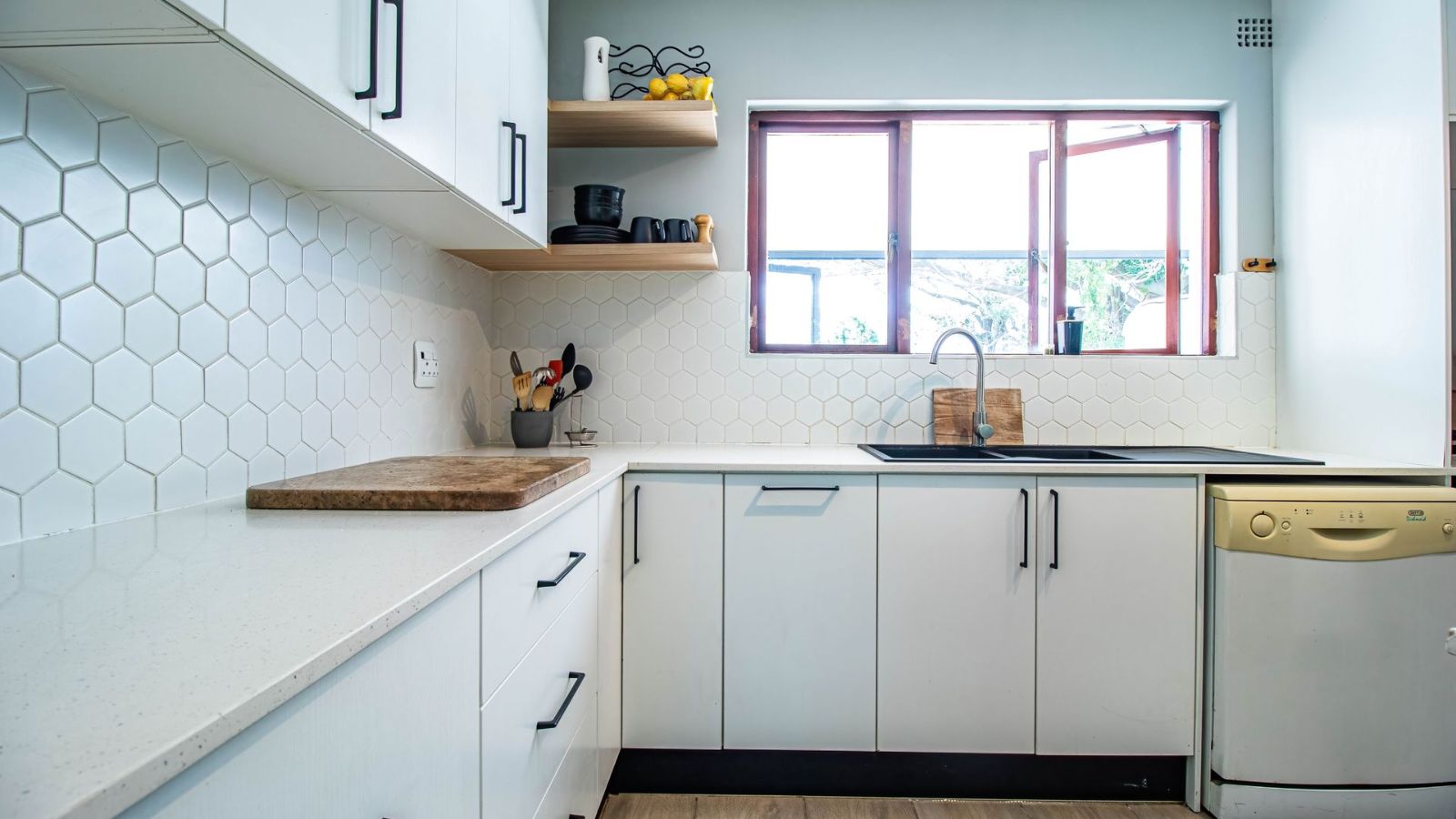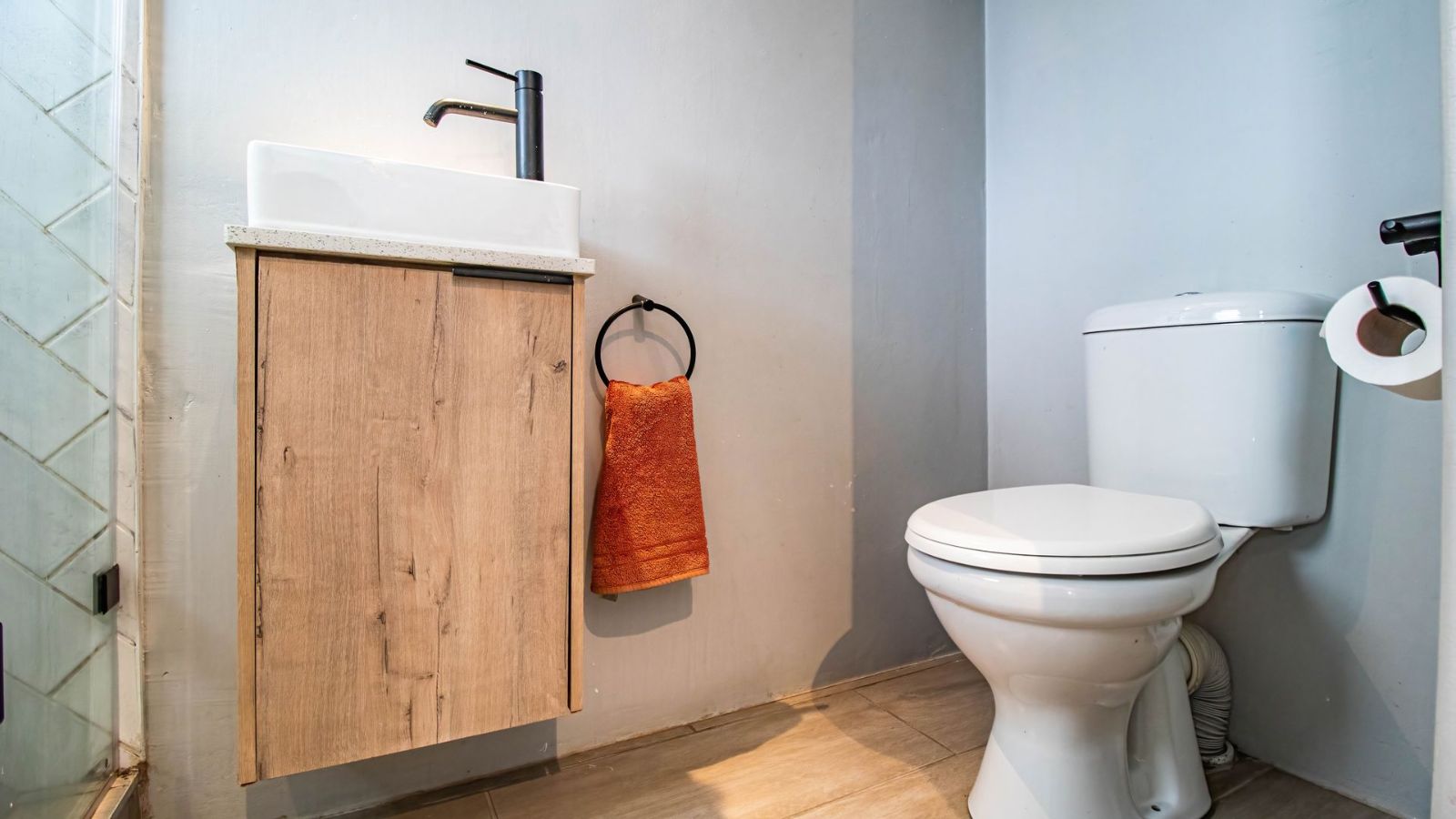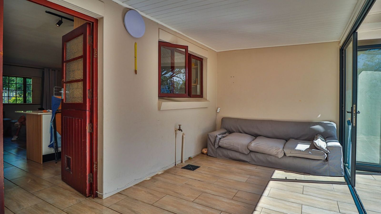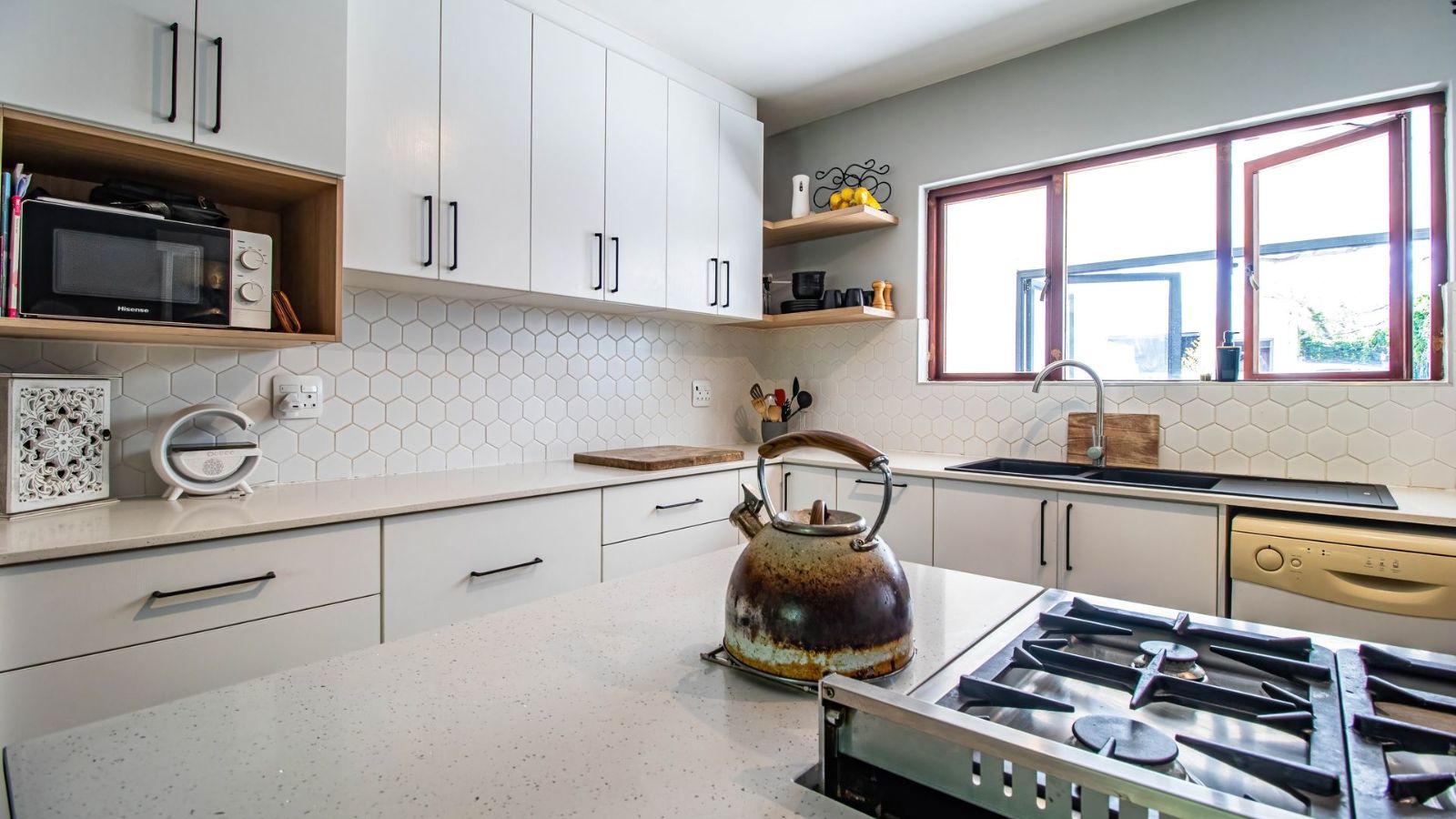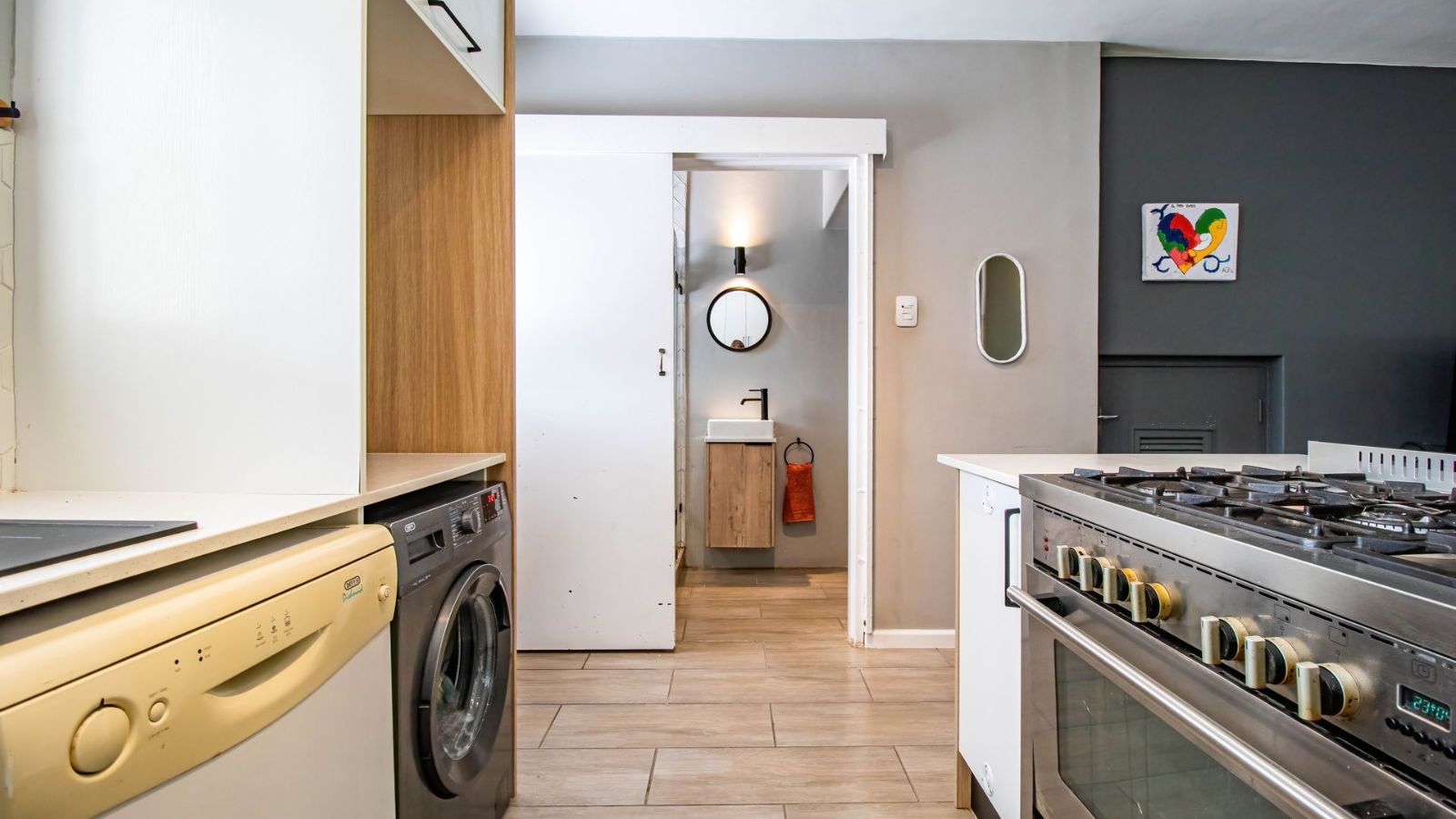 The ground floor is designed for modern living, featuring an open-plan living area, a separate bathroom, and a spacious, high-end kitchen. This stylish kitchen, perfect as a social hub, includes caesarstone countertops, a gas hob, a double granite basin, and two plumbing points. From the kitchen, stacking doors open onto a large, sunny, covered patio and a private enclosed courtyard.