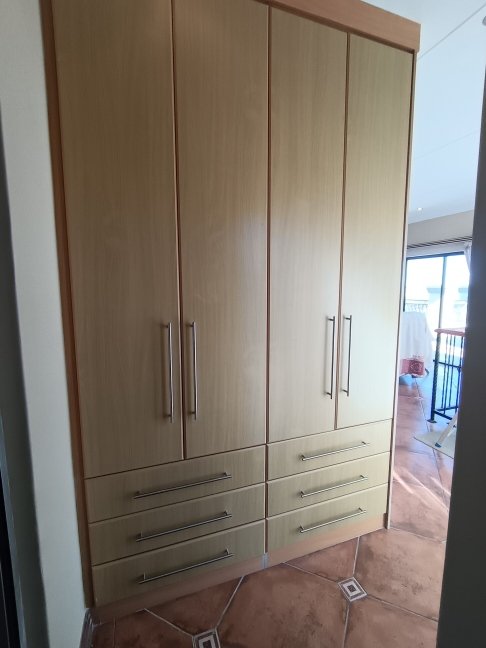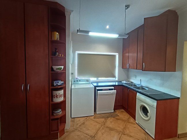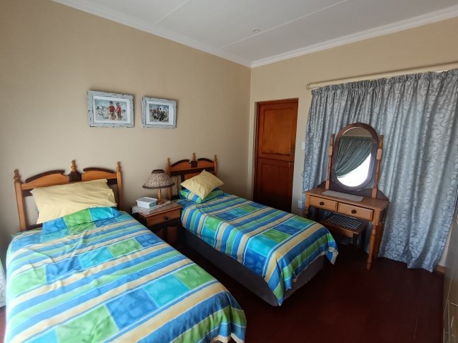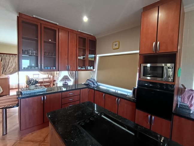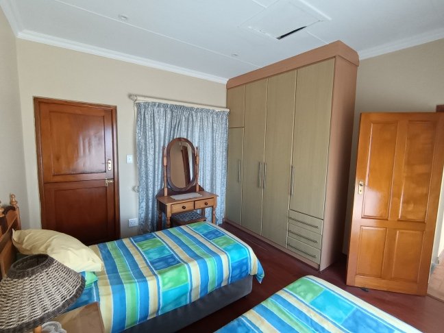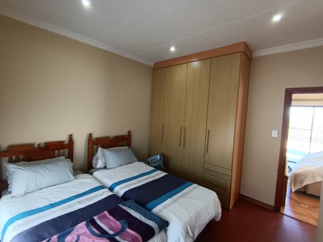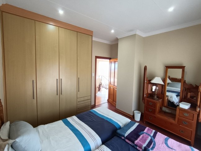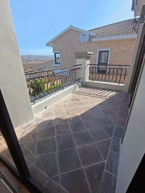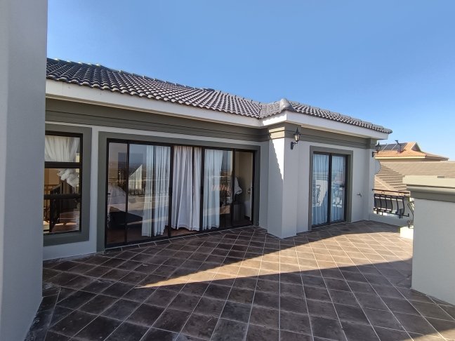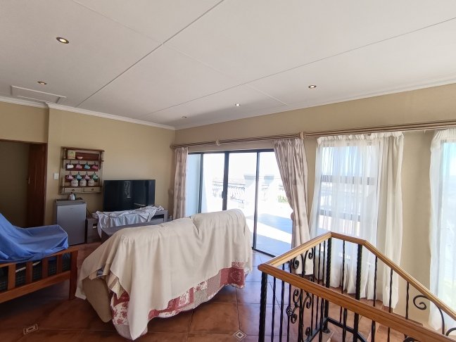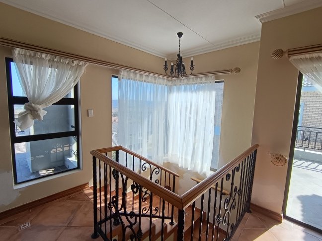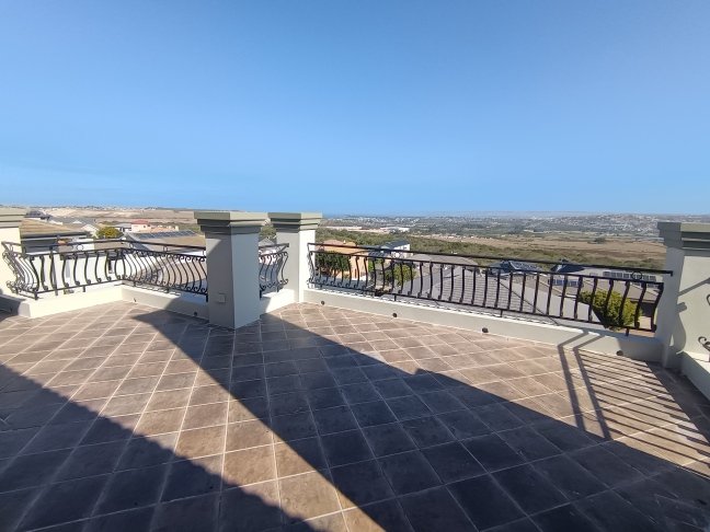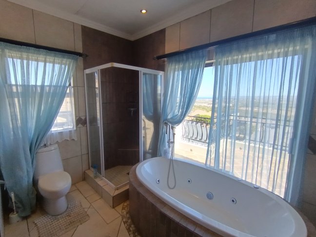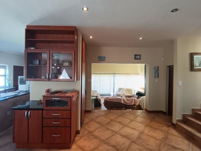 The double storage house offers 5 open plan living areas that consist out of a dining area, lounge, 2 x tv room areas (upstairs and downstairs) and built in braai/entertainment area. The 3 bedrooms are spacious with plenty of cupboards and sunlight. On ground level there is a guest bathroom and upstairs there are 2 more bathrooms. The en-suite bathroom is spacious. On ground level one finds the big open plan kitchen and scullery. There are 2 balconies, one below and one upstairs. The top balcony is spacious and one can see the whole world from here. Enjoy a sundowner from the privacy of your own balcony watching the Mossel Bay lighthouse in the distance.