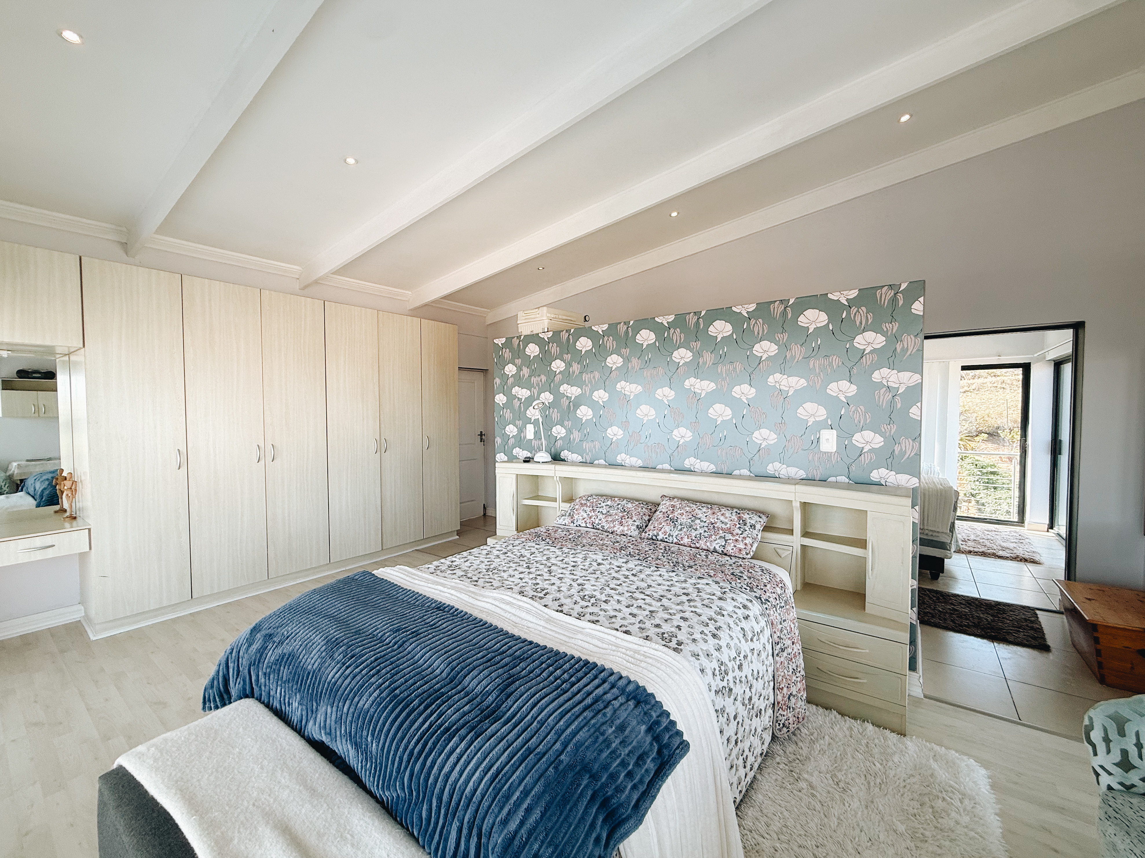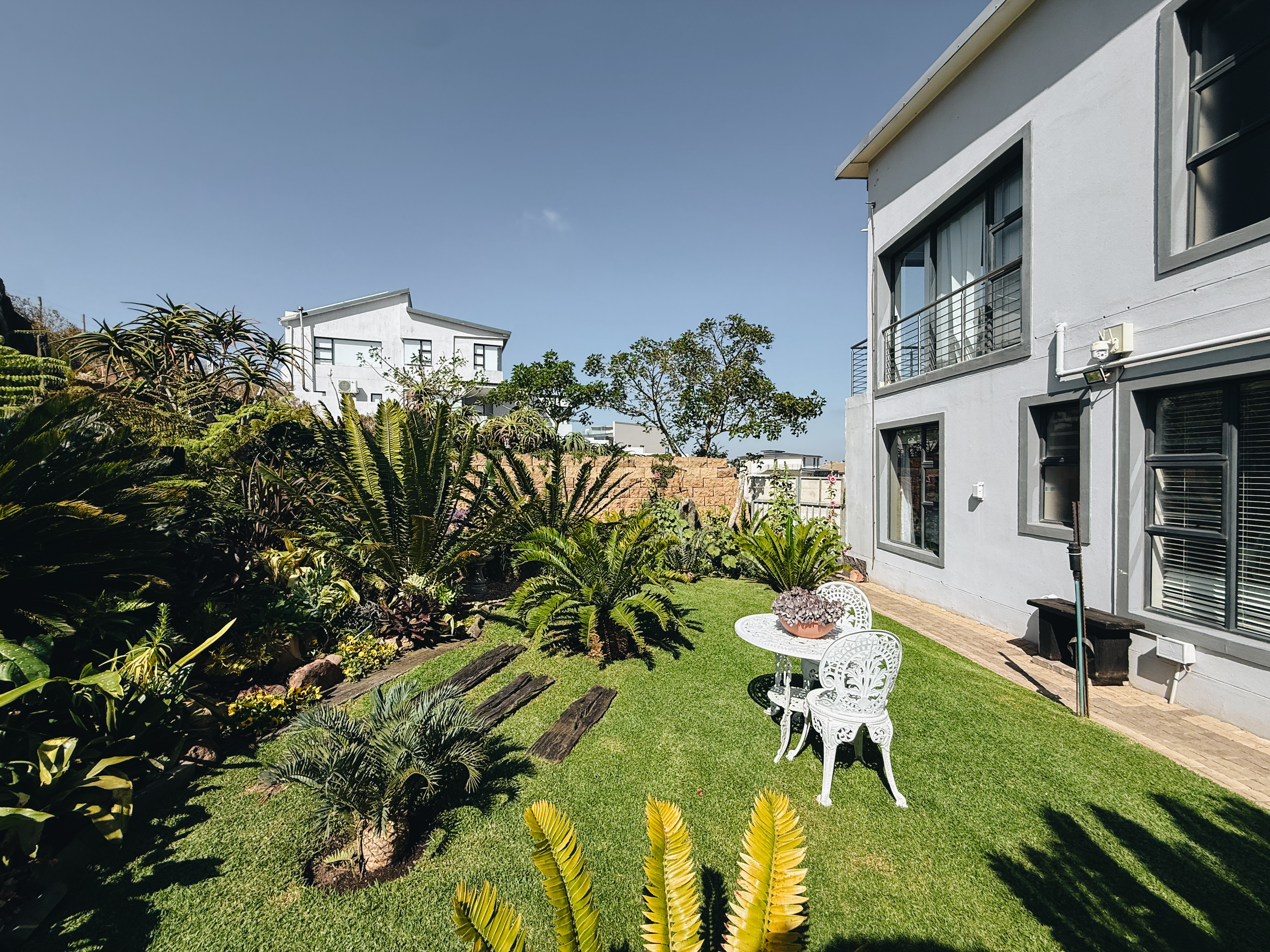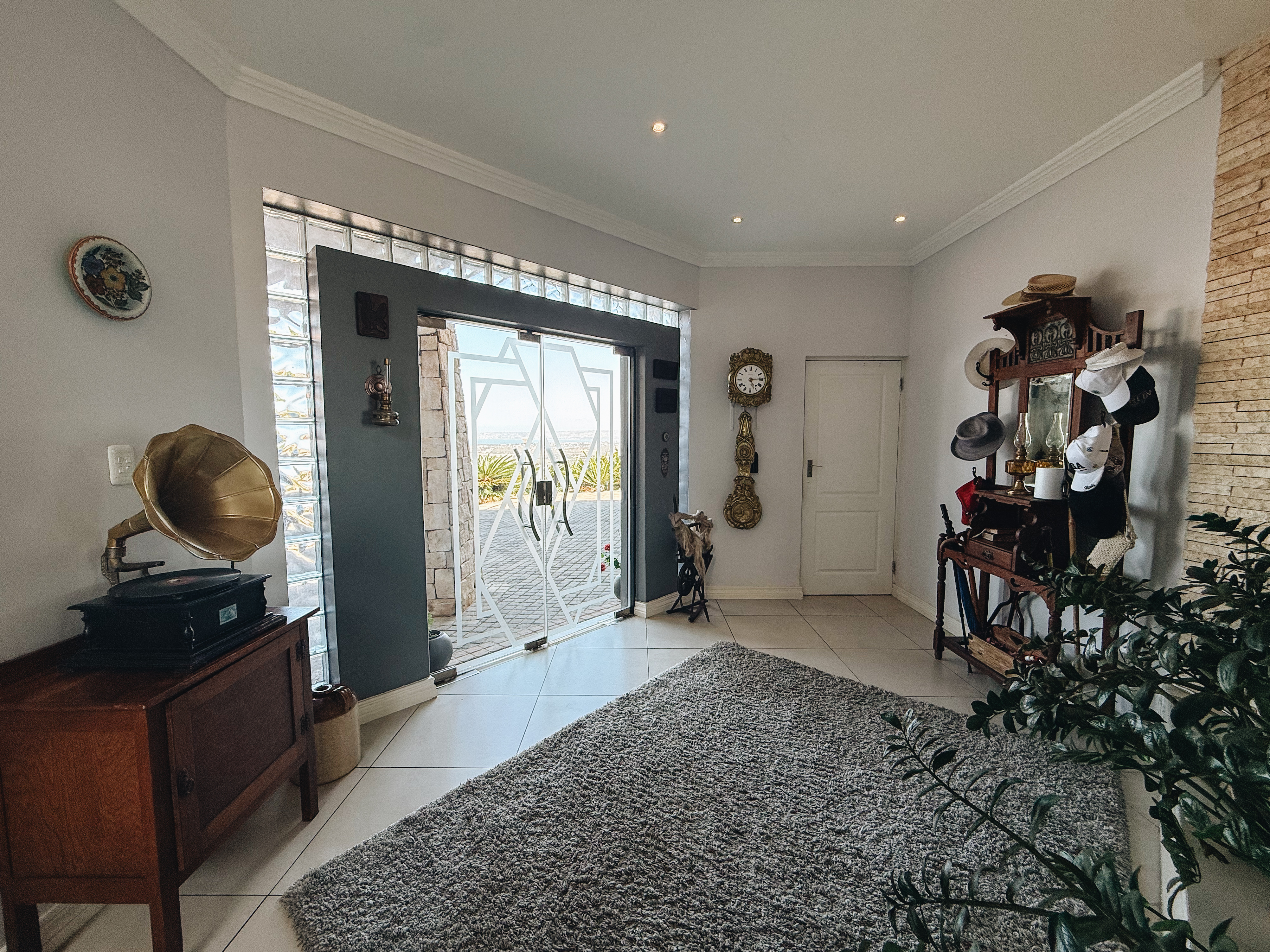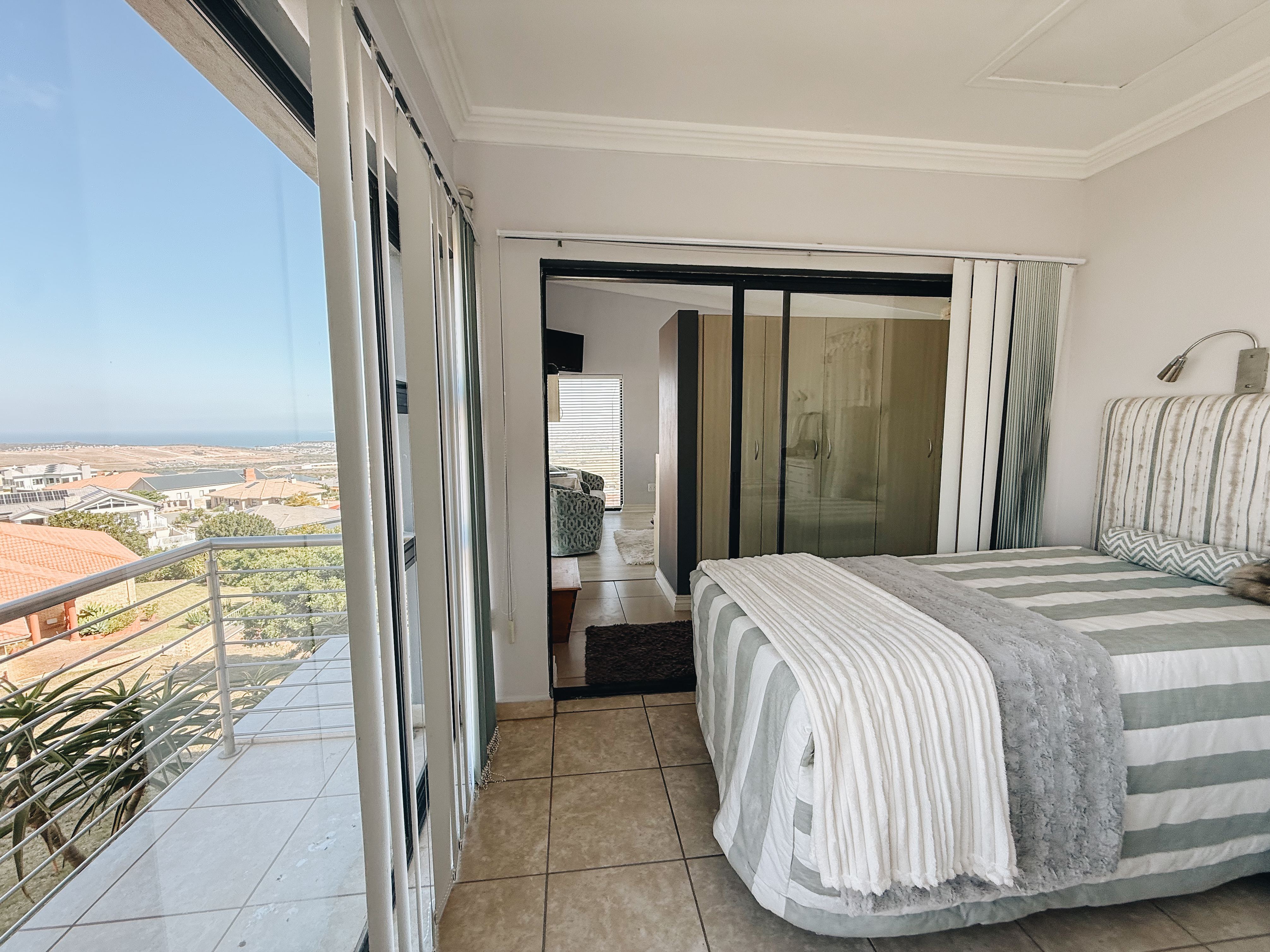 The expansive entertainment area features a stainless-steel braai and an unobstructed sea view that can be enjoyed even when the sleek frameless glass panels are closed.