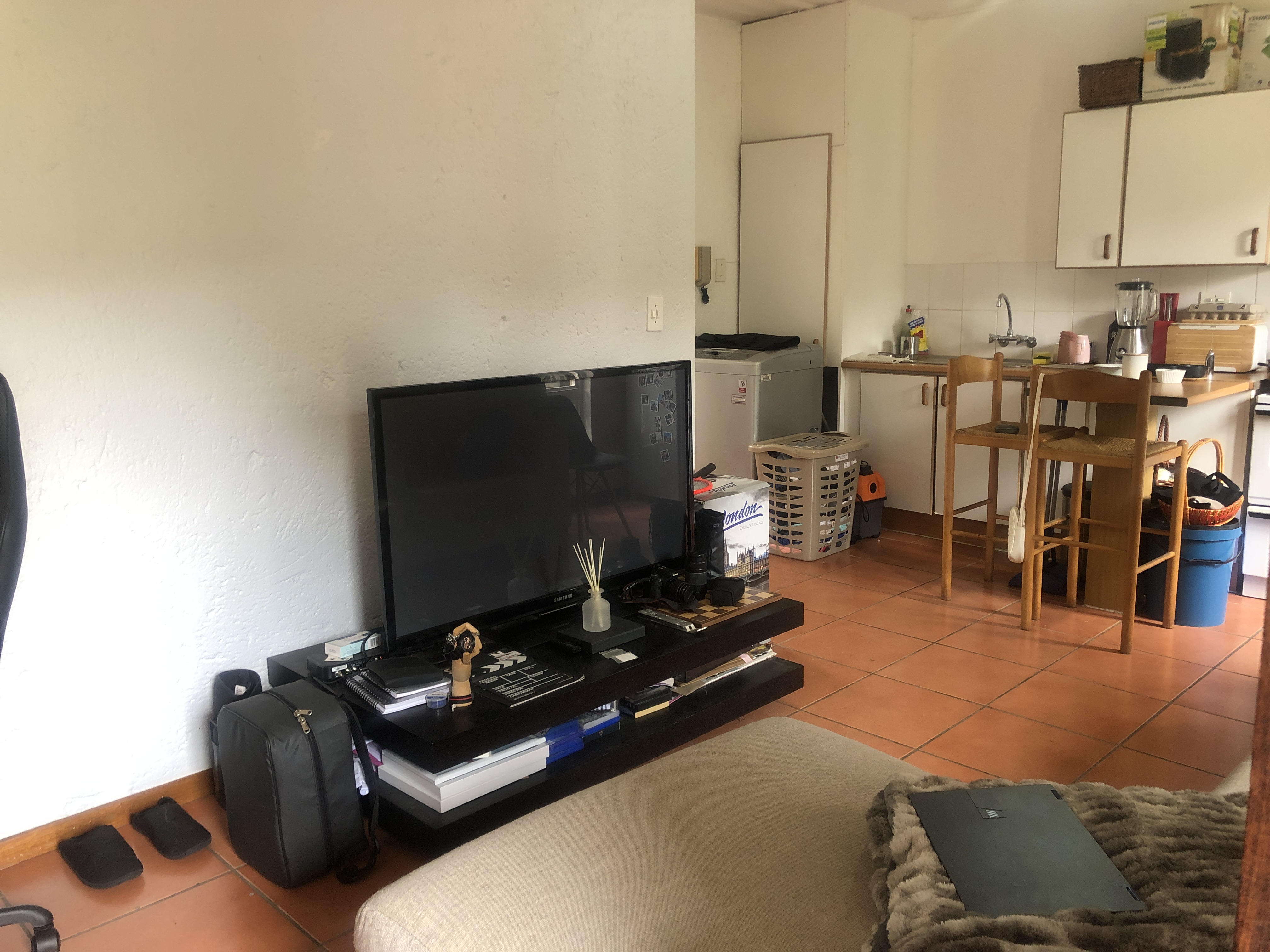 The open-plan, tiled lounge and dining area lead to a neat kitchen, with space for both a fridge and washing machine. The bathroom includes a bath/shower in bath, washbasin, and toilet. One spacious bedroom.