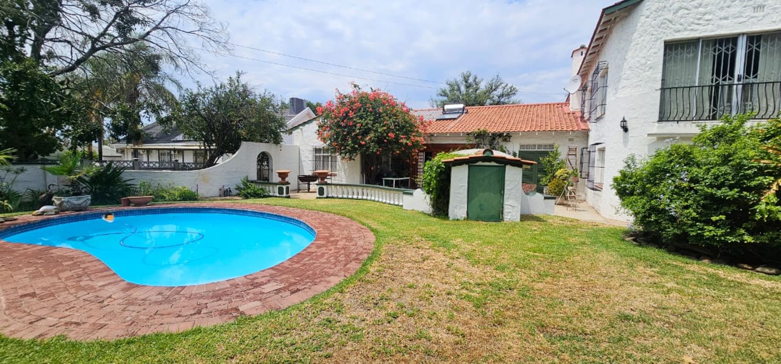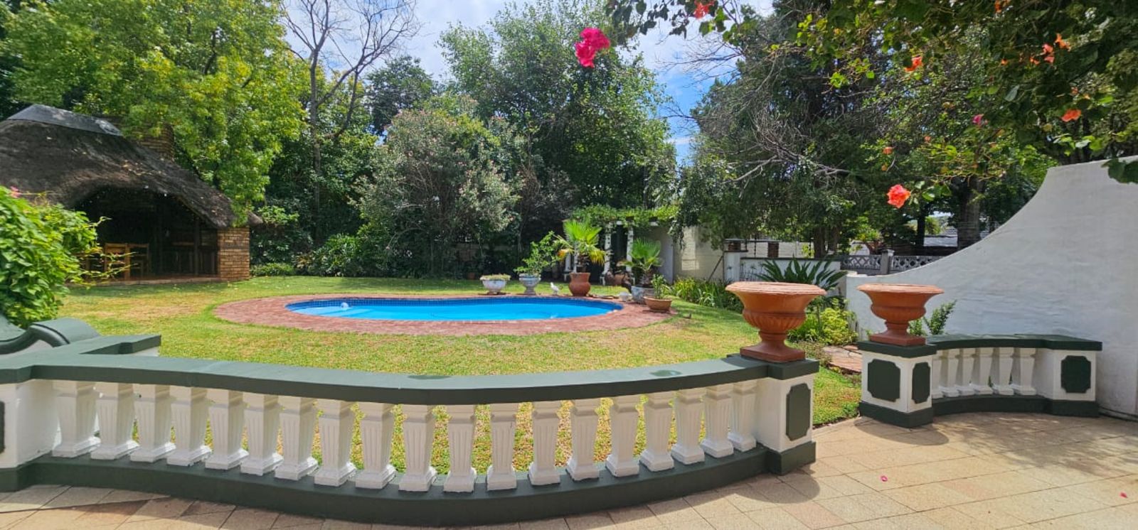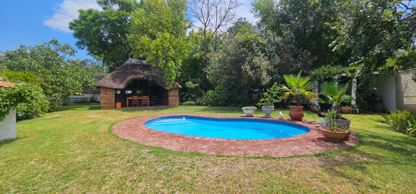 The well-appointed kitchen is fitted with built-in cupboards, an eye-level oven, a gas hob, and an extractor fan, making meal preparation a delight. Step outside to an inviting outdoor entertainment area, complete with a sparkling swimming pool, a lapa with a built-in braai, and a beautifully maintained garden with an irrigation system.