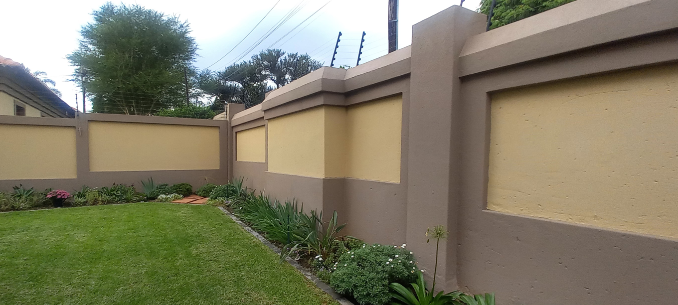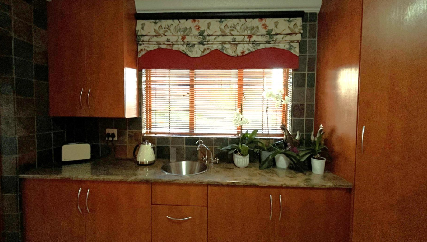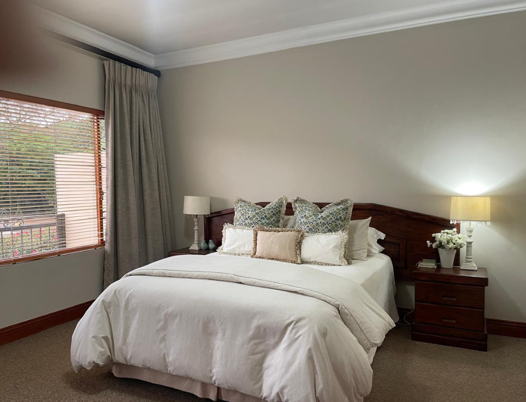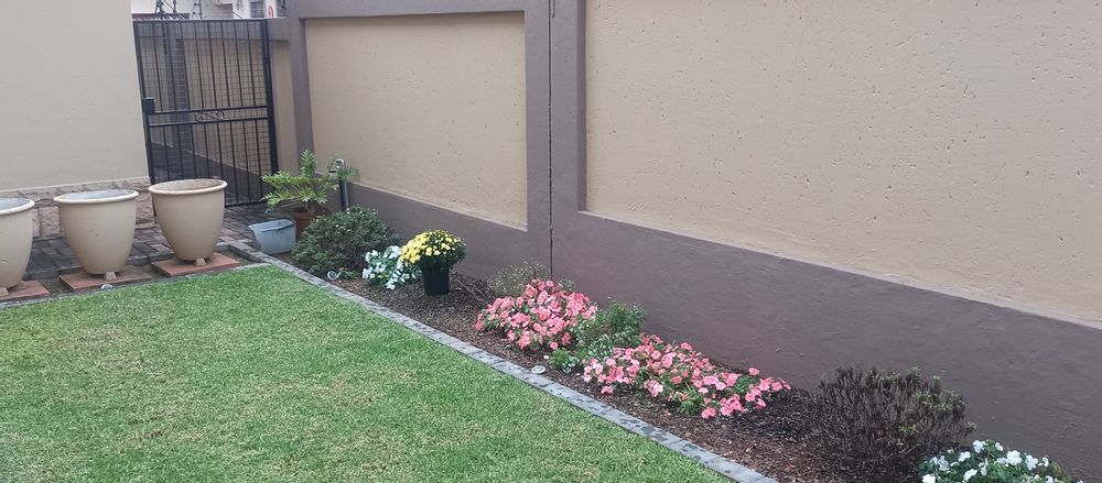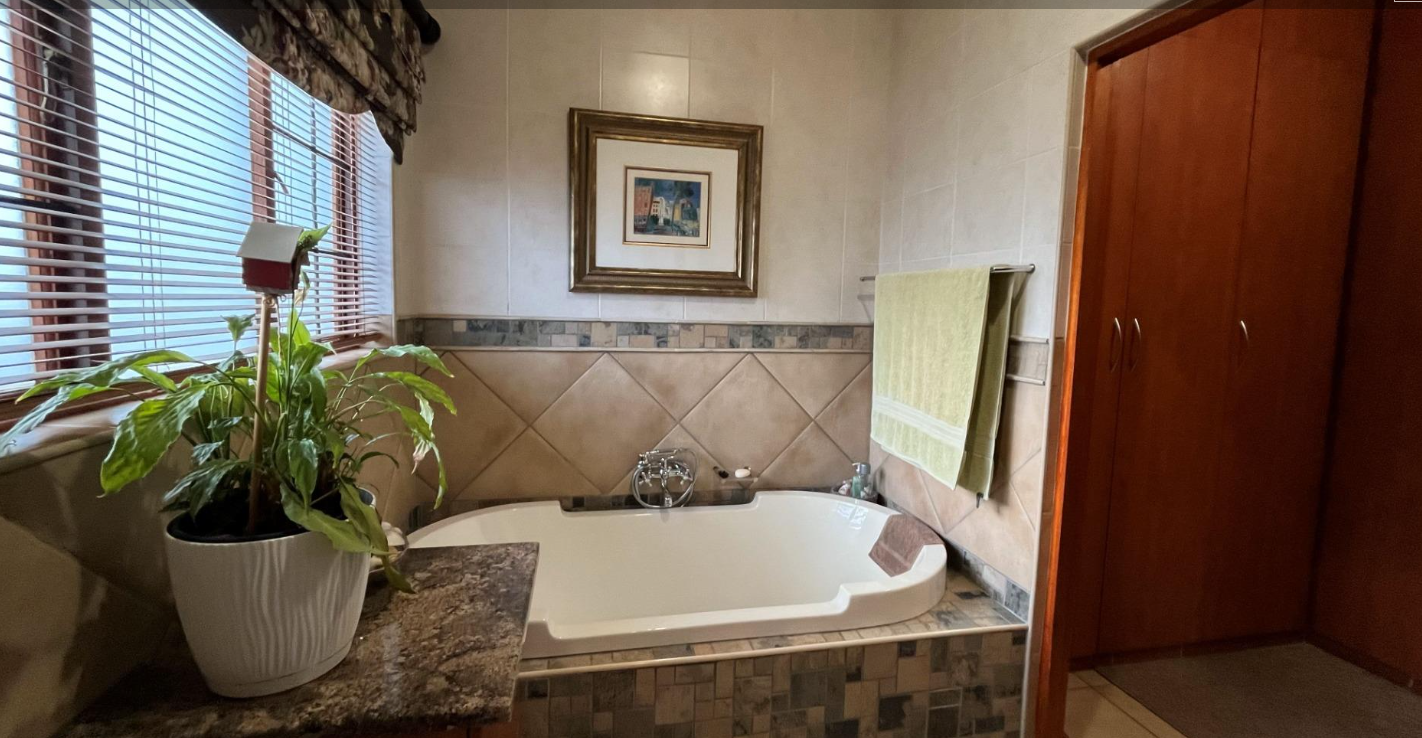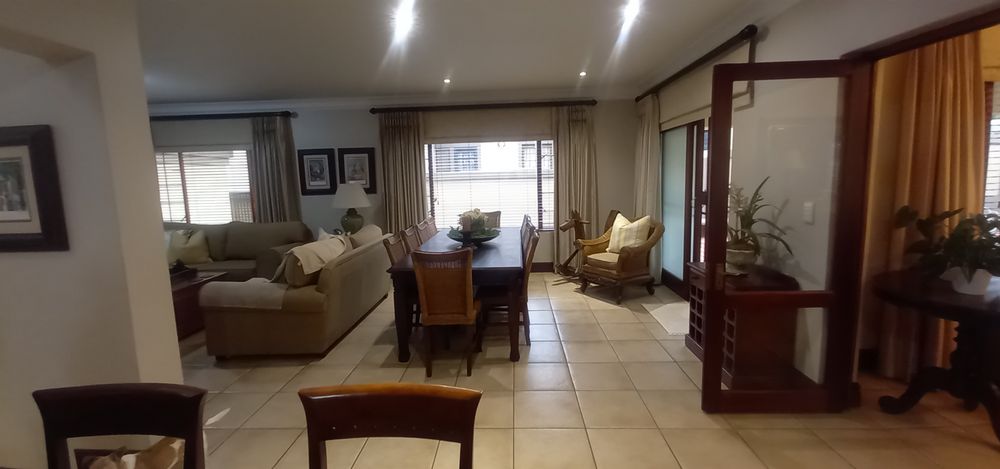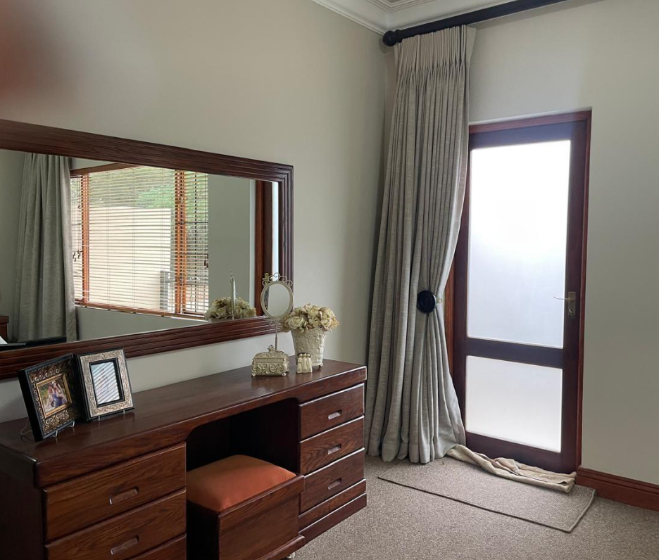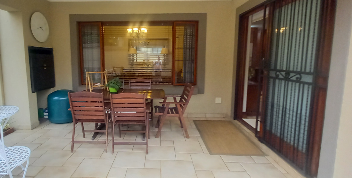 Step outside to the covered patio, ideal for relaxation and entertaining, featuring a built-in braai and boma area—perfect for outdoor dining or enjoying your morning coffee or evening glass of wine. The beautifully landscaped garden enhances the home's sophisticated ambiance.