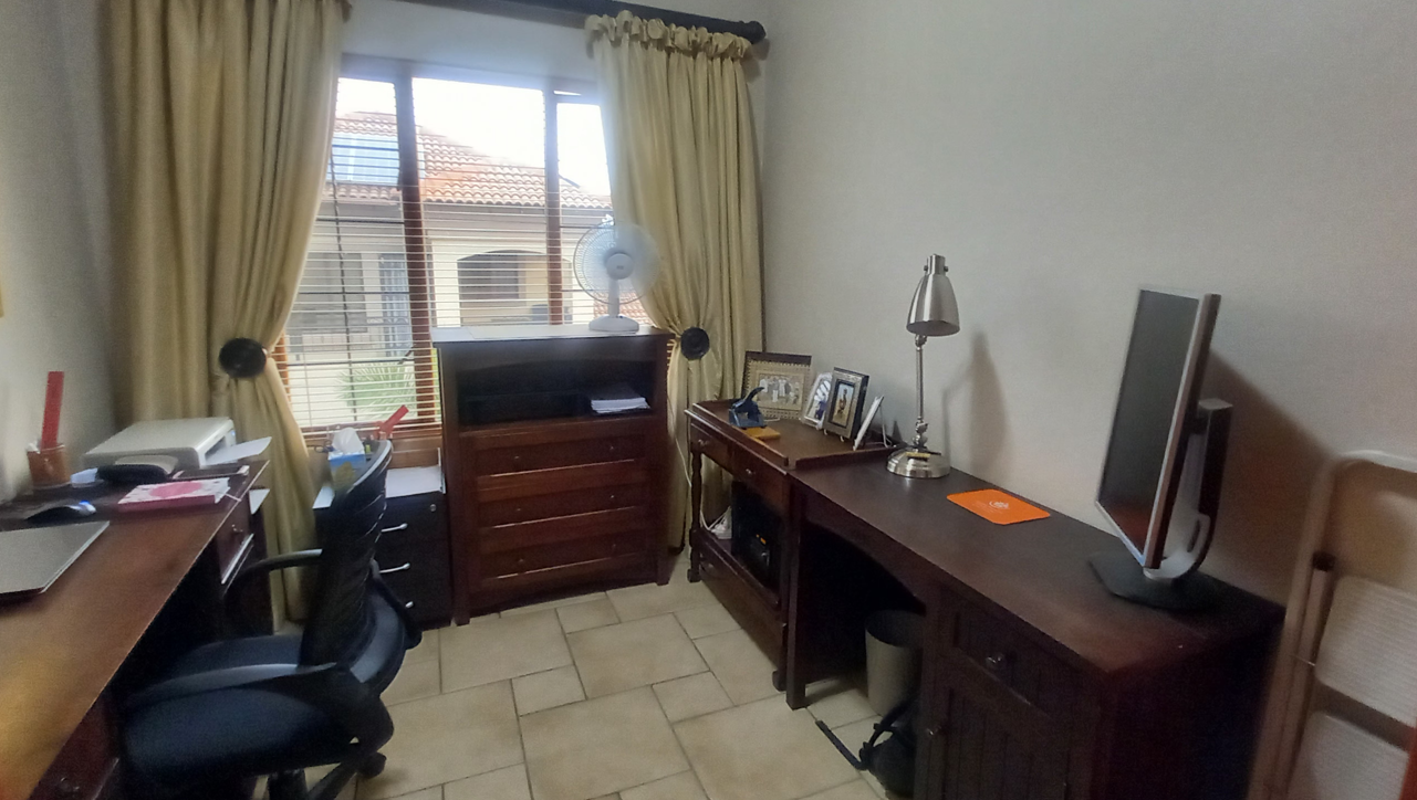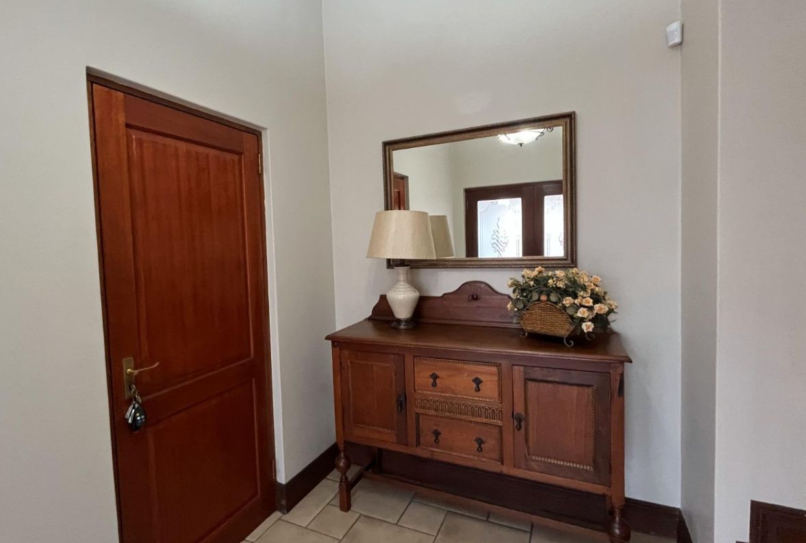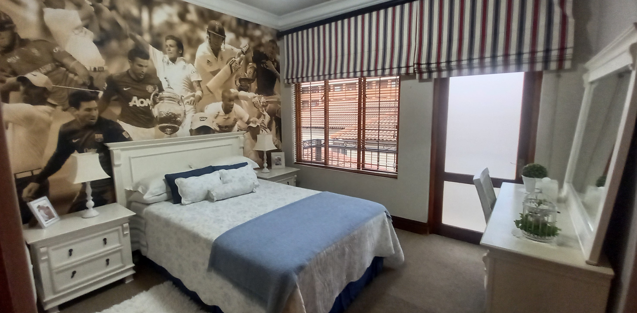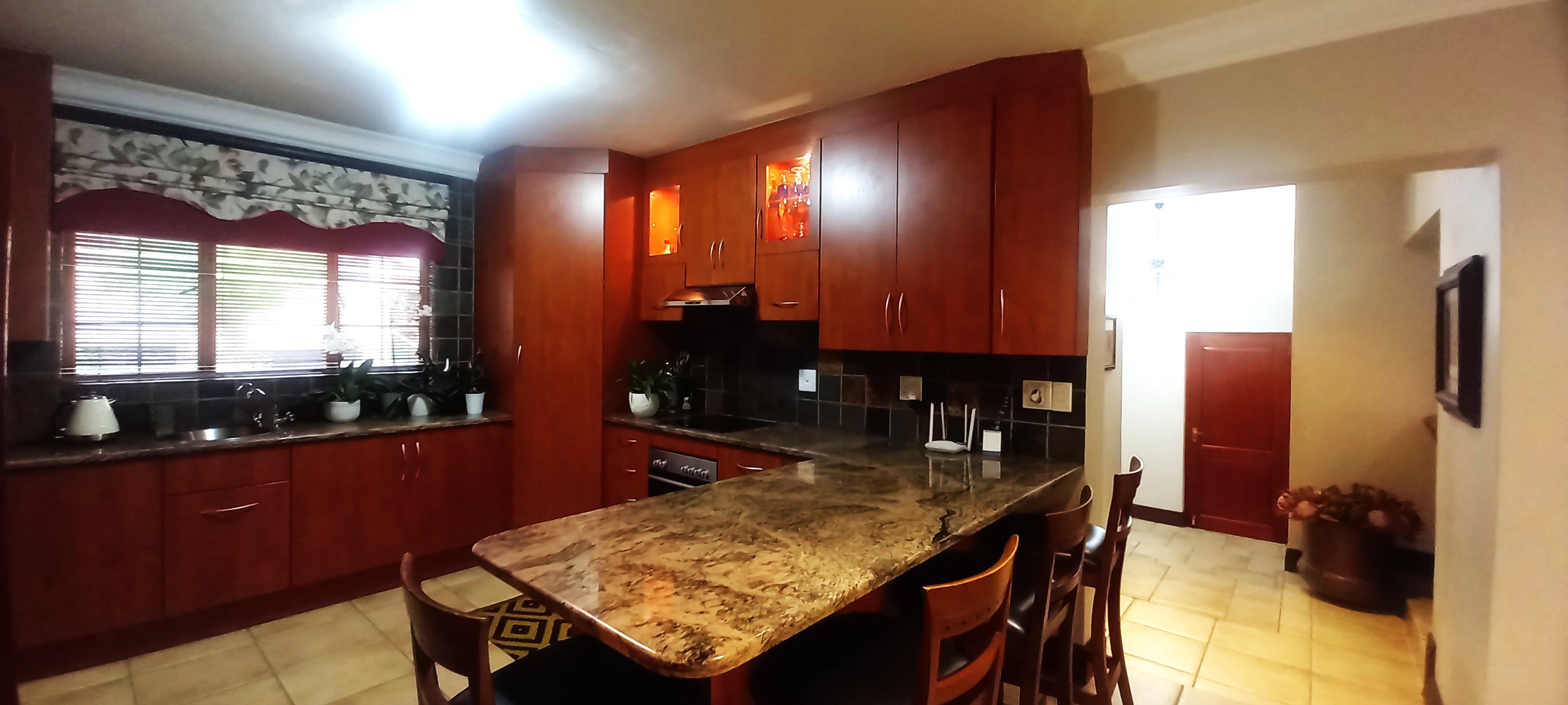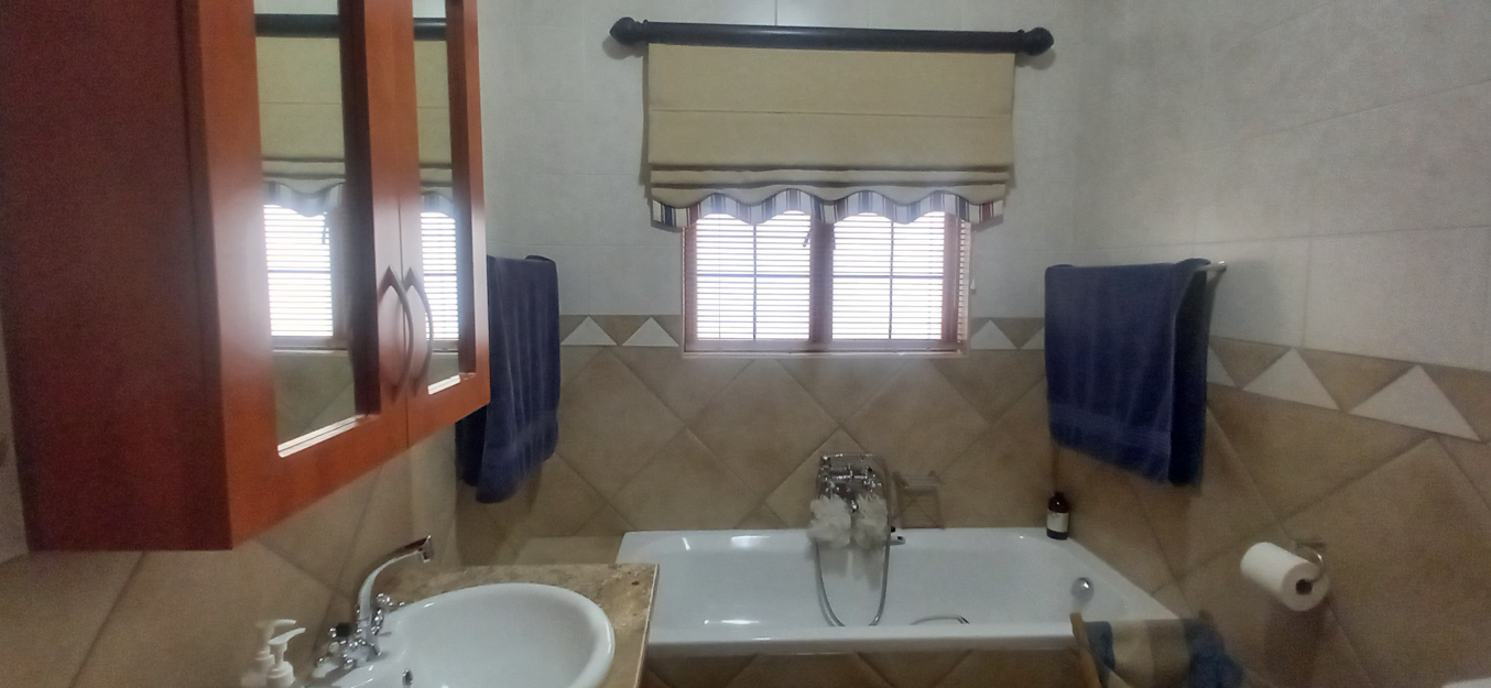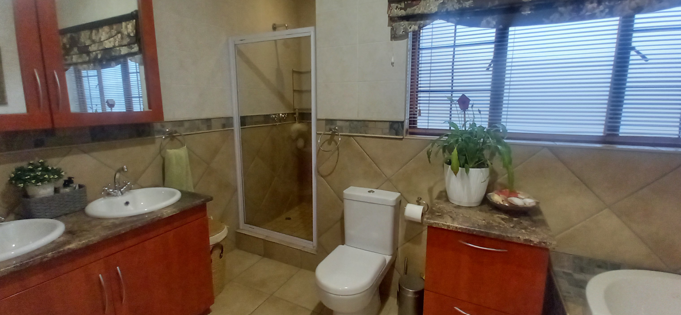 Step outside to the covered patio, ideal for relaxation and entertaining, featuring a built-in braai and boma area—perfect for outdoor dining or enjoying your morning coffee or evening glass of wine. The beautifully landscaped garden enhances the home's sophisticated ambiance.