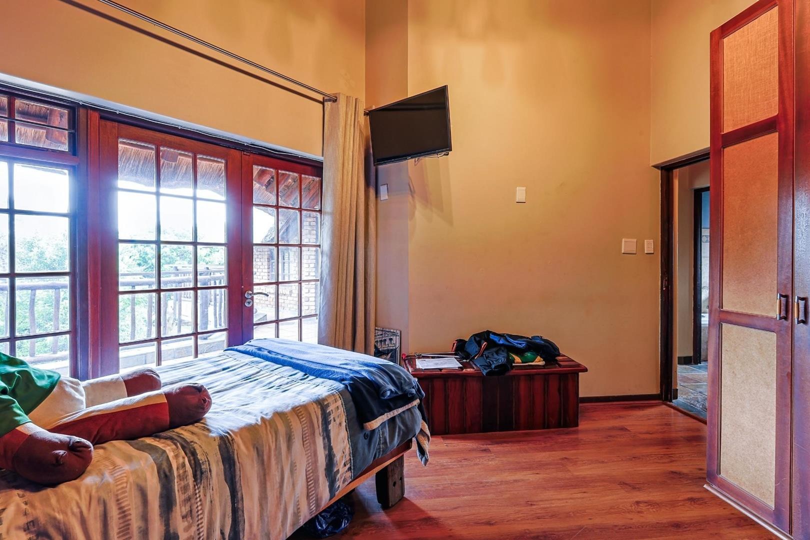 All five bedrooms open onto a wraparound balcony showcasing sweeping panoramic views — a rare luxury that reinforces the feeling of living in an exclusive safari lodge.