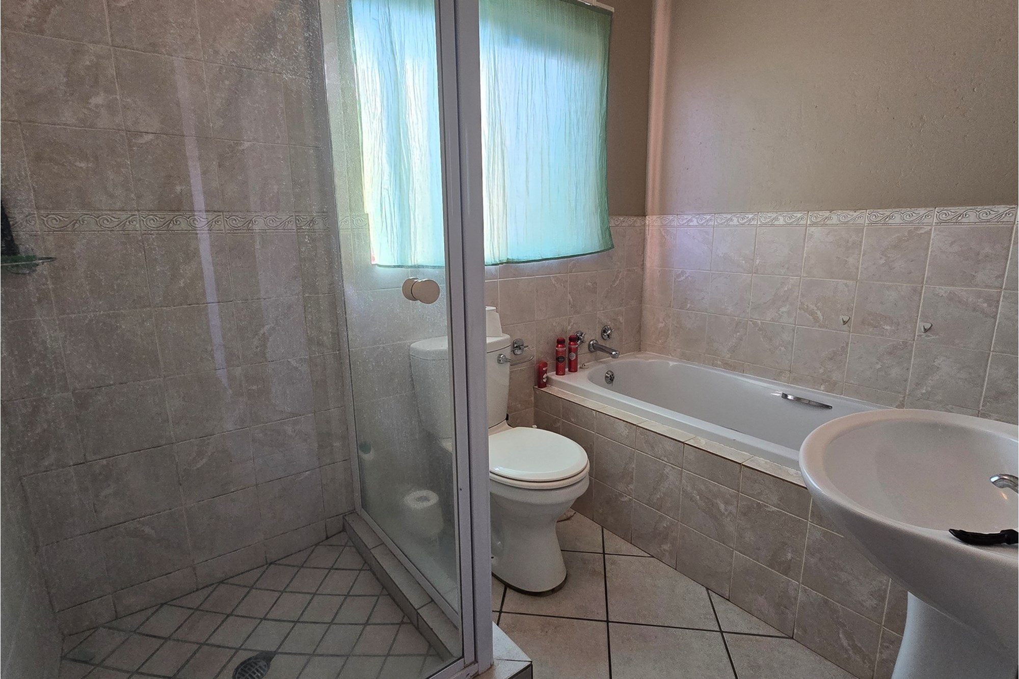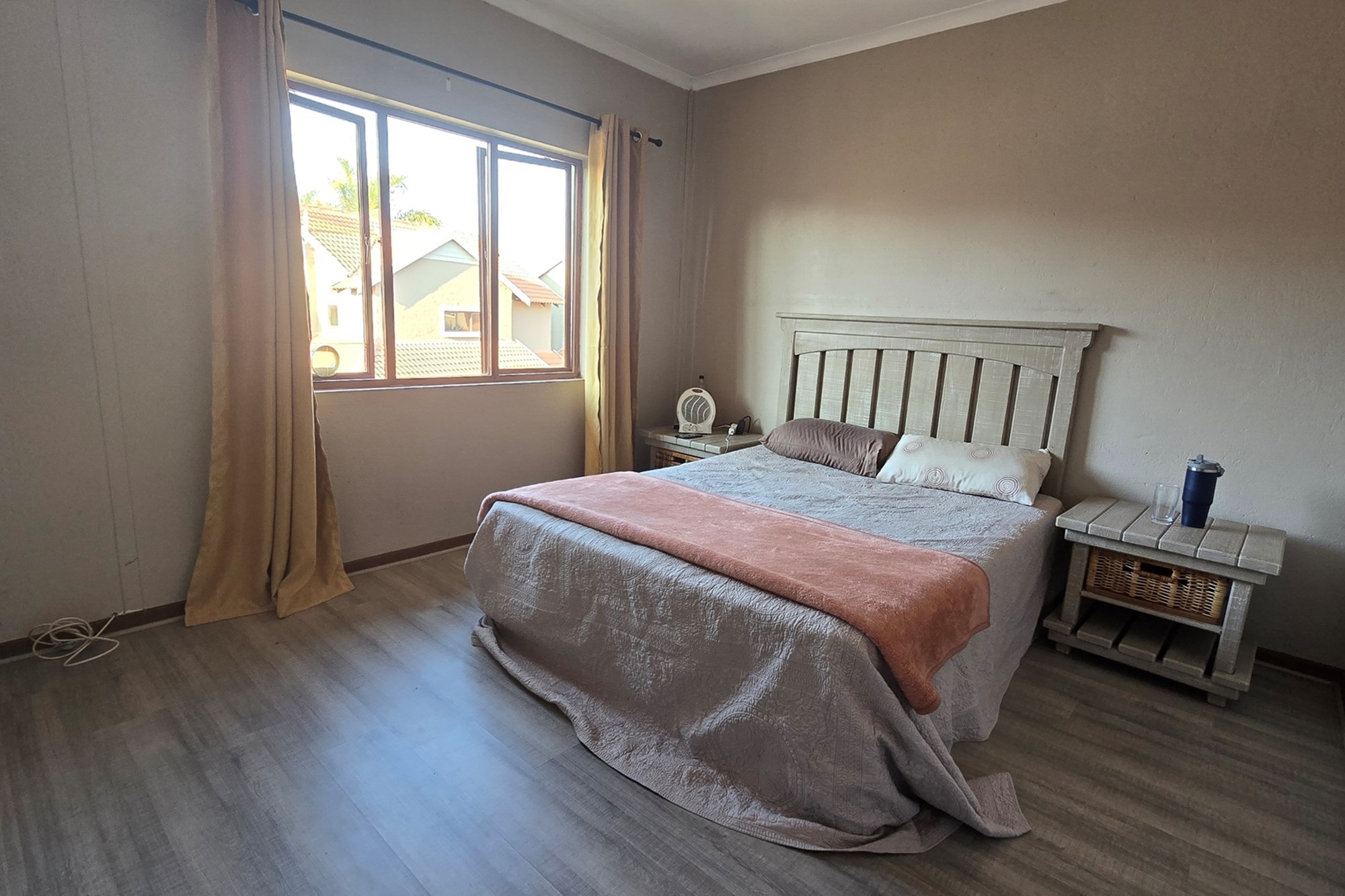 Upstairs you will find the two bedrooms with modern laminated floors. Both with built-in cupboards and the full tiled bathroom complete with a basin, shower, bath and toilet.