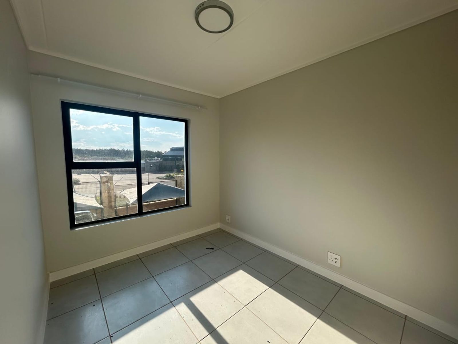 All three bedrooms are generously sized with built-in cupboards. The main bedroom features an en-suite bathroom, while the second bathroom services the remaining bedrooms. The estate offers a peaceful eco-friendly lifestyle with added security and well-maintained communal areas.