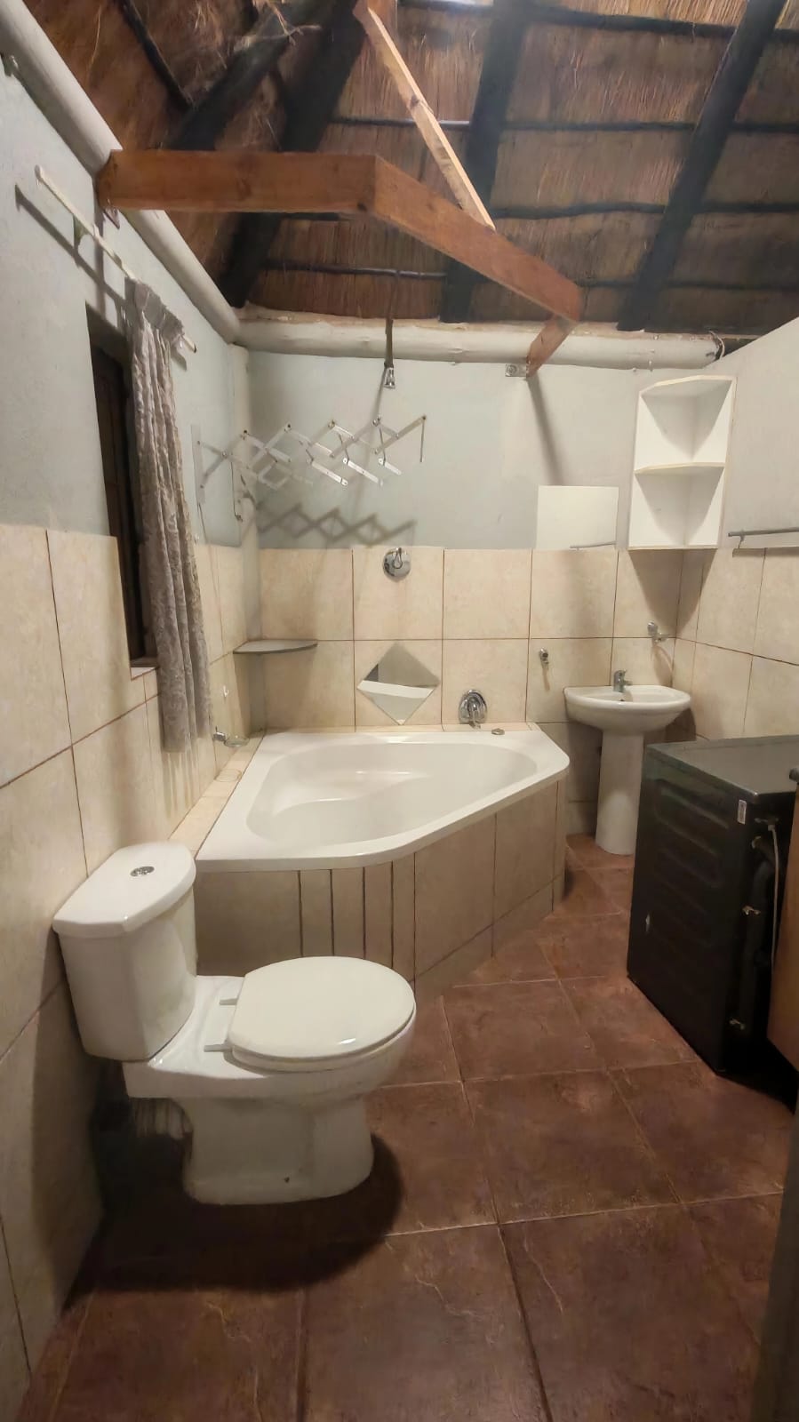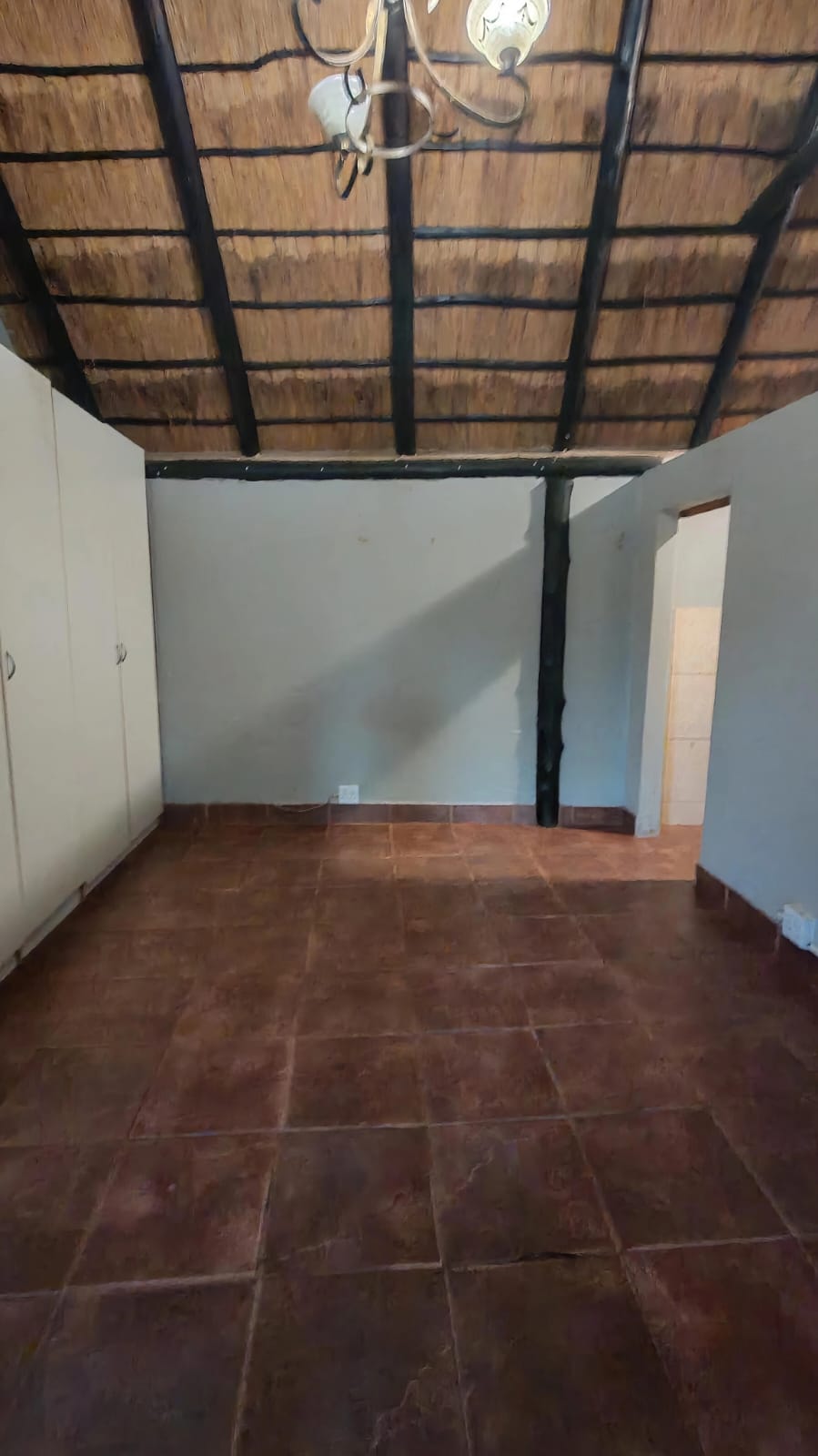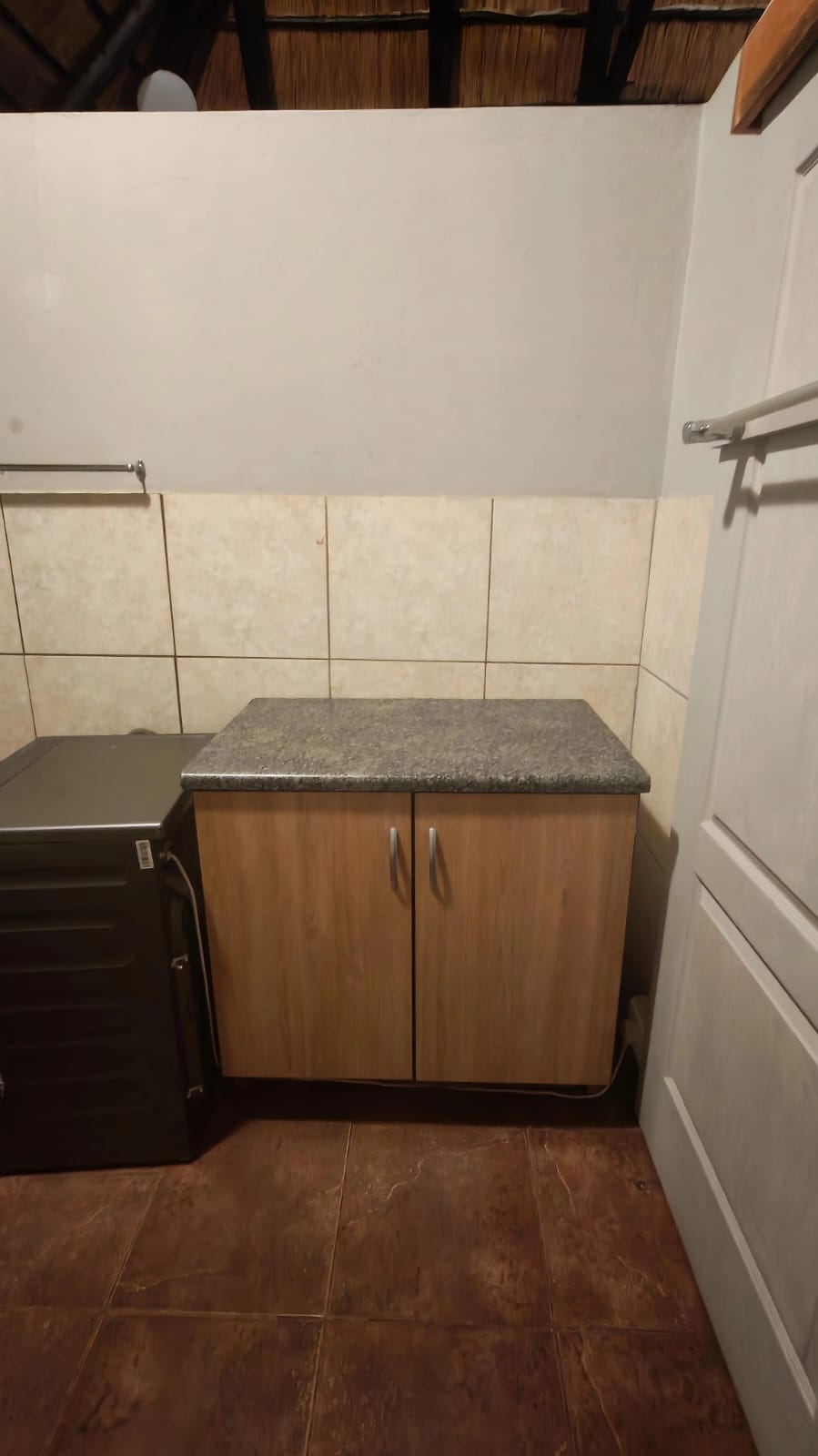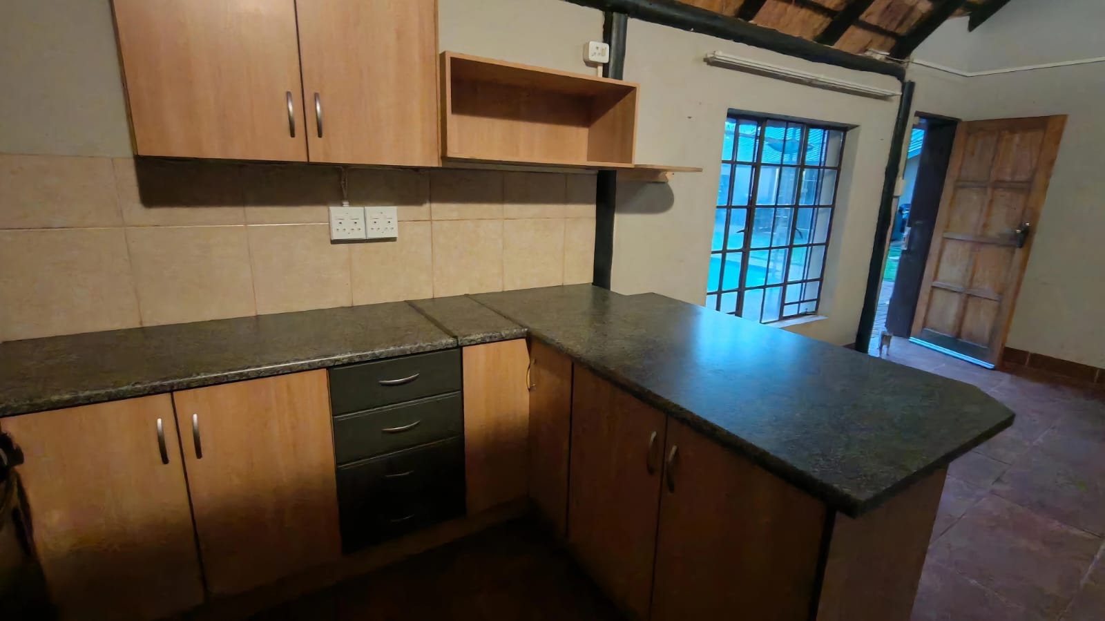 Enjoy open-plan living with a rustic kitchen featuring a gas stove and built-in cupboards for all your storage needs.