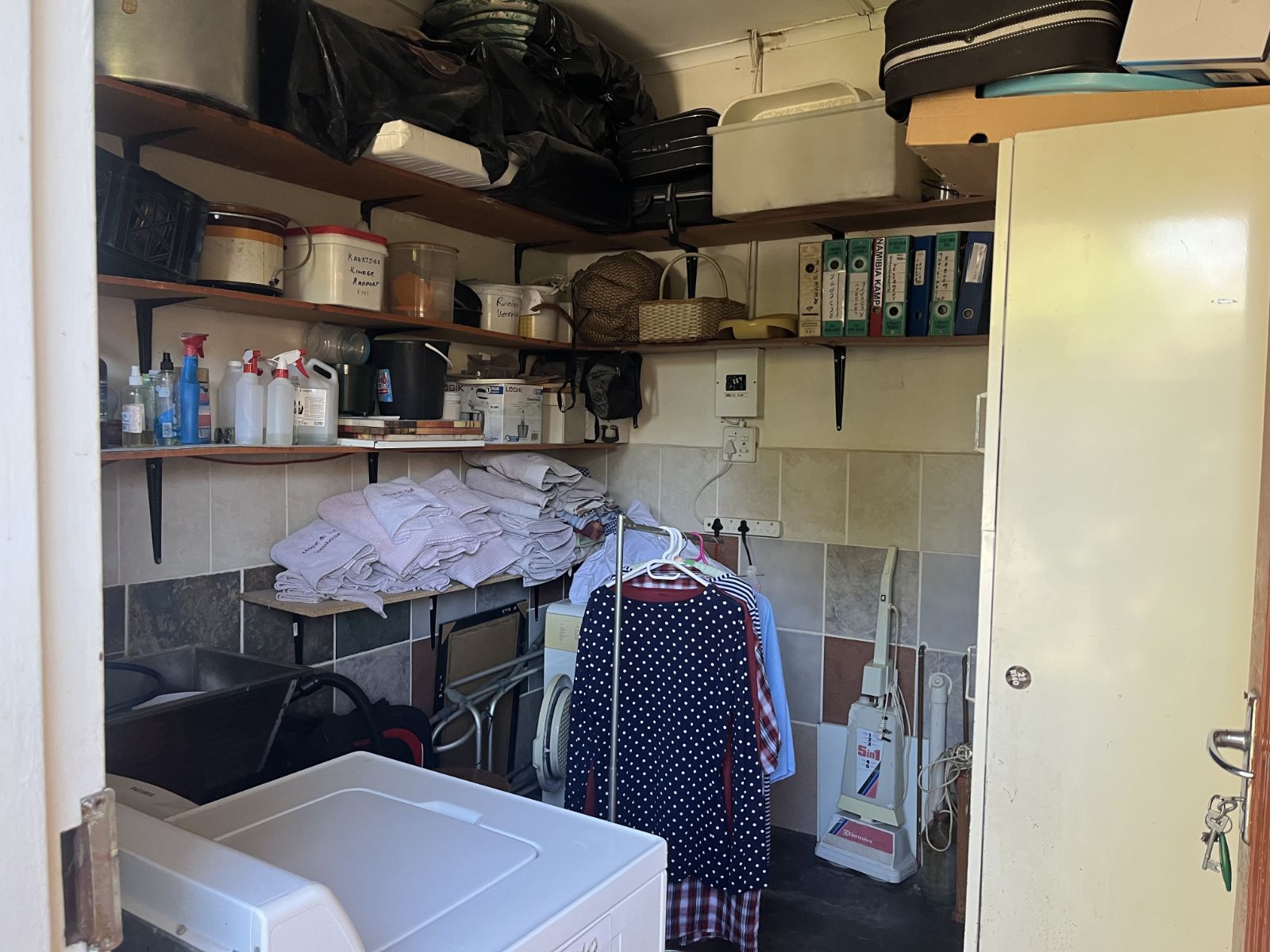 The home boasts a spacious and practical kitchen with ample cupboard space, perfect for preparing meals for multiple guests or family members. Just outside the kitchen is a separate laundry room, keeping the household running smoothly and efficiently.
