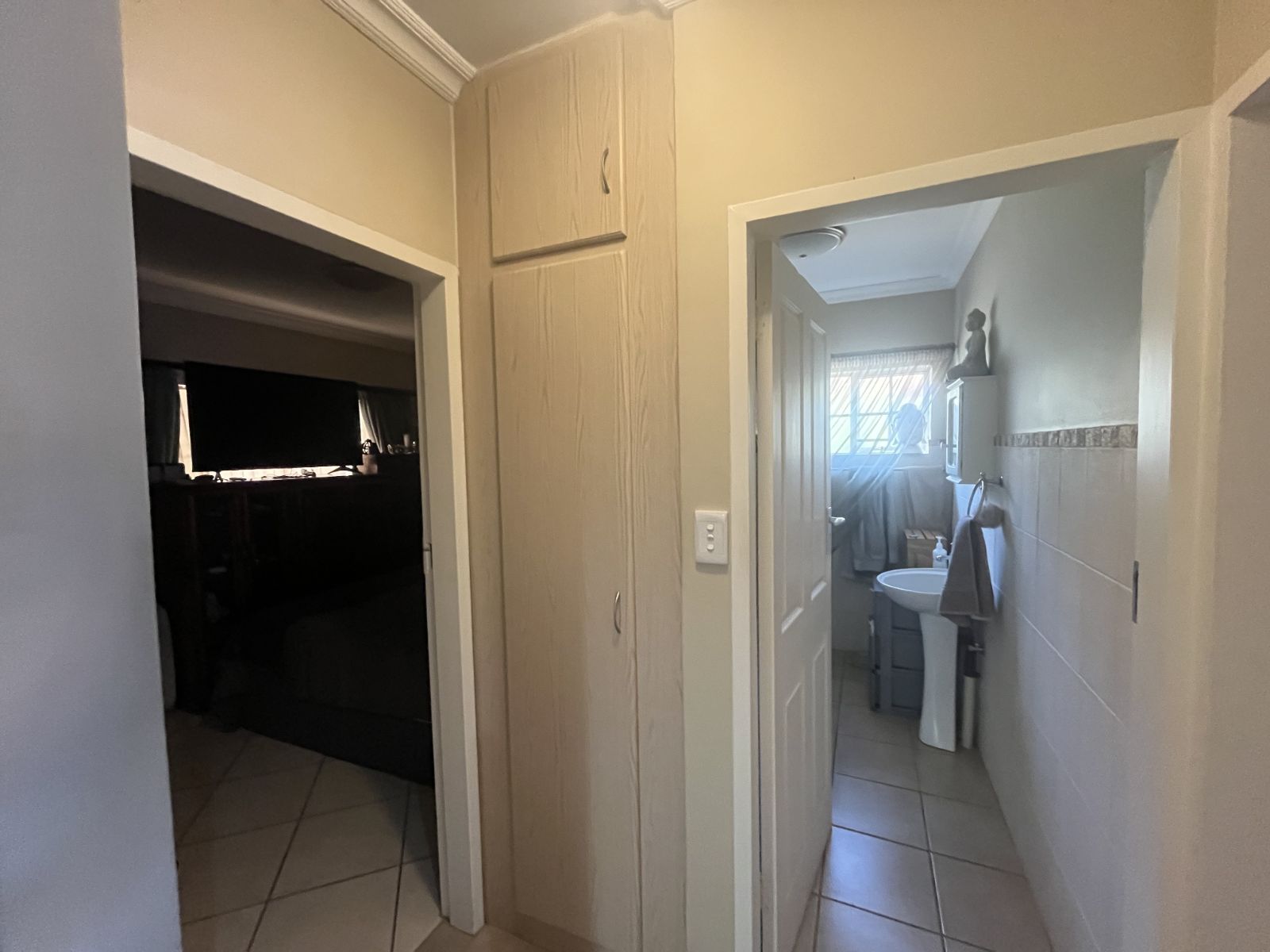 The home features three spacious bedrooms, each with built-in cupboards. The master bedroom includes a full en-suite bathroom with bath, shower, basin, and toilet. The second bathroom offers a shower, basin, and toilet. A linen cupboard in the hallway adds to the home’s storage solutions.