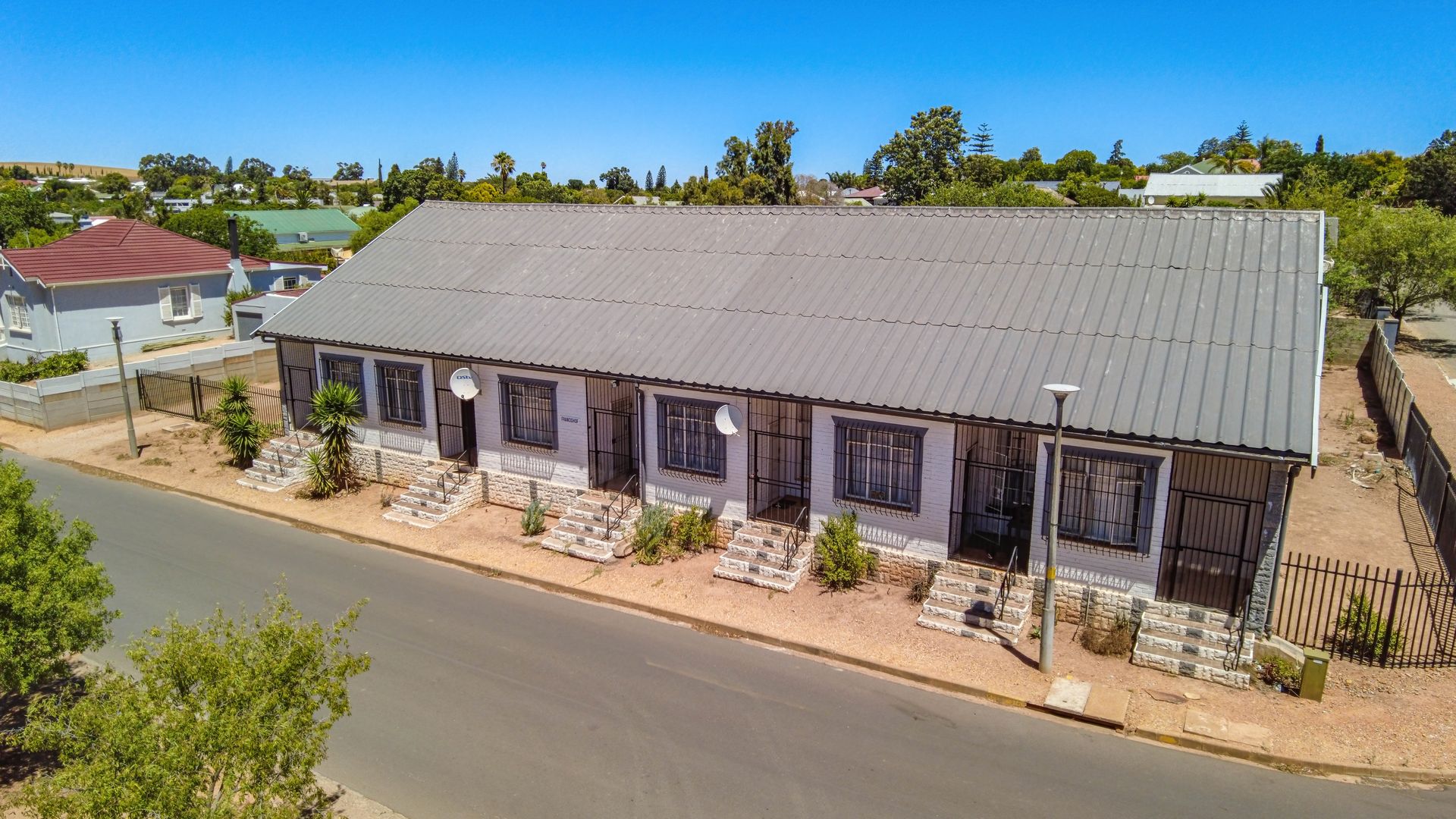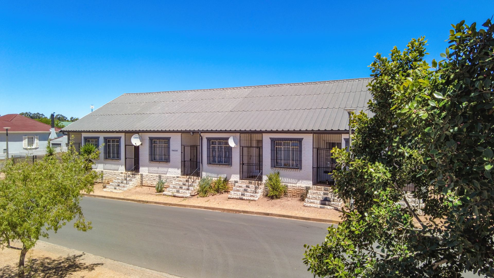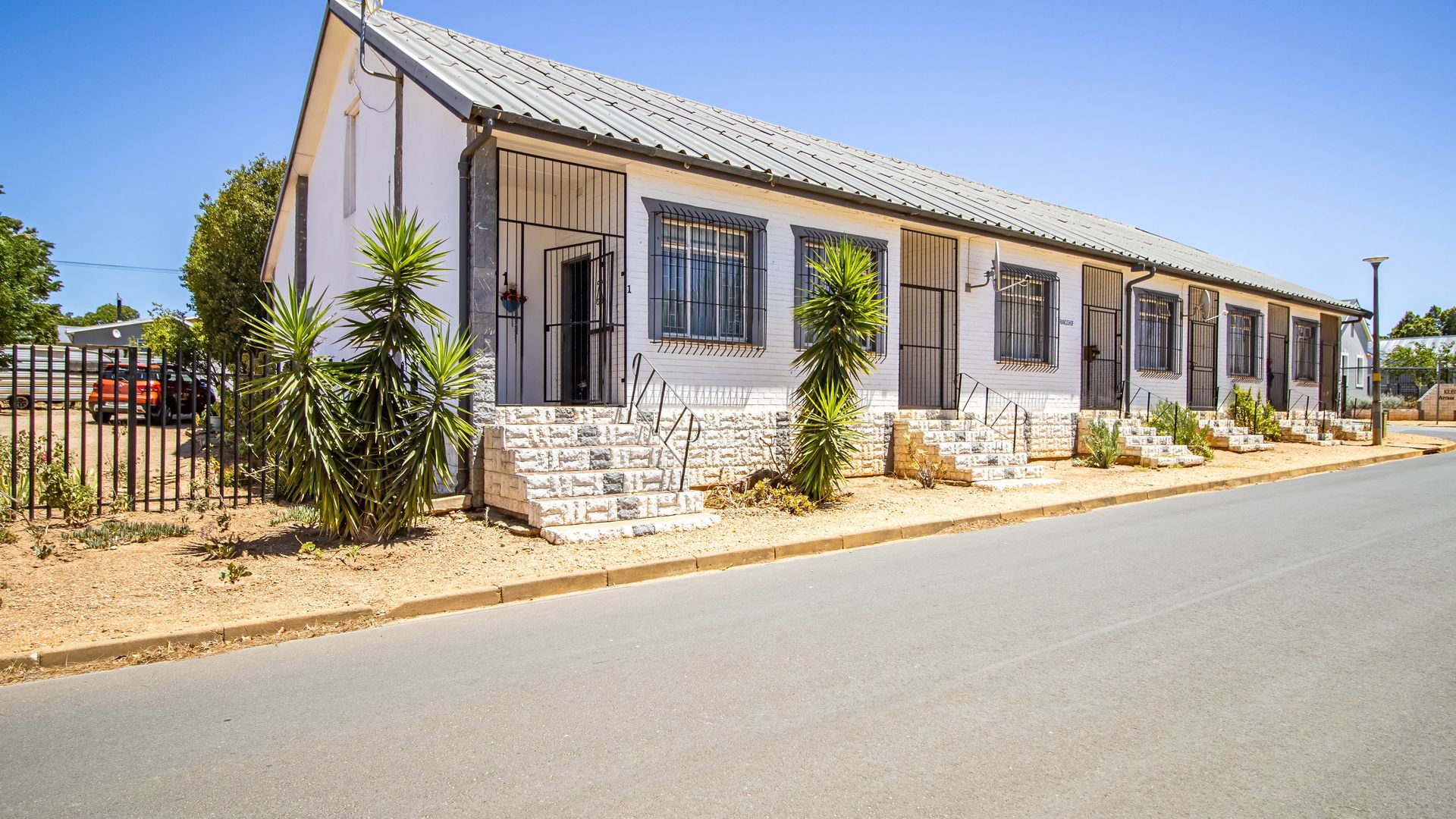 This well-positioned property presents an excellent investment opportunity, offering six ground-level residential units designed for comfort and practicality. Five of the units feature full bathrooms with bathtubs, while one unit is fitted with a shower. Each unit includes a bedroom, bathroom, entrance hall, and a spacious open-plan lounge, kitchen, and dining area, creating a welcoming flow throughout the home. A charming stoep adds outdoor living appeal, perfect for relaxation.