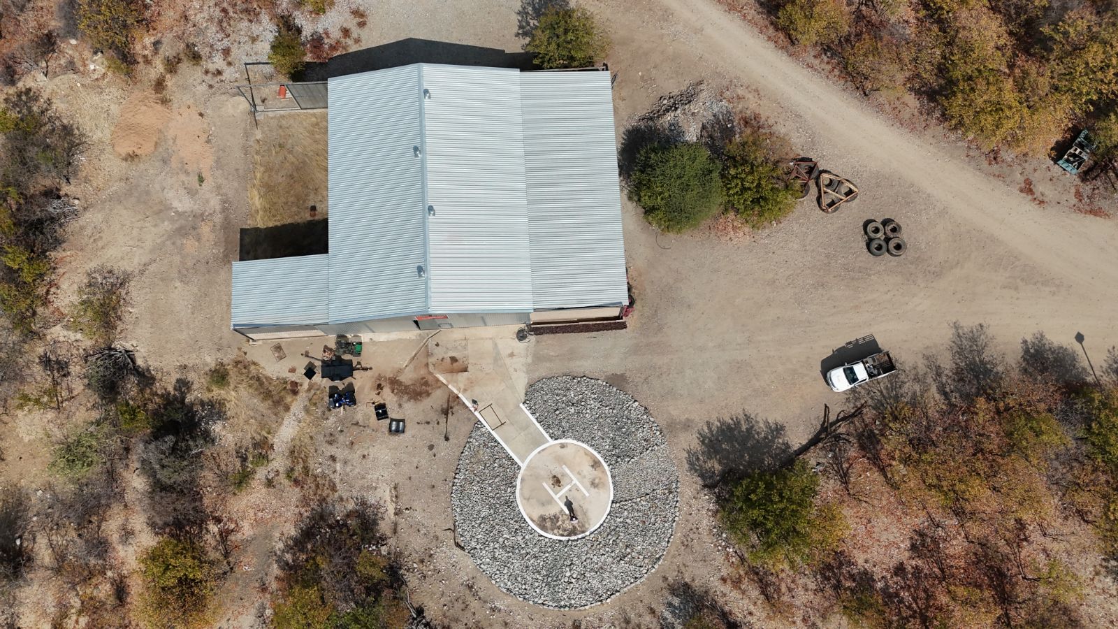 Main Farmhouse Complex: Includes a large hangar, residential camp, and open-plan living designed for seamless indoor-outdoor lifestyle.