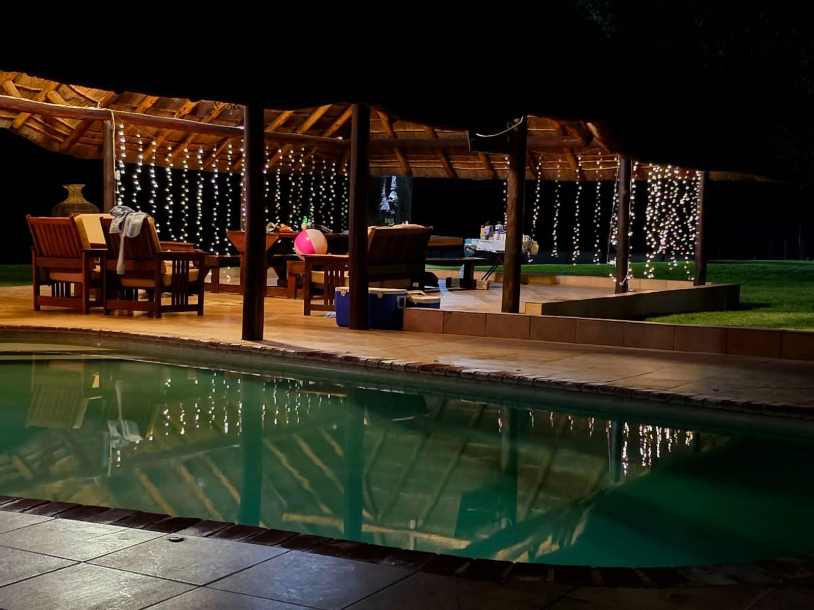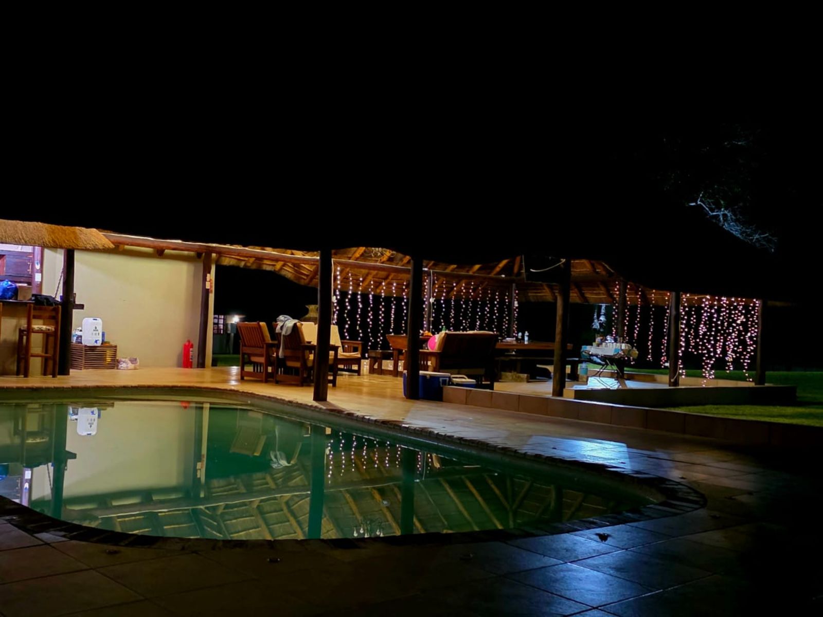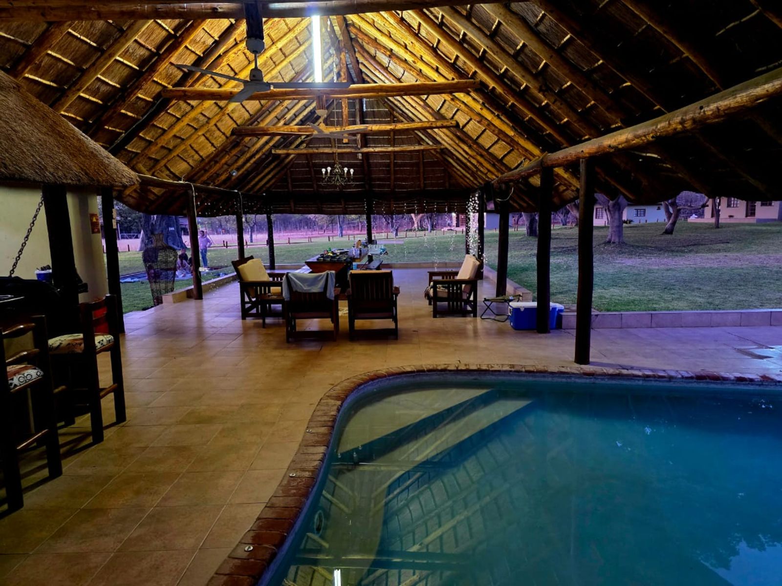 Large thatch-roof lapa with swimming pool, bar, landscaped gardens & play area