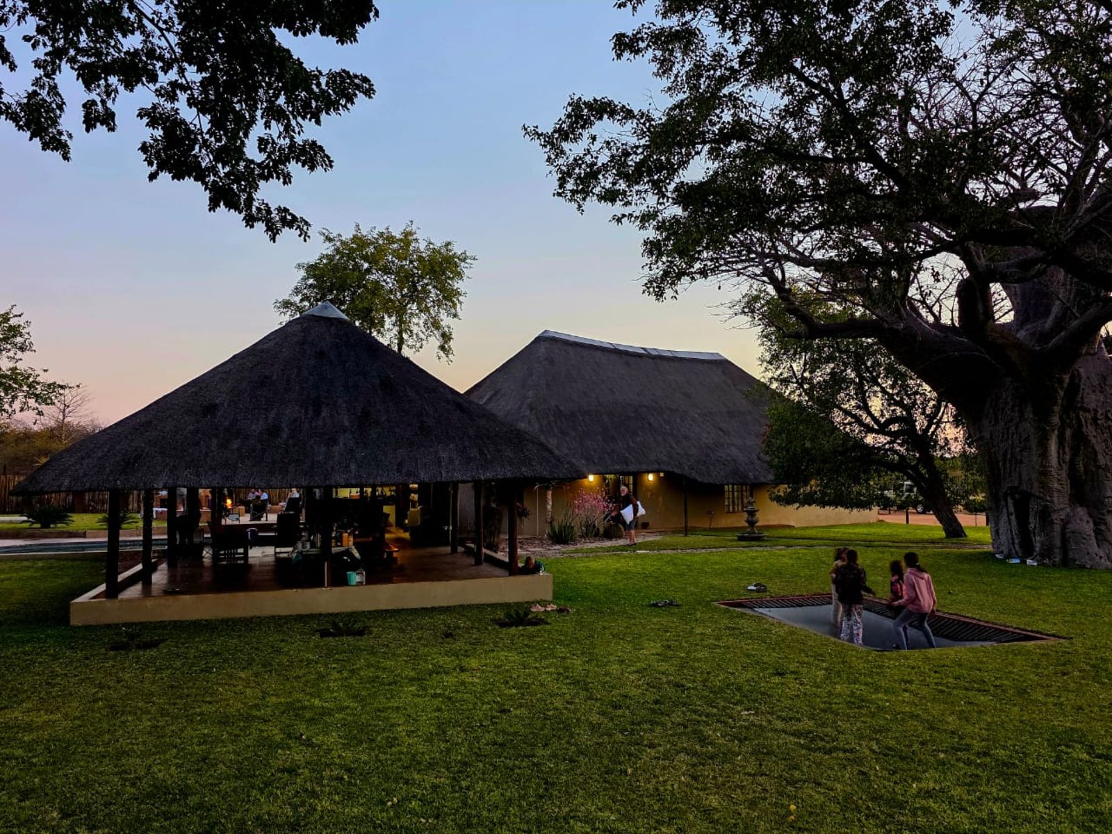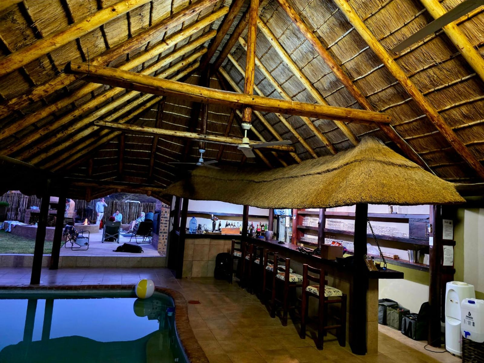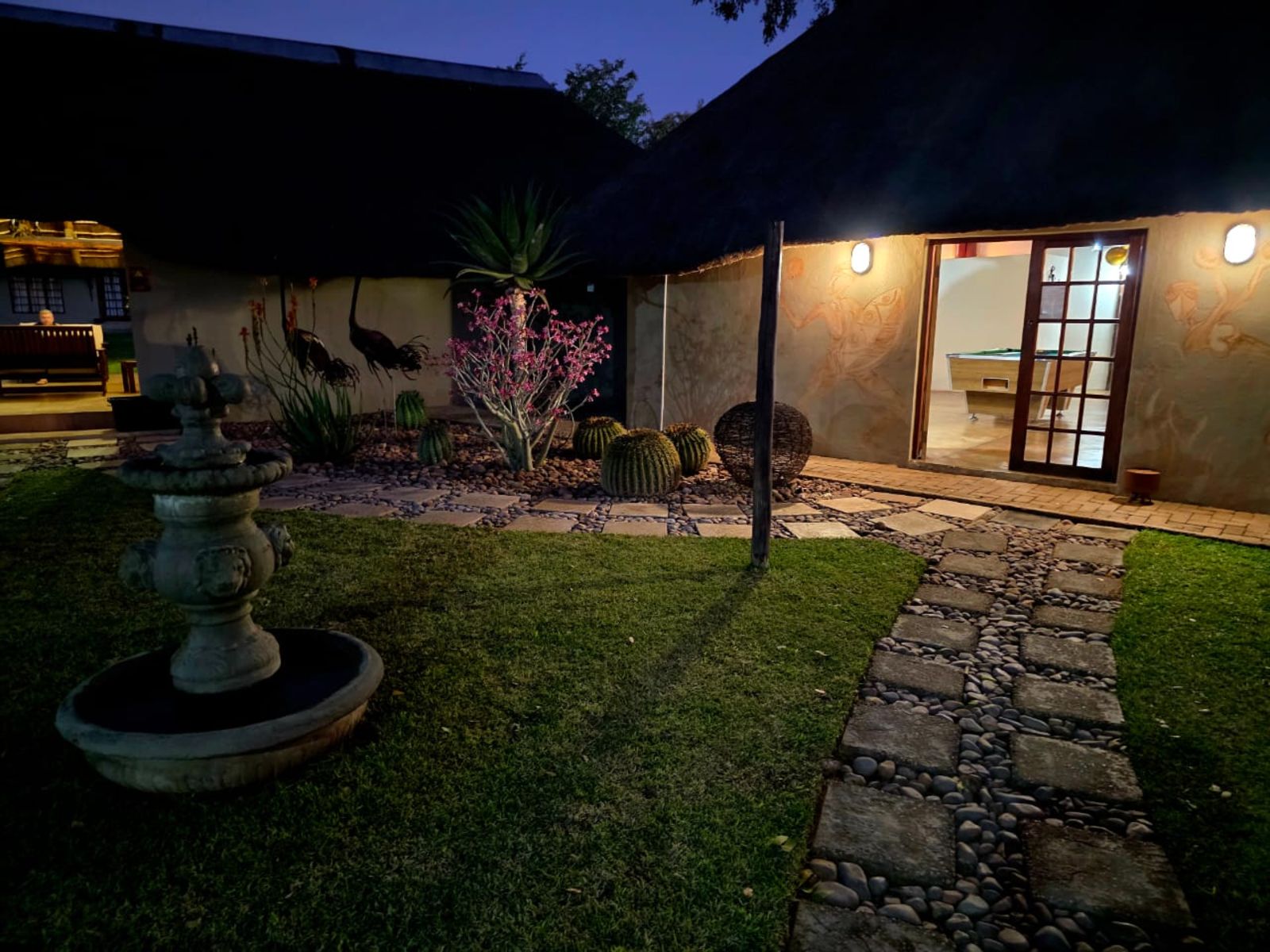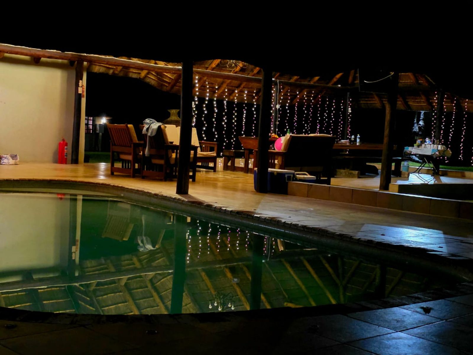 Large thatch-roof lapa with swimming pool, bar, landscaped gardens & play area