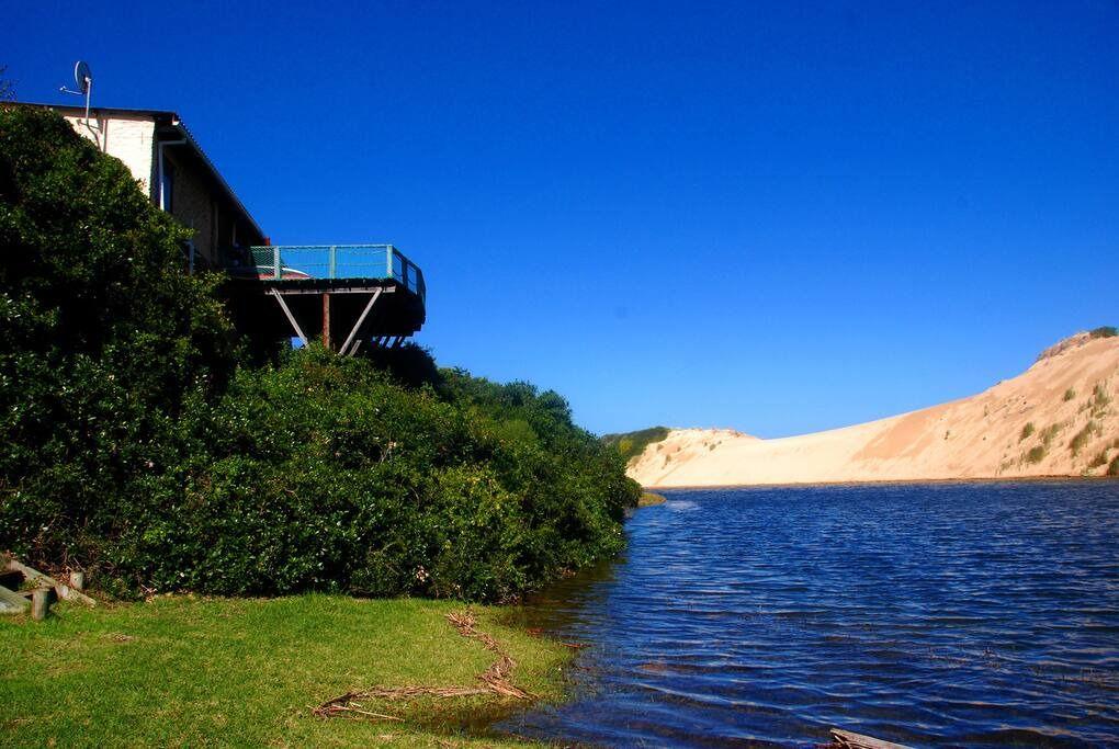 The vast wooden decks showcase stunning panoramas of the river and dunes, transforming outdoor living into a truly enjoyable experience.