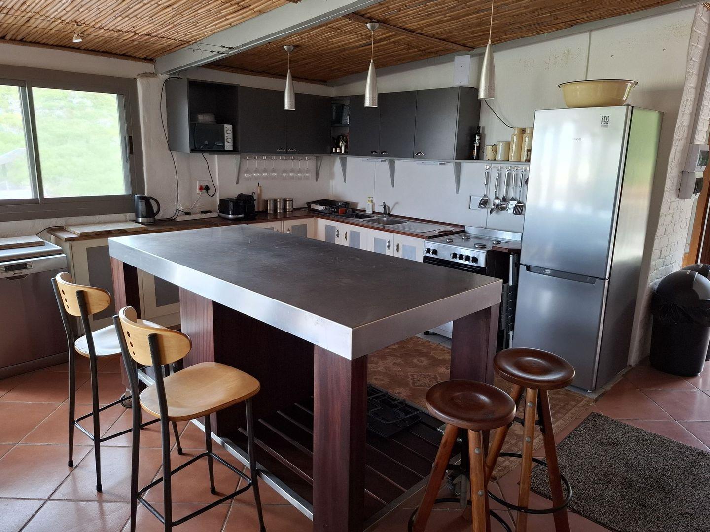The kitchen is equipped with a modern stainless-steel workbench and informal seating, making it ideal for both cooking and casual dining.