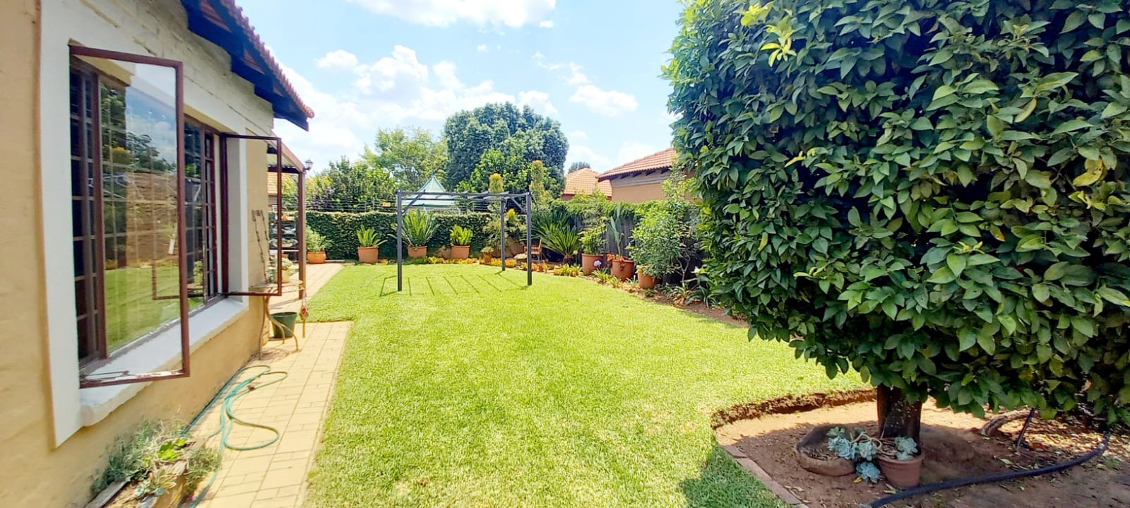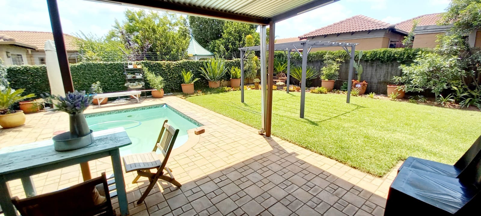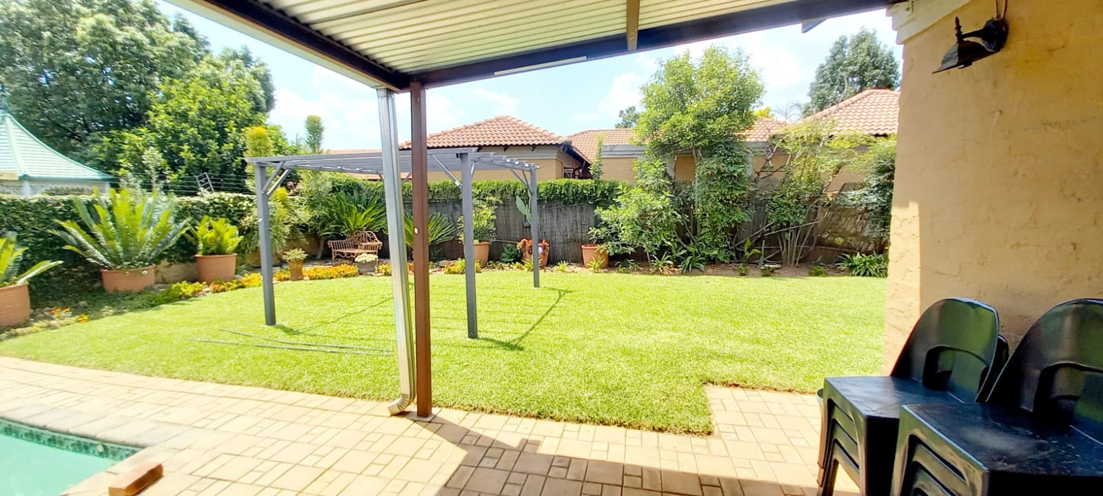 Outside is a covered carport next to the original garage, open parking space for at least 4 vehicles and 2 Wendy Houses. One is currently used as a domestic worker room and the other as a toolshed.