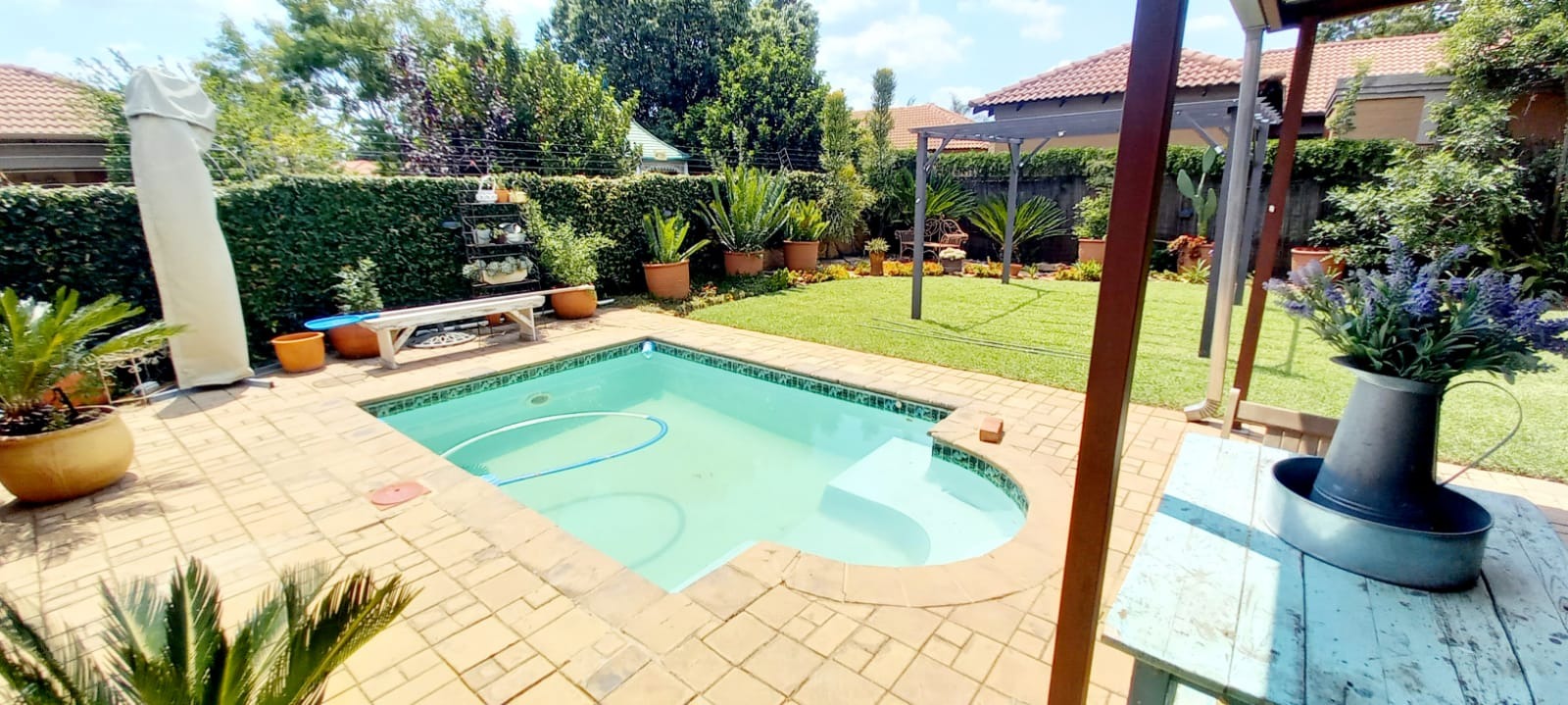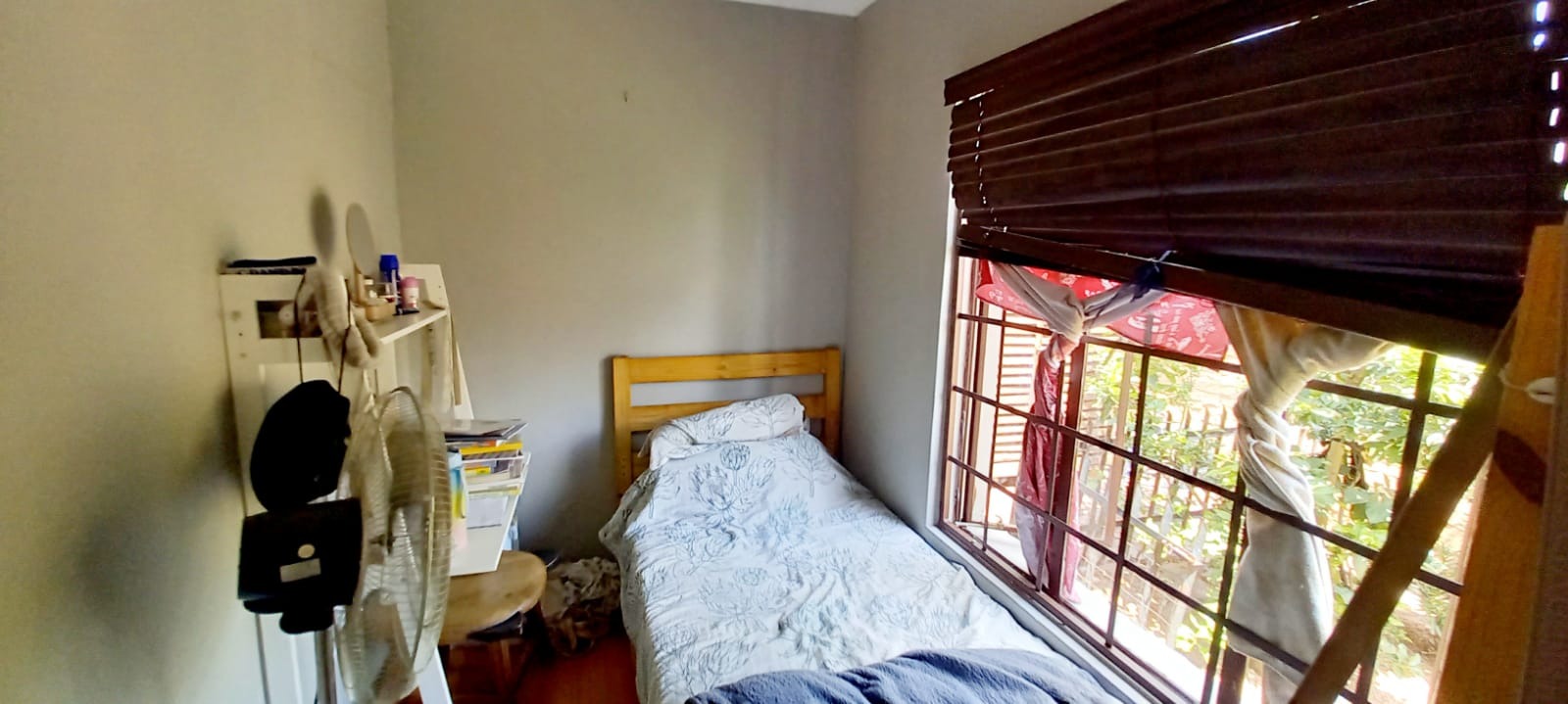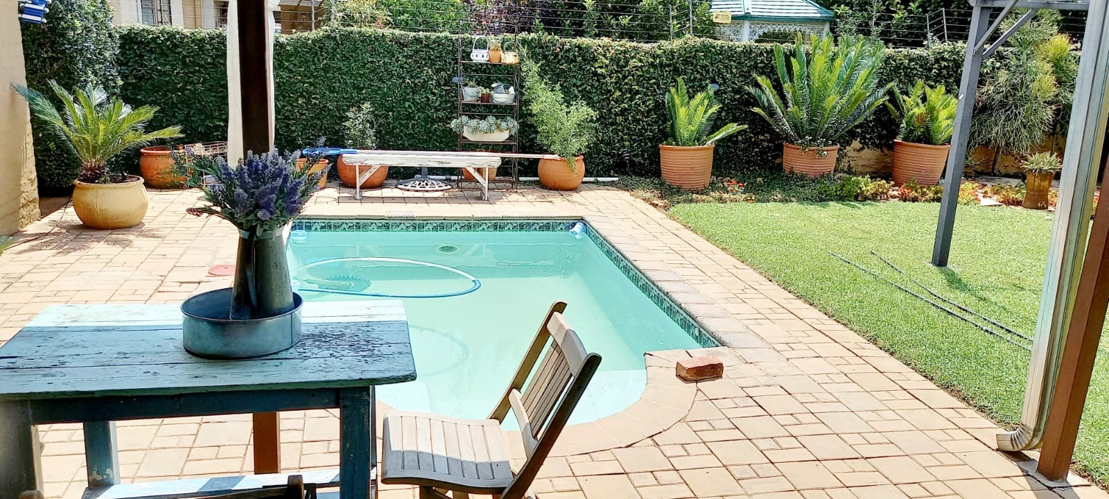Outside is a covered carport next to the original garage, open parking space for at least 4 vehicles and 2 Wendy Houses. One is currently used as a domestic worker room and the other as a toolshed.