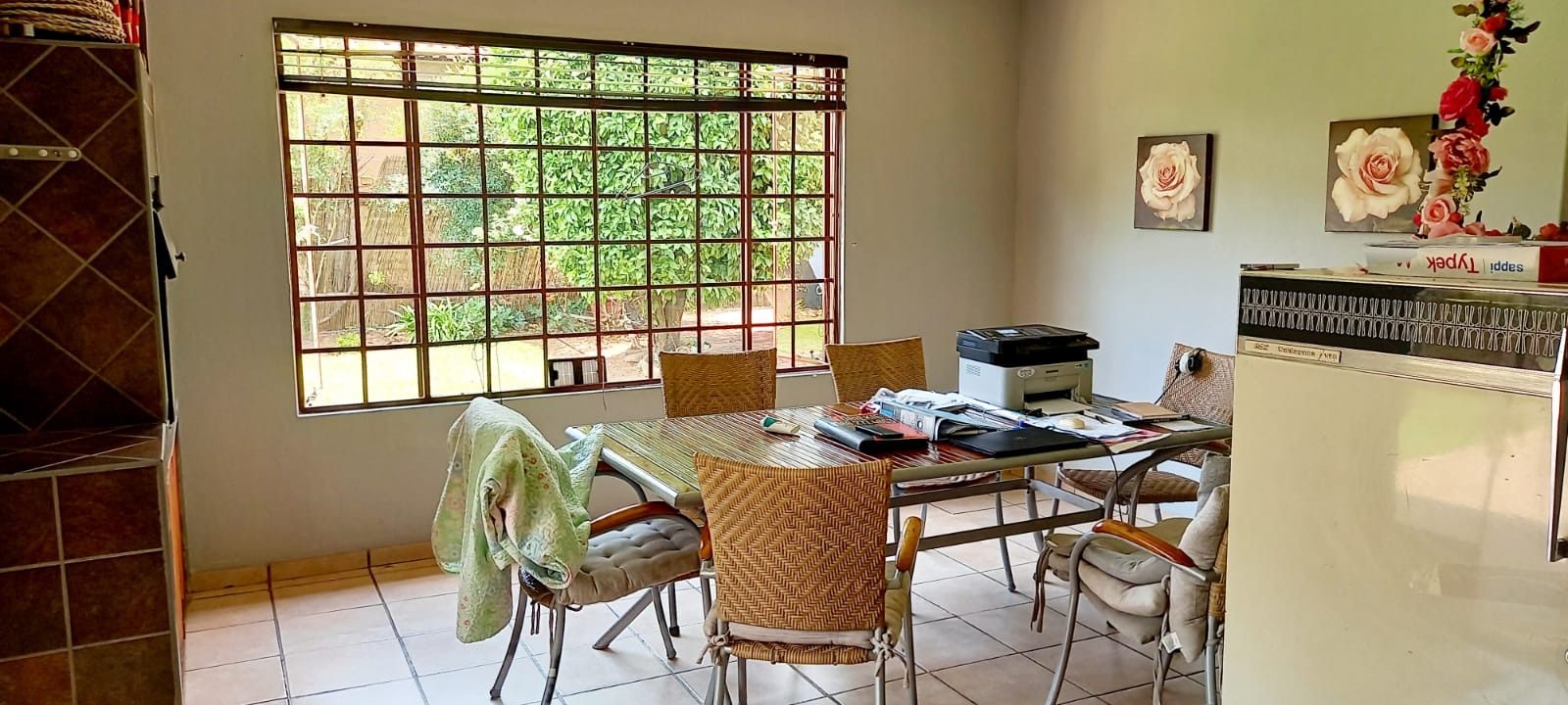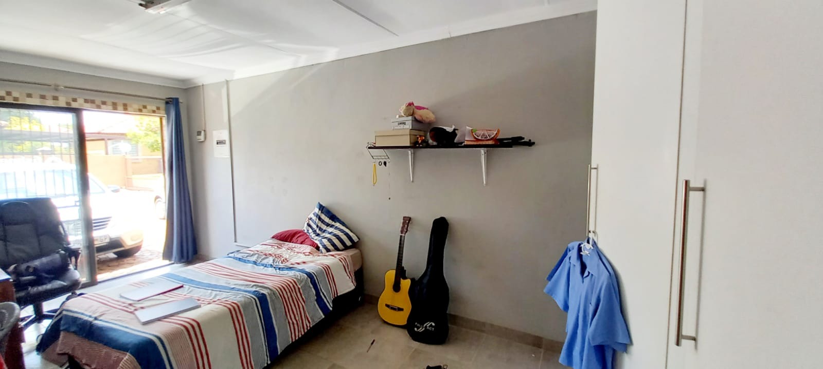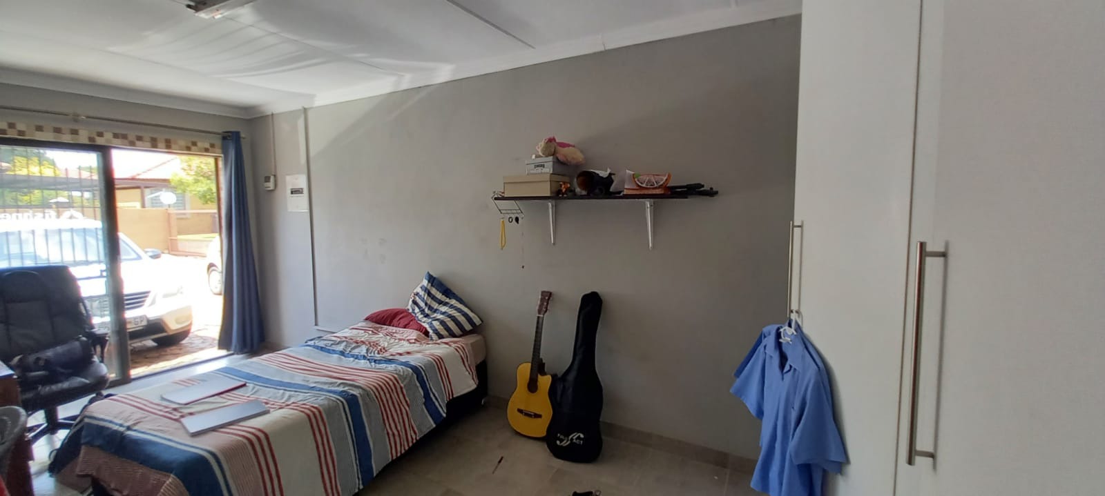 The single garage with inside door entry into the dining area was converted and incorporated into the house. It is currently a very spacious 4th bedroom with built-in cupboards. A glass sliding door ensures entry from outside. It can easily be used as an office or converted back into a garage.