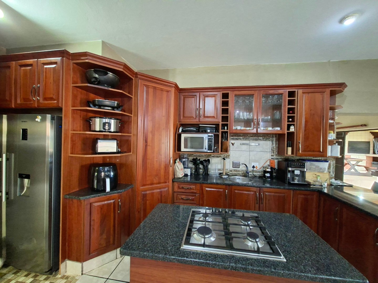 A modern open plan kitchen, gas stove, granite topsscullery with three unercounter appliances and a double door fridge, spacious pantry