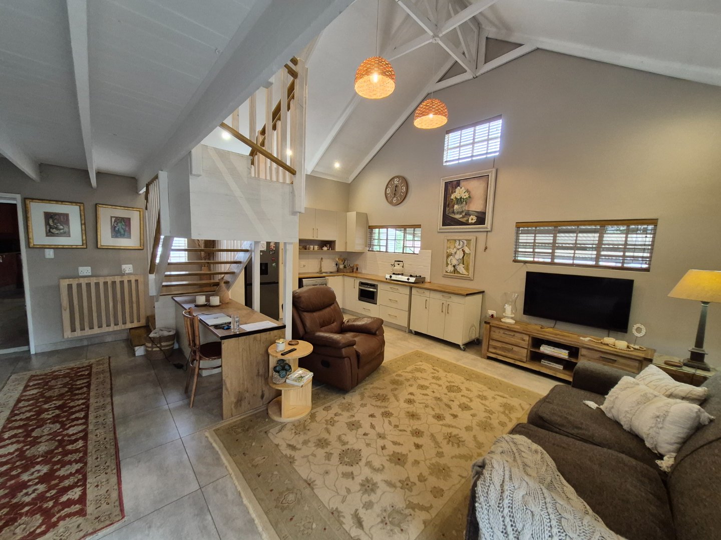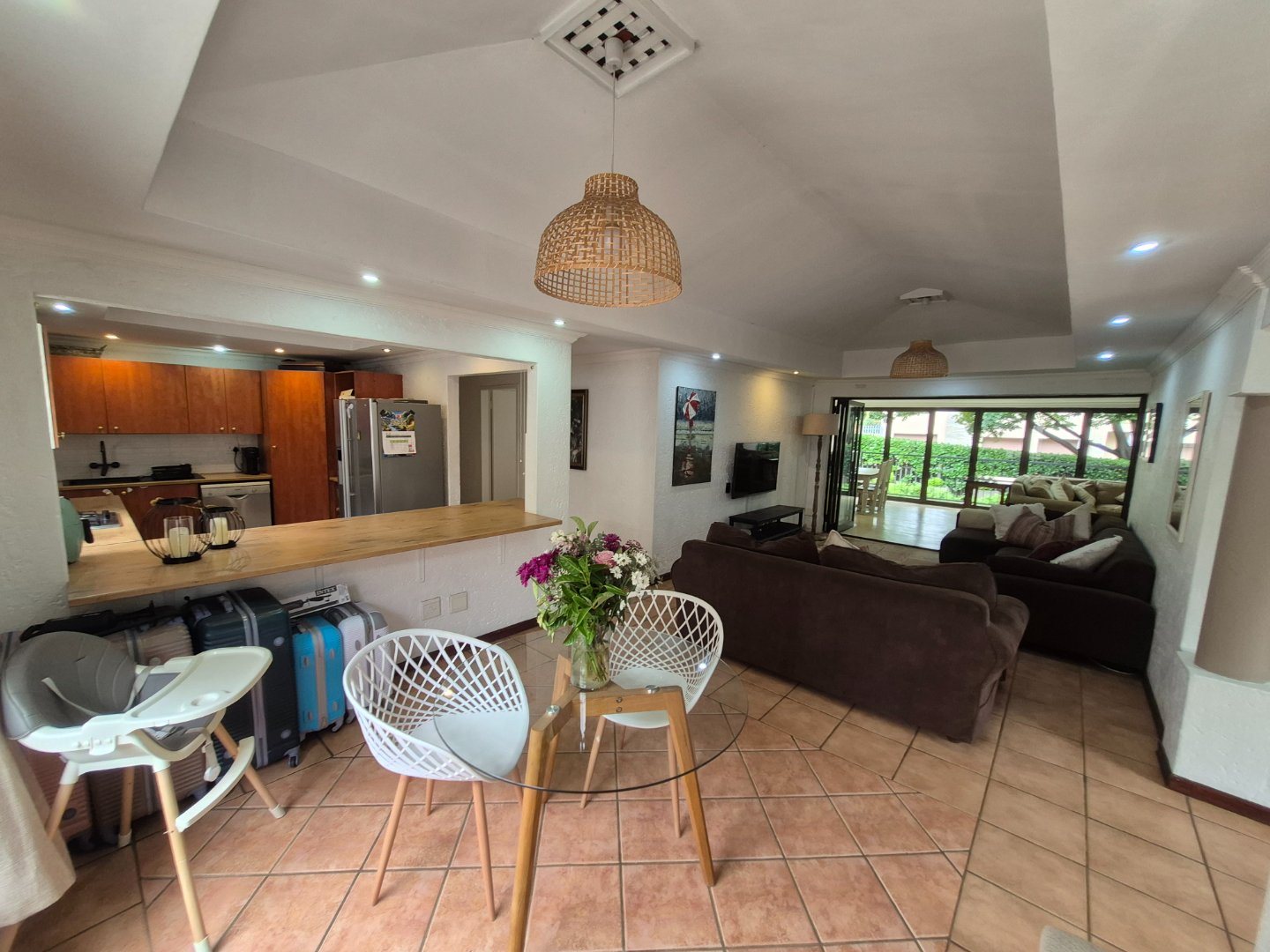 Bright lounge and dining areas opening onto an enclosed entertainment room with a built-in braai and doors that extend into the garden