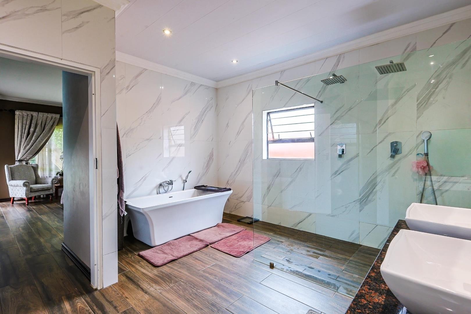 The bedroom wing is securely separated by a solid security gate, ensuring peace of mind. All four spacious bedrooms and two full bathrooms (of which one is en-suite) are positioned together, creating a private and safe retreat for the whole family. The master en-suite bedroom exudes comfort and style, offering generous space and a calm atmosphere for a restful night’s sleep. It includes ample built-in cupboards and a spacious bathroom fitted with modern, high-quality finishes.