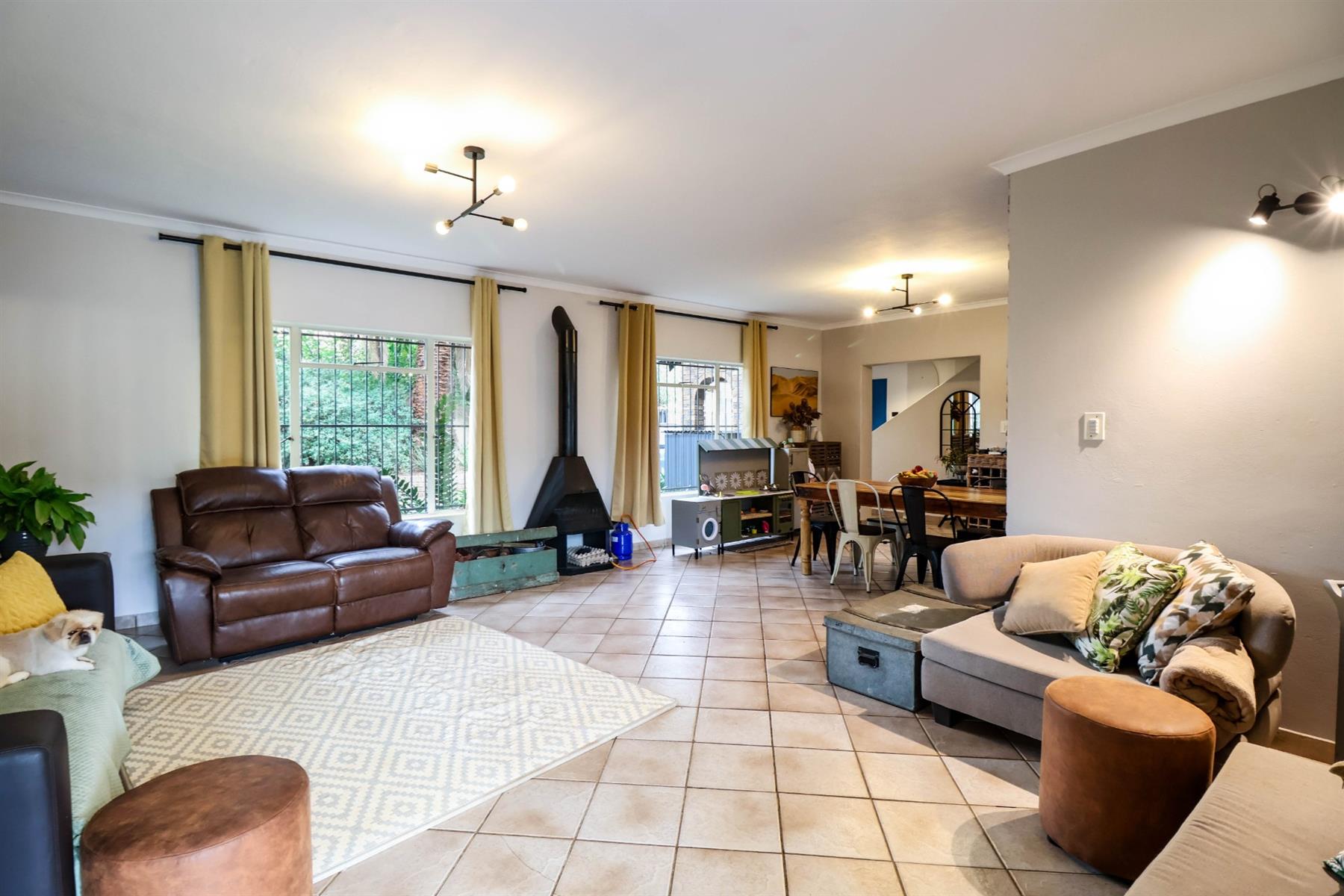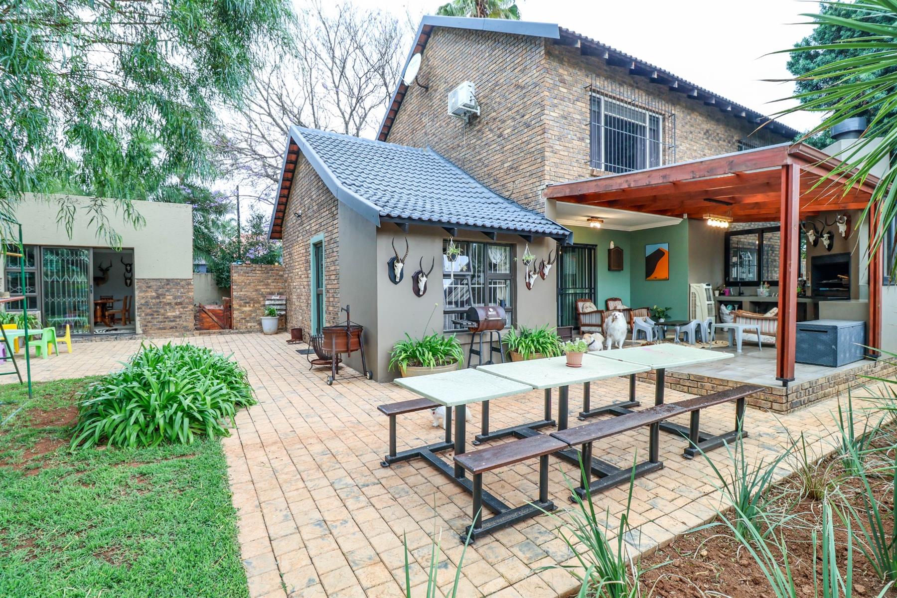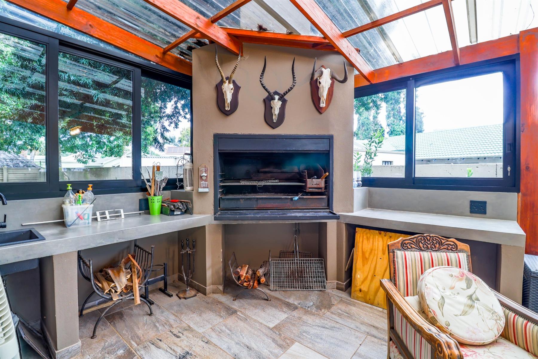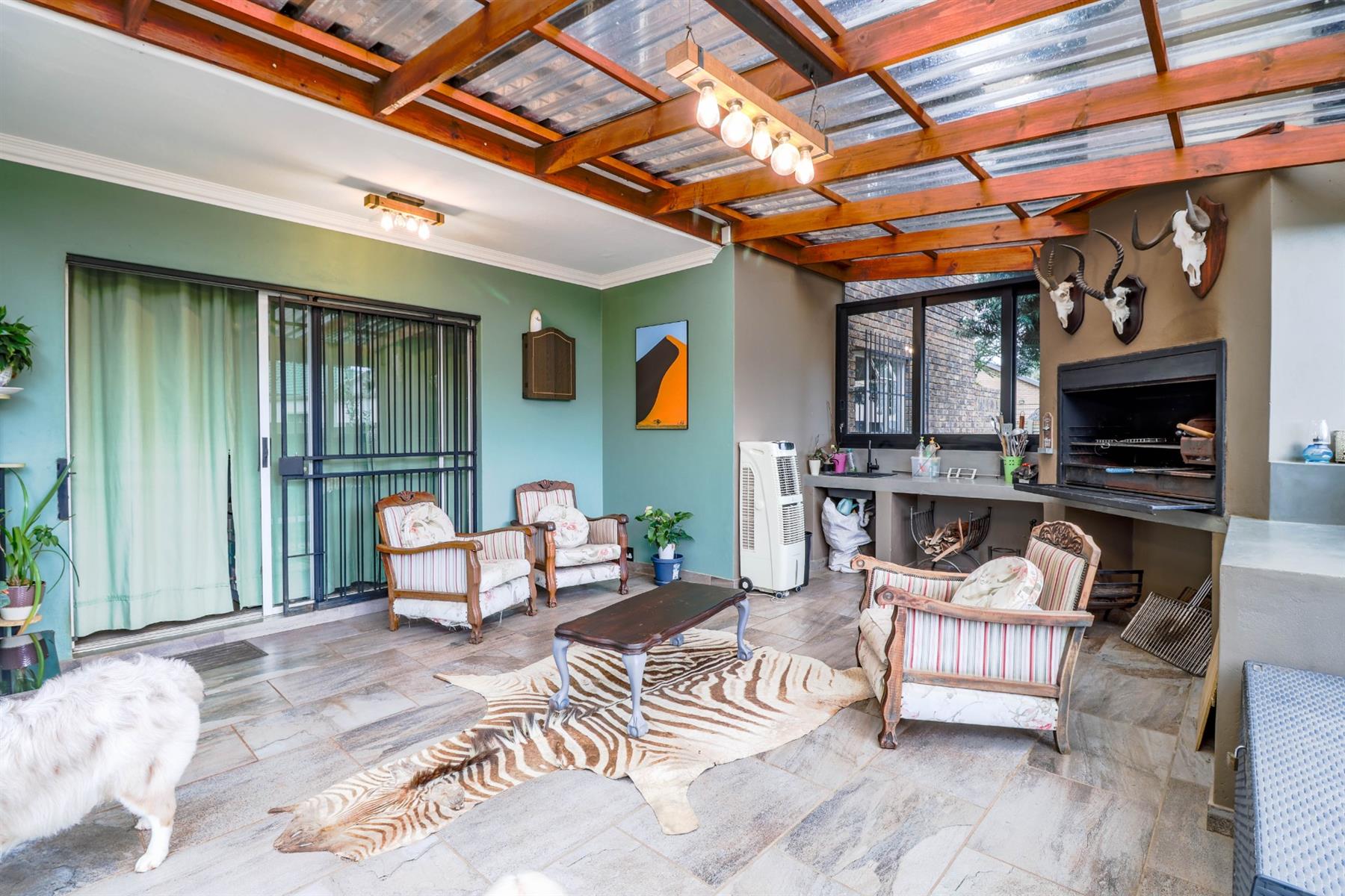 The heart of the home is an open-plan kitchen that flows seamlessly into the dining room and TV room, creating an ideal space for entertaining and family gatherings. The kitchen is equipped with a gas hob, ample built-in cupboards, and a pantry for all your storage needs. Enjoy cozy evenings by the fireplace in the TV room, or step out onto the patio for some fresh air.